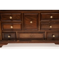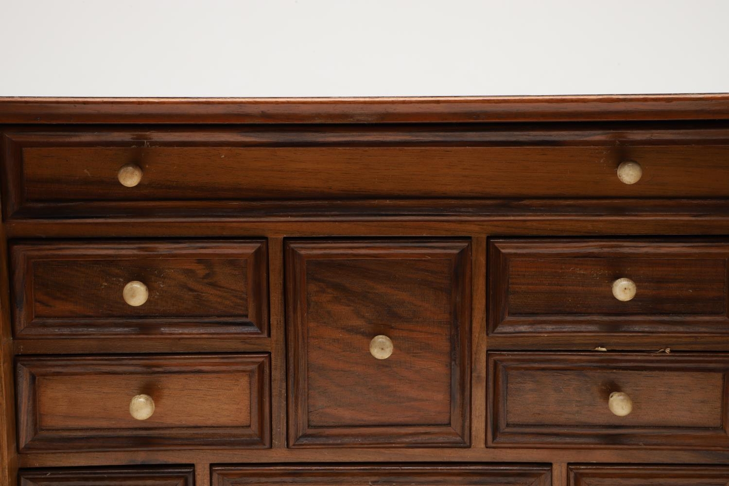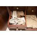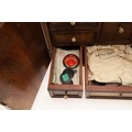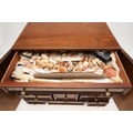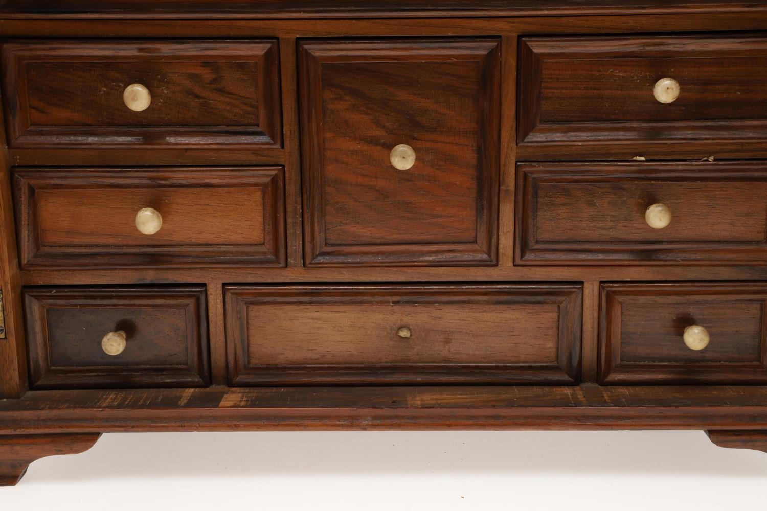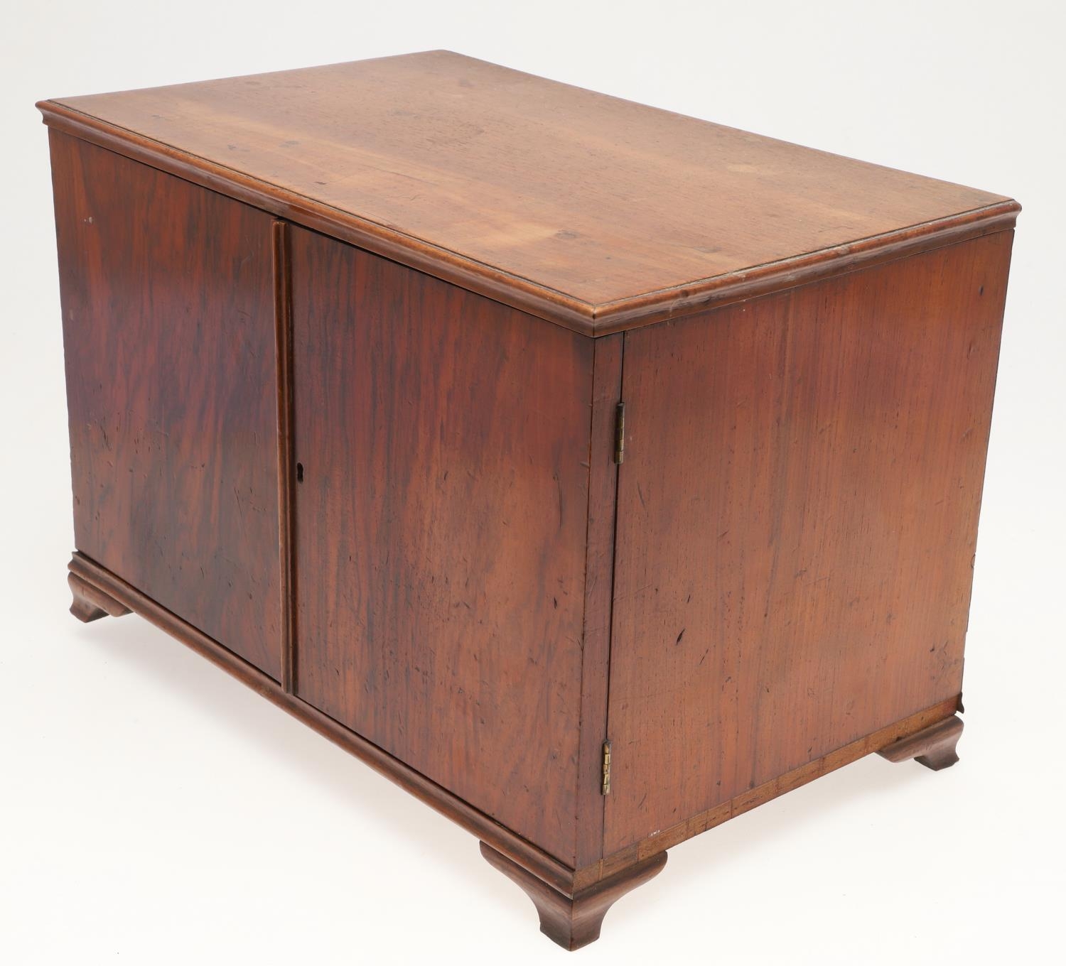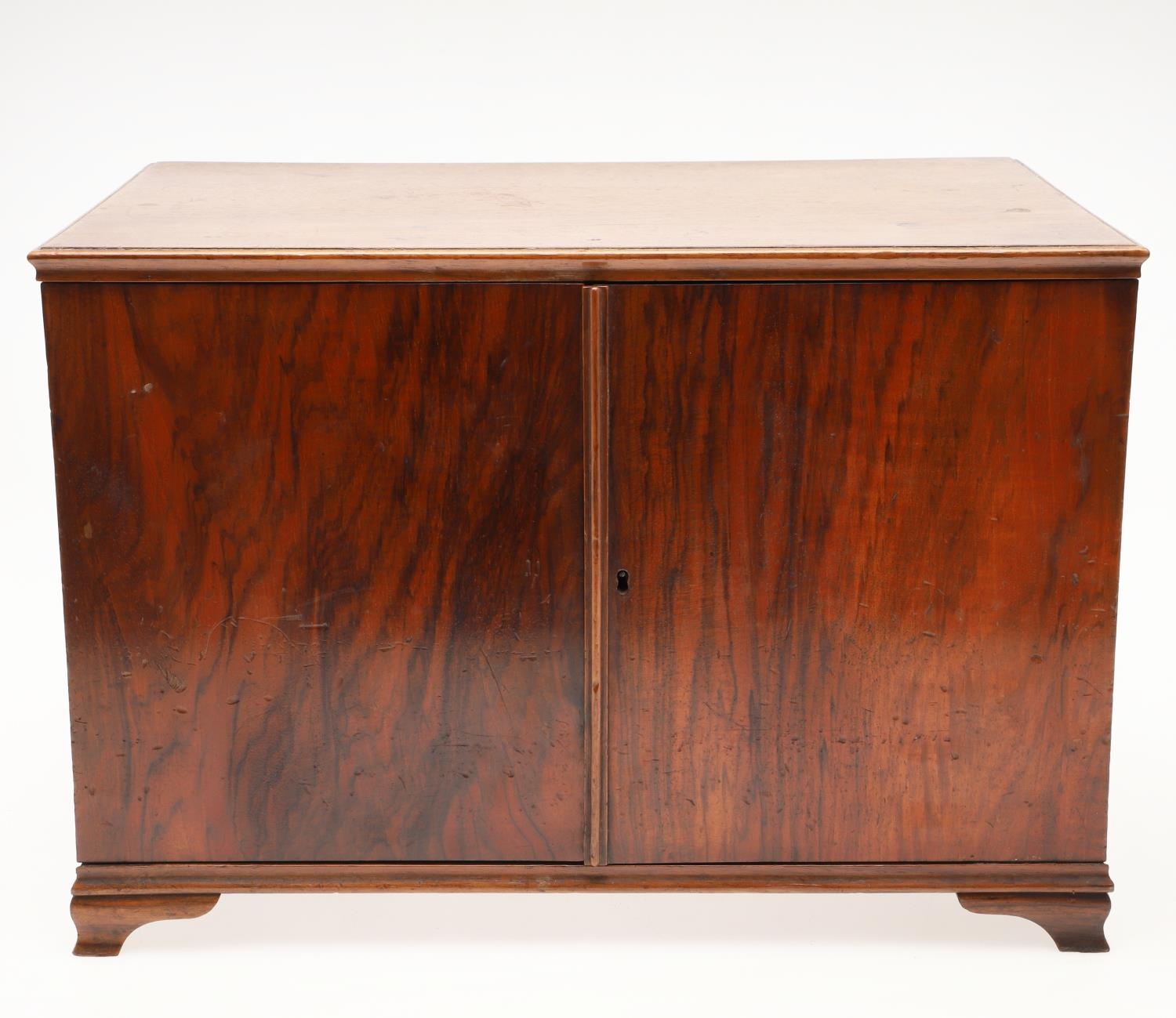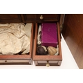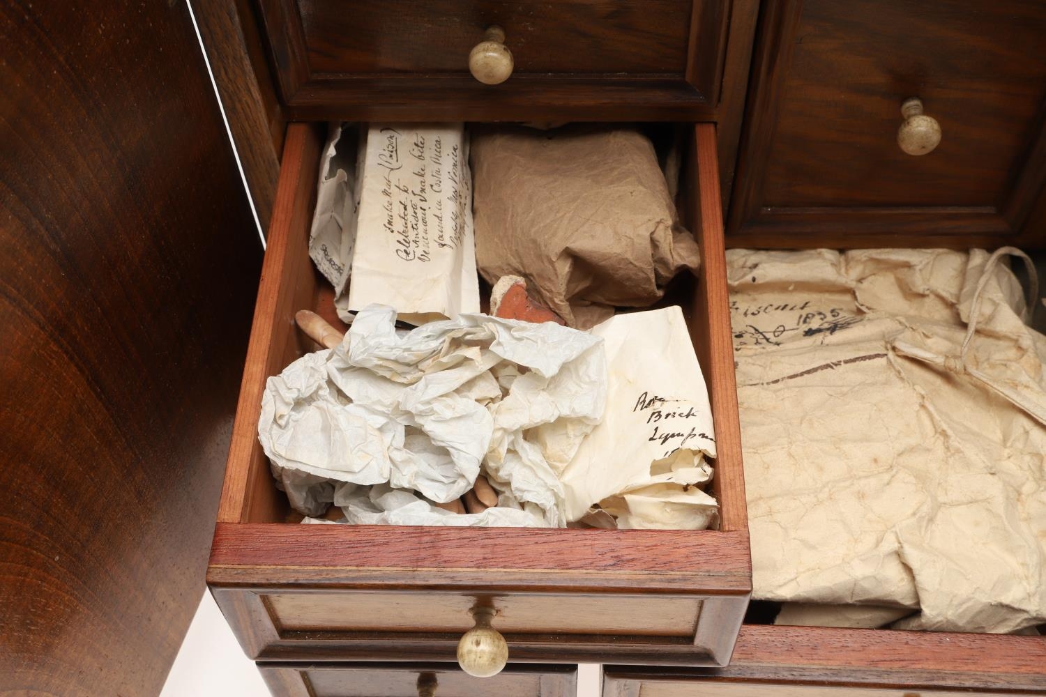 A 19TH CENTURY WALNUT TABLE TOP COLLECTOR'S CABINET. the doors with brass sliding locks enclosing nine drawers with turned bone handles, containing a variety of specimens and other objects, including tree seeds, vegetable ivory palm, lava, coral, shells, animal parts, alligator's egg, an iridescent beetle, fossils, wax seals in turned wood containers, pieces of Civil War (?) soldier's hardtack (with arrow impression), some items in hand-written paper scraps/envelopes, height 29cm, width 43cm, depth 27cm.