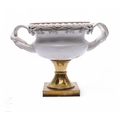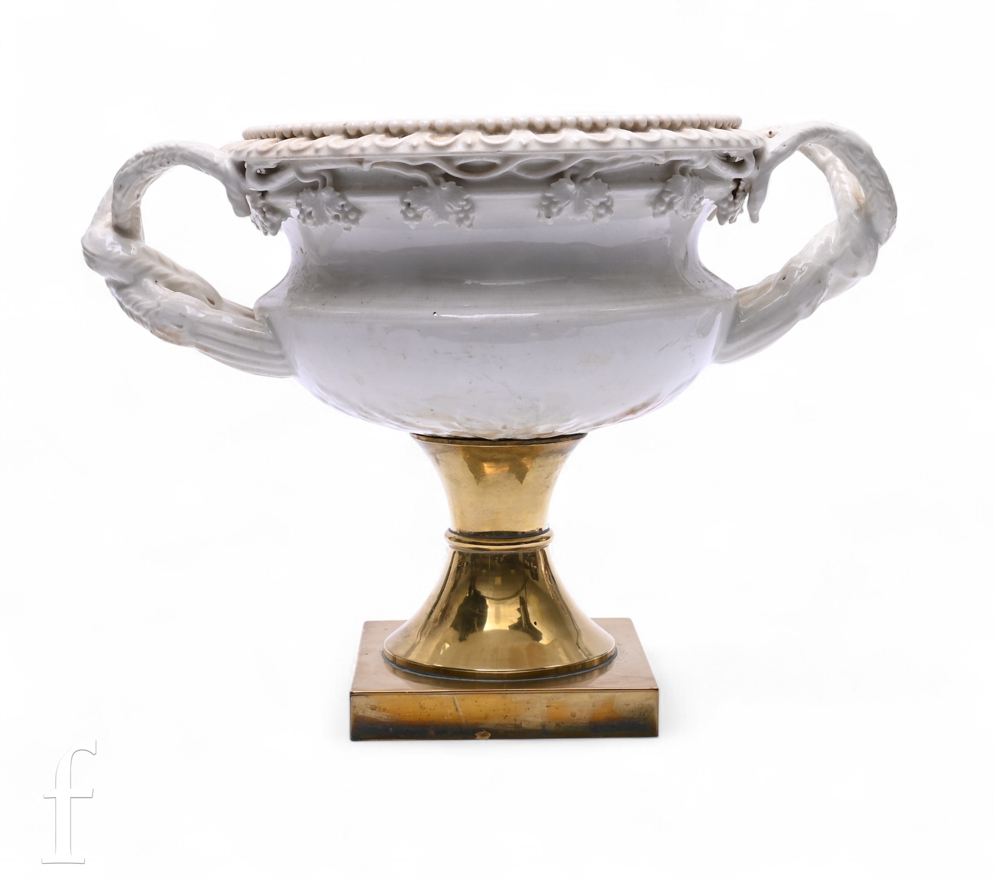 A 19th Century pedestal urn, the ceramic bowl modelled in the style of the Warwick vase, with naturalistic entwined handles, beaded and arcaded rim and fruiting vine collar, knopped inswept brass stem and square base, height 26.5cm.