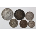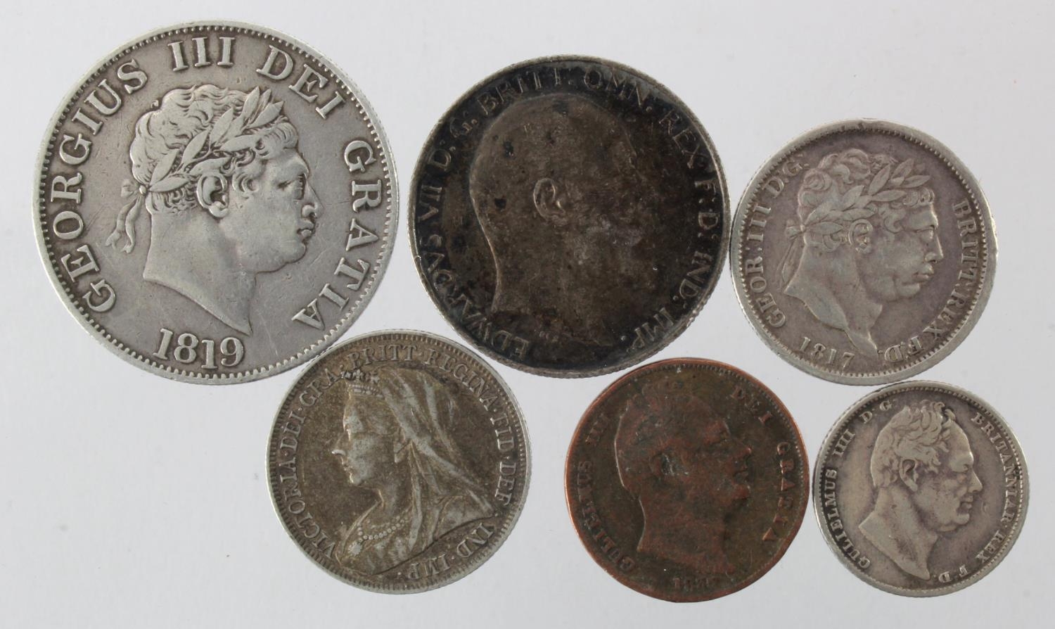GB Milled (6) mostly silver: Halfcrown 1819 F/GF, Florin 1907 toned VF, Shilling 1817 GF, Shilling 1901 VF, Sixpence 1831 Fine, and Farthing 1835 Fair.