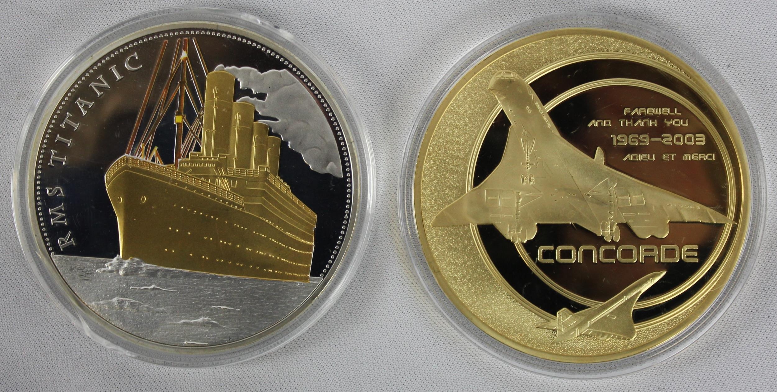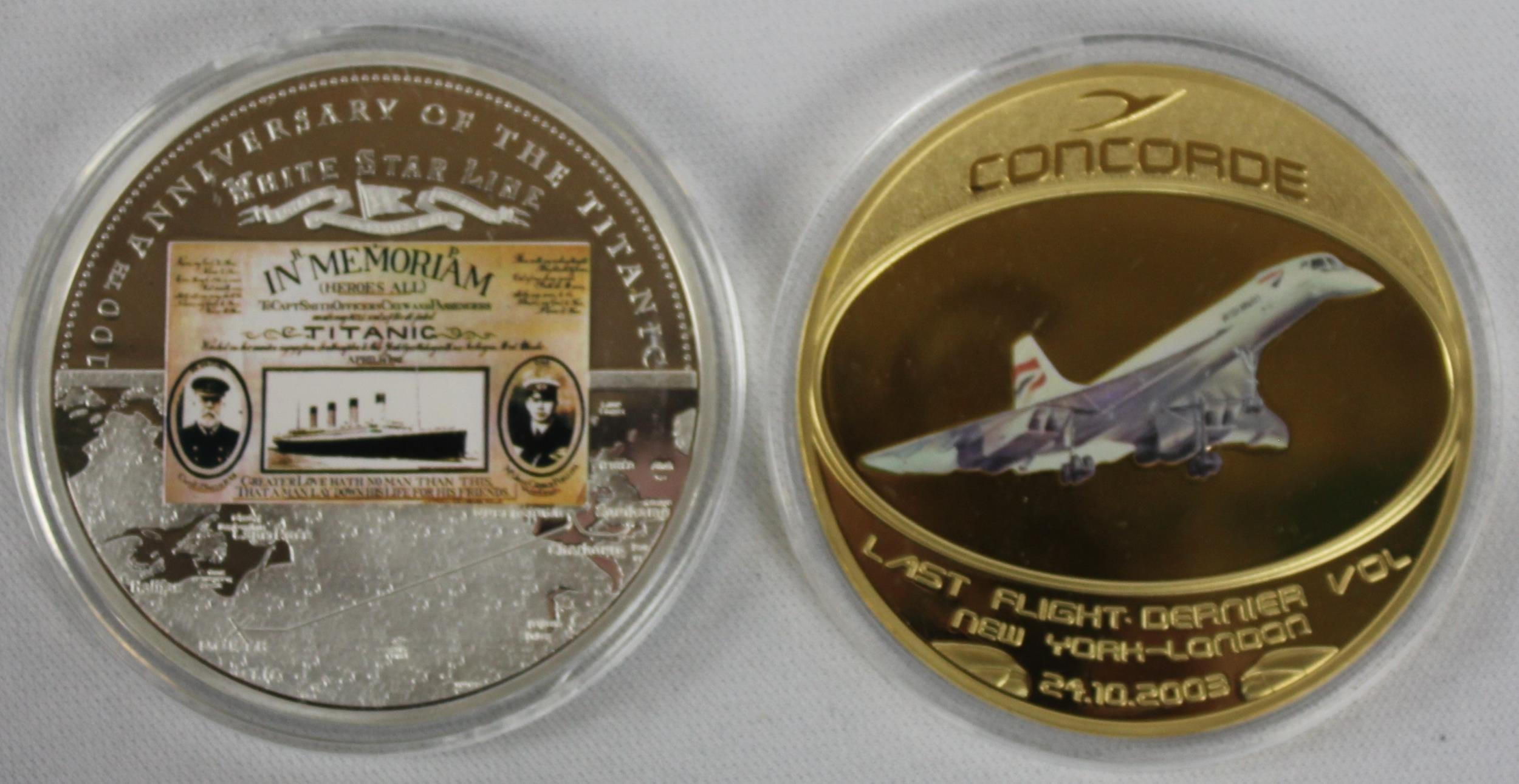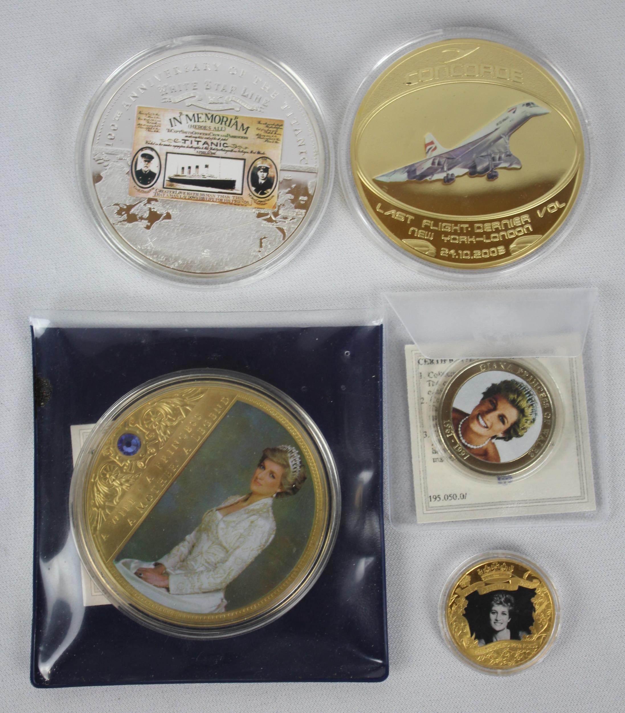 5 COMEMMORATIVE COINS: 100th ANNIVERSARY OF THE TITANIC WHITE STAR LINE, CONCORD 'LAST FLIGHT DERNIER VOL NEW YORK-LONDON 24-.10.2003, PORTRAITS OF A PRINCESS 'DIANA A WIFE, A PRINCESS, A MOTHER, A LEGEND' (WITH CERTIFICATE), DIANA PRINCESS OF WALES 1961-1997 & 2021 GIBRALTAR HALF CROWN 'PEOPLE'S PRINCESS'