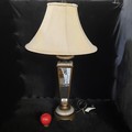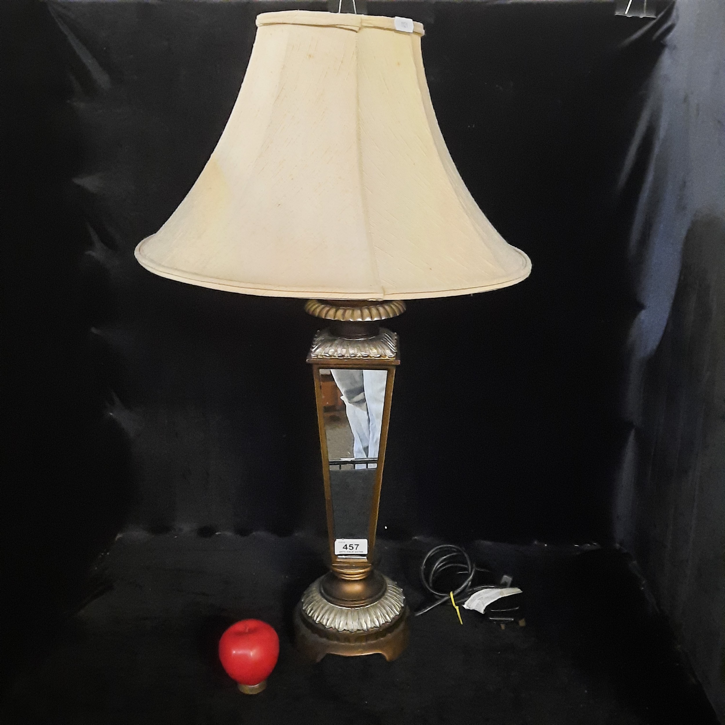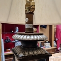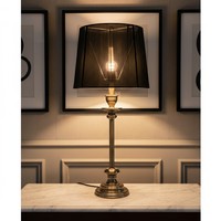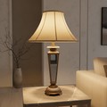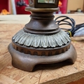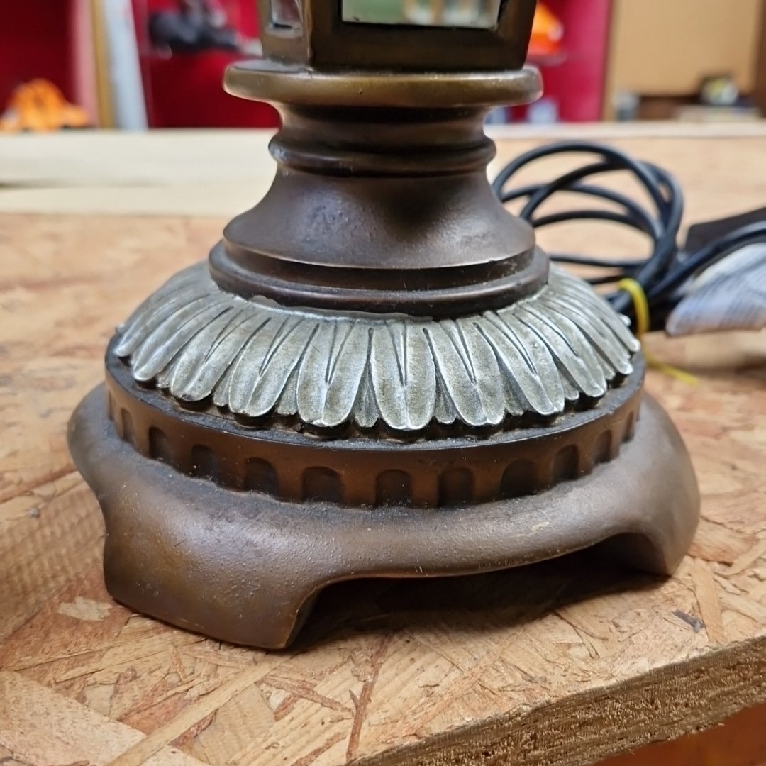 A large cast-metal table lamp in the form of a glazed lantern, with fluted galleries and an ecru bell-shaped shade, fitted for a 220–240V bulb (max 100W).