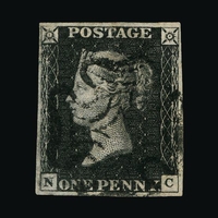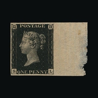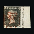Great Britain - QV (line engraved) : (SG 3) 1840 1d grey-black, plate 1a, IL, 4 margins (very close at left) with full sheet margin at right and inscription ' e the Labels ABOVE th ', full crisp red MC, fine used. (image available) [US1]
