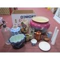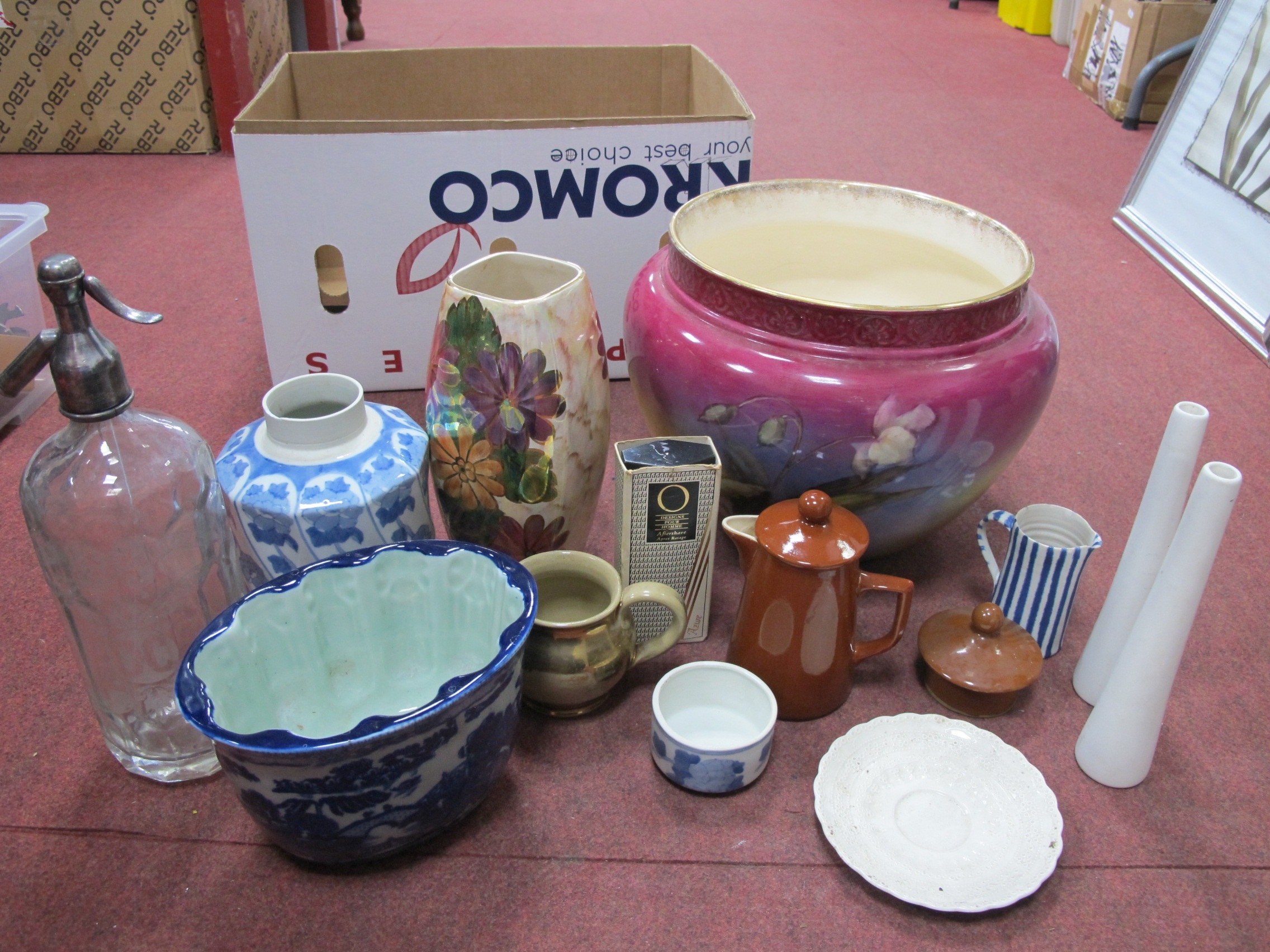 Early XX century porcelain jardeniere, decorated with floral decoration, cantrell cothrane, soda syphon, blue and white pie mould etc. 1 Box