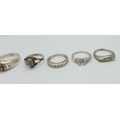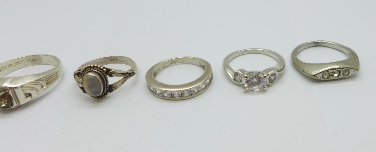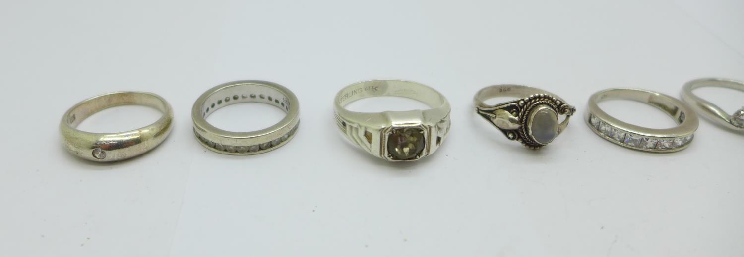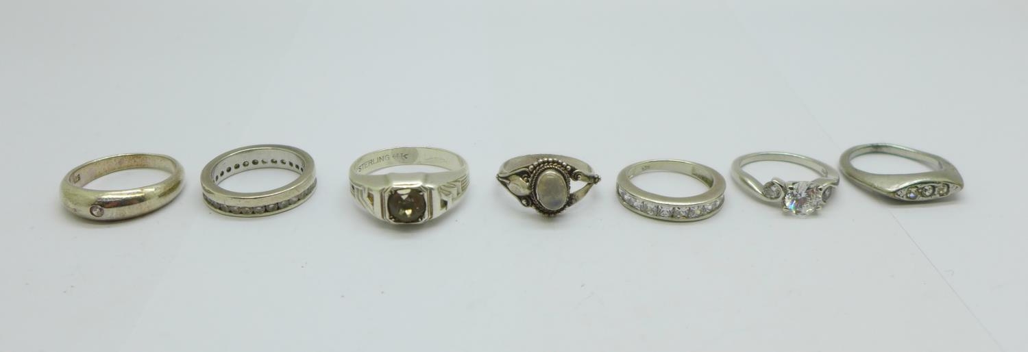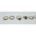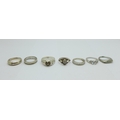 Six silver rings and one other ring
