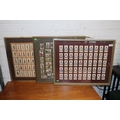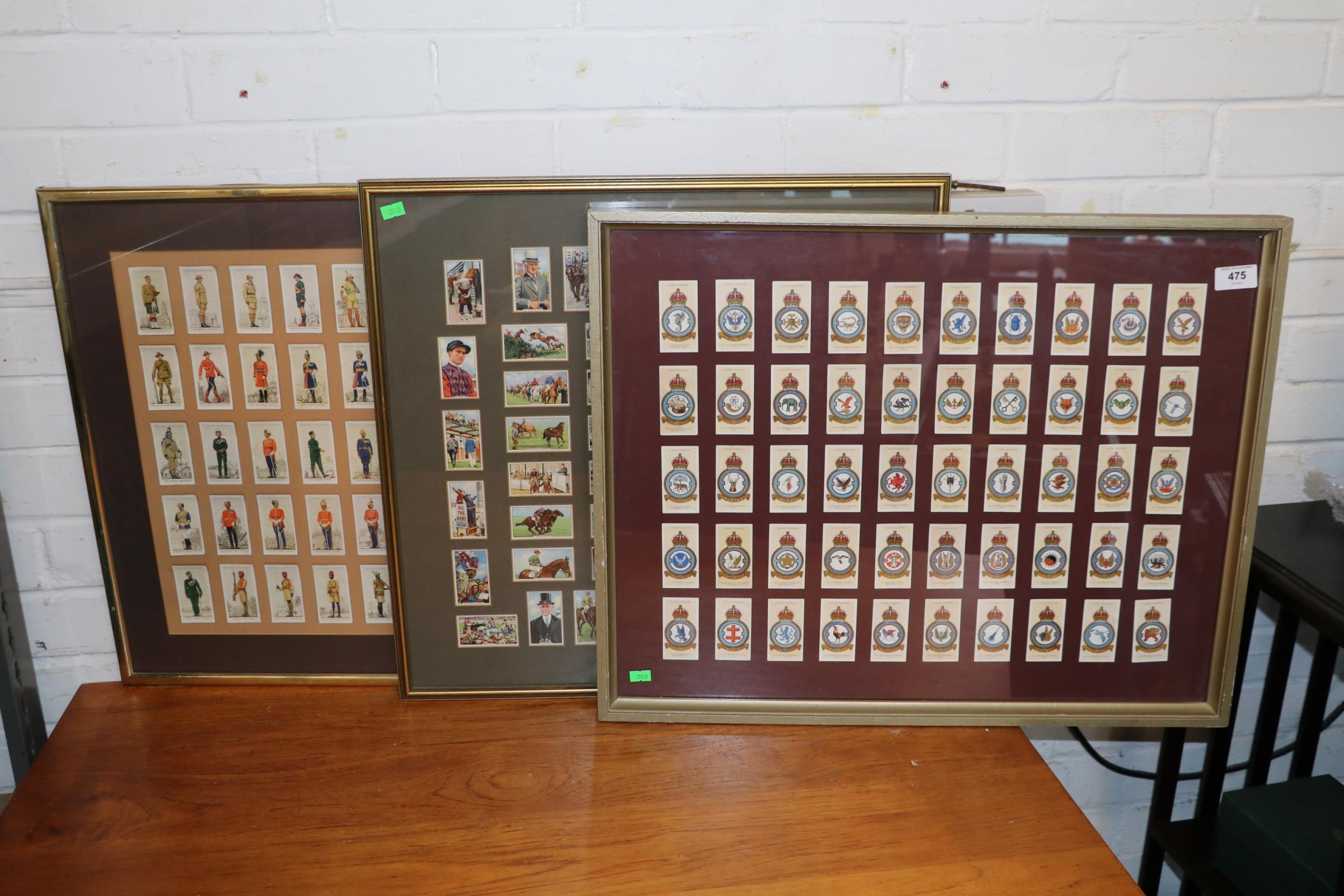 Framed set of players cigarette cards together with Horse racing interest framed cigarette cards and players uniforms framed similar