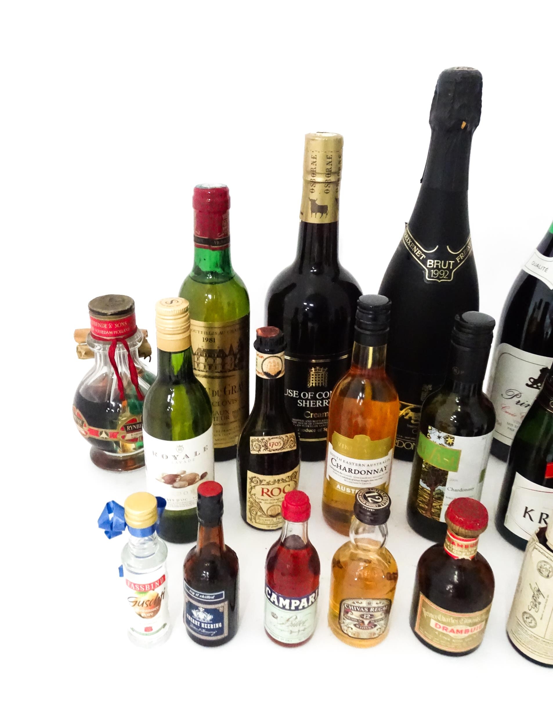 A quantity of assorted alcohol and miniatures, to include a 70cl bottle of House of Commons sherry, a 75cl bottle of Prince Georges Cuvee Cachere Moise Taiet (Cassan) red wine, two 220ml bottles of Kriter brut Blanc de Blancs, a Rynbende sectional liqueur flask and a 50ml bottle of Chivas Regal whisky etc (24)