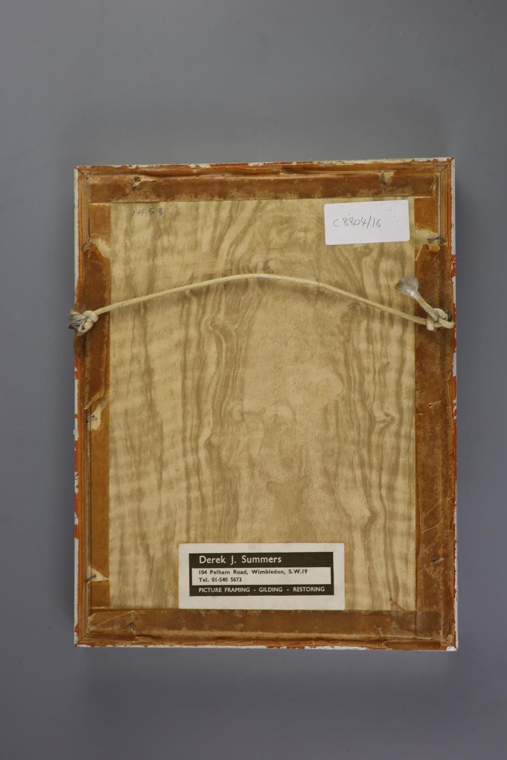 Honest untouched condition, may benefit from a clean but no real faults noted, lightly signed lower right, set in a floating mount with brown card background in a glazed silvered wood frame which is a little scuffed, framers label for Derek J. Summers