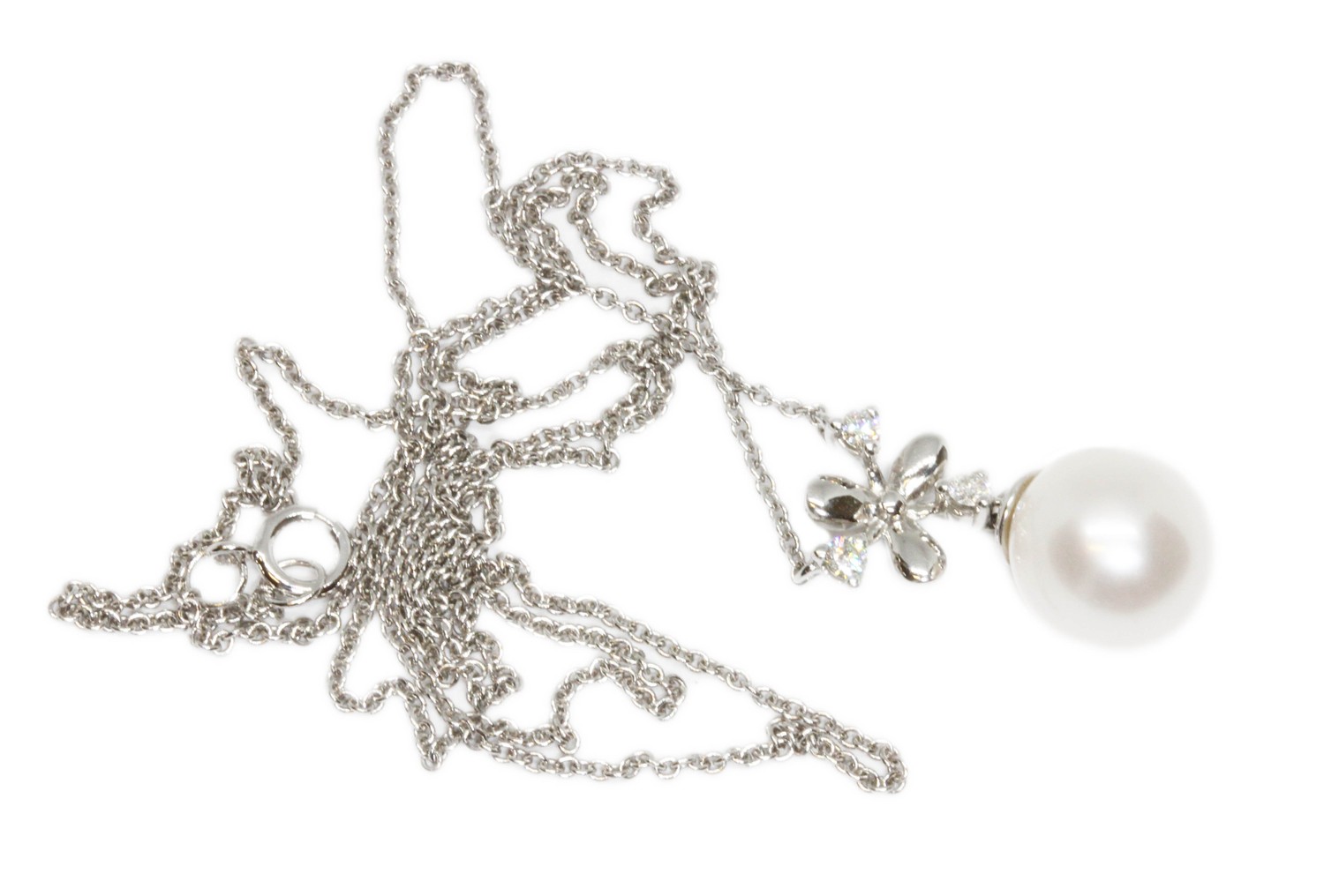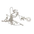 A diamond and cultured pearl drop pendant necklace, marked 375, length 18mm, on 44cm chain, gross weight 3.2g.
