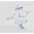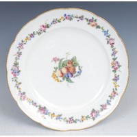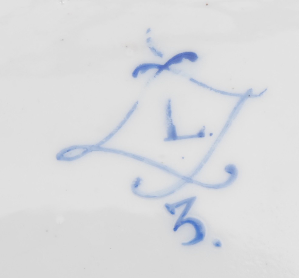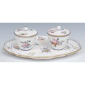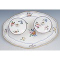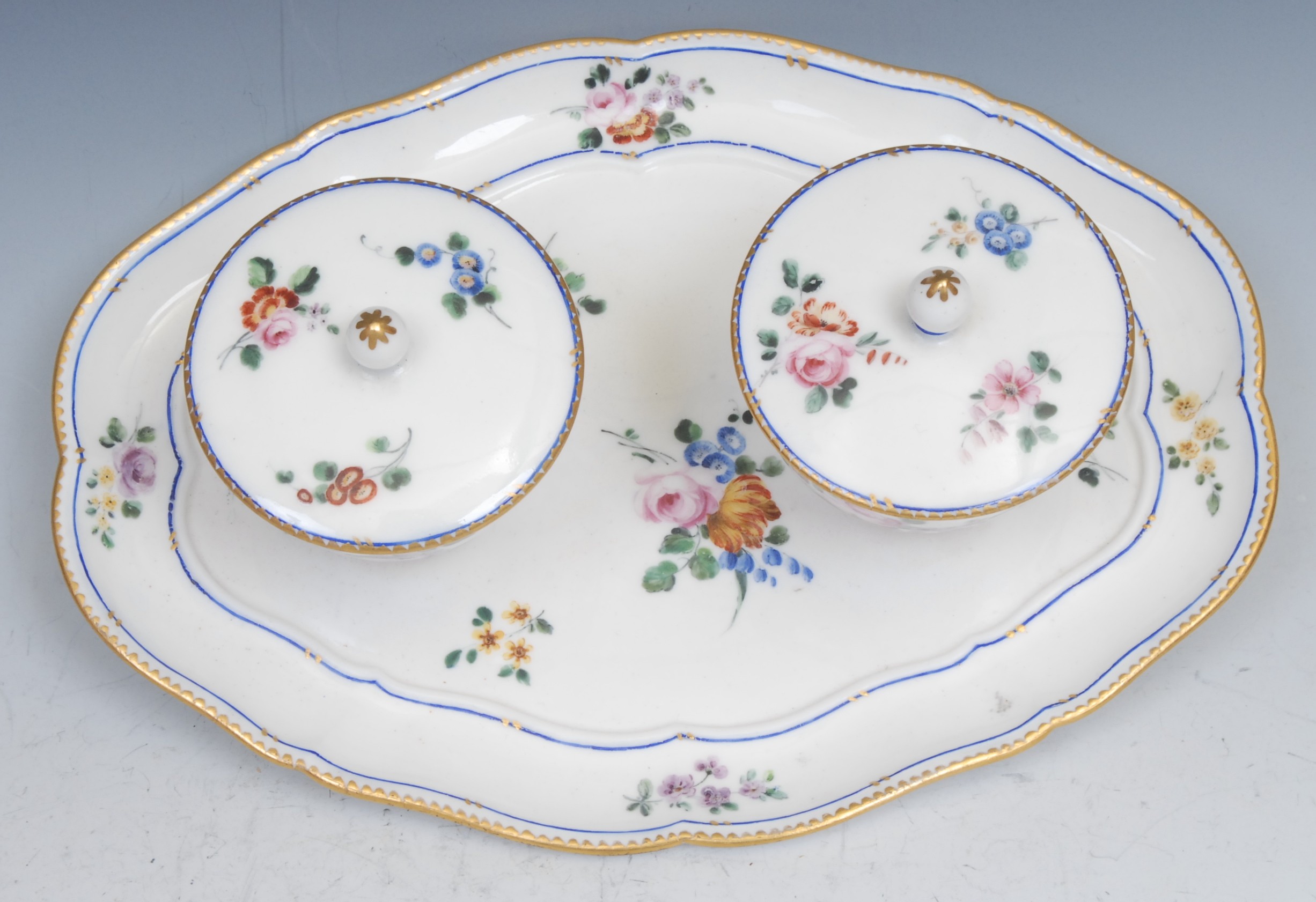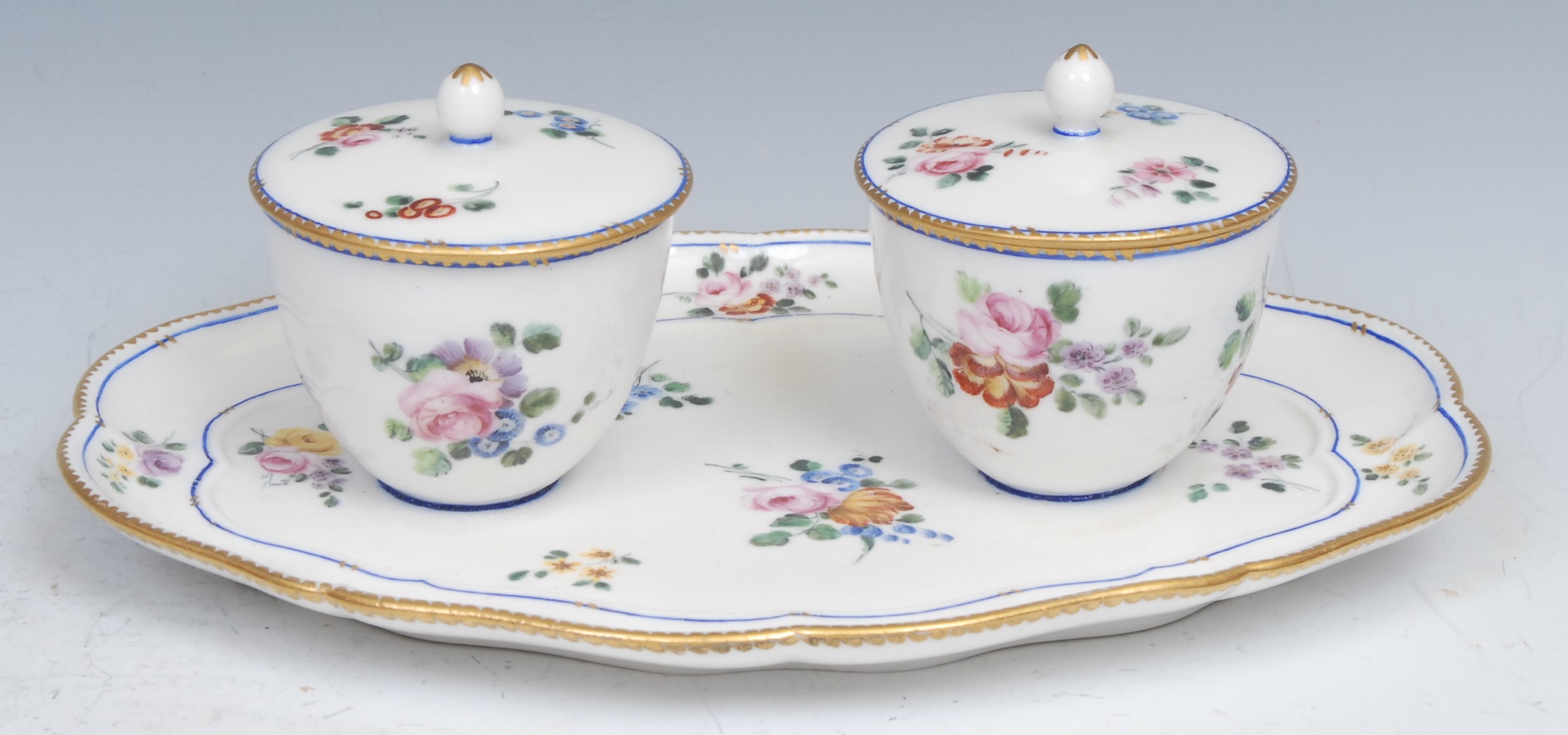 A Sevres double plateau a deux pots de confitures, painted with colourful flowers under blue line borders, gilt dentil rim, 24.5cm wide, entwined L's mark and numeral 3