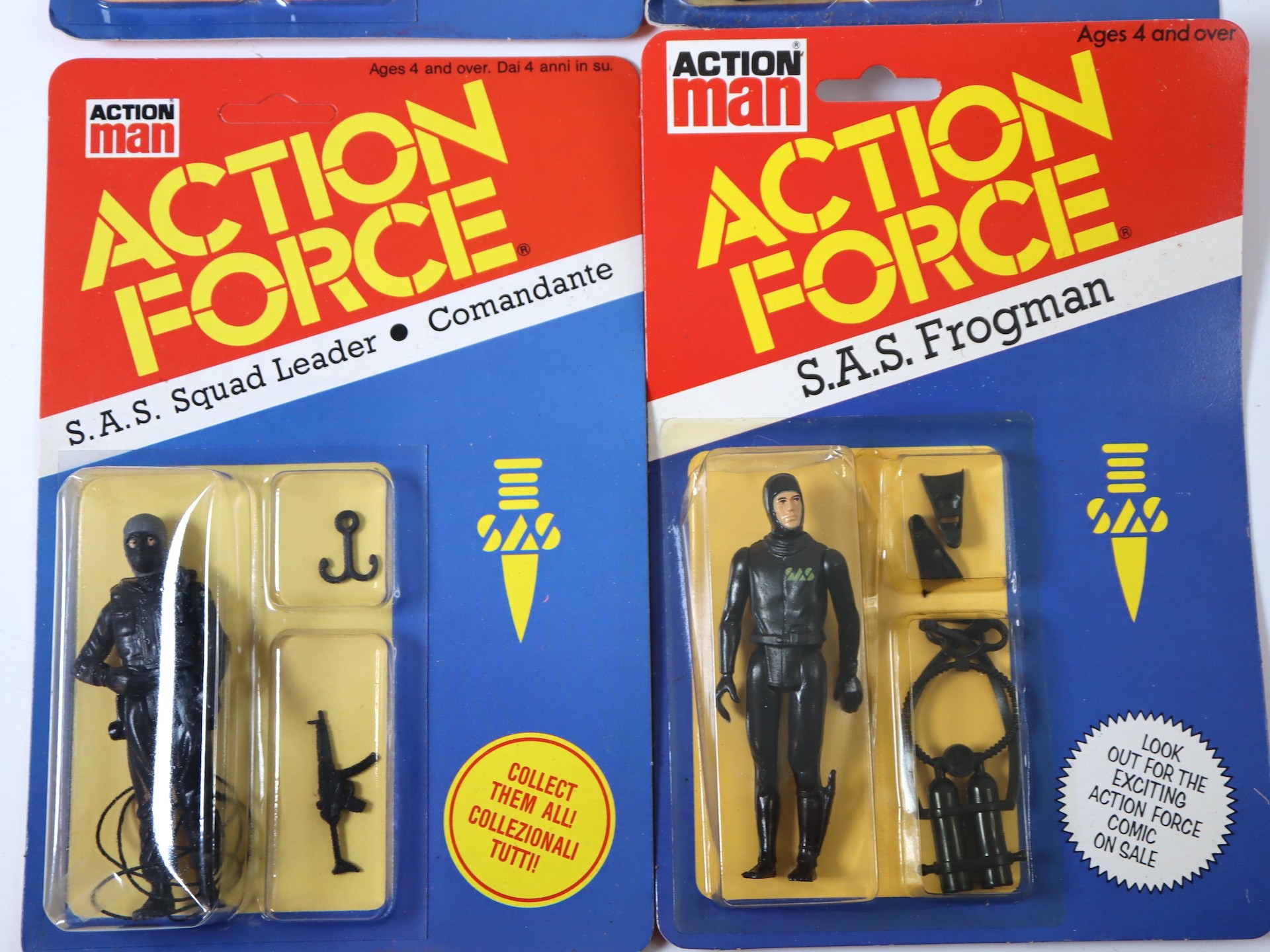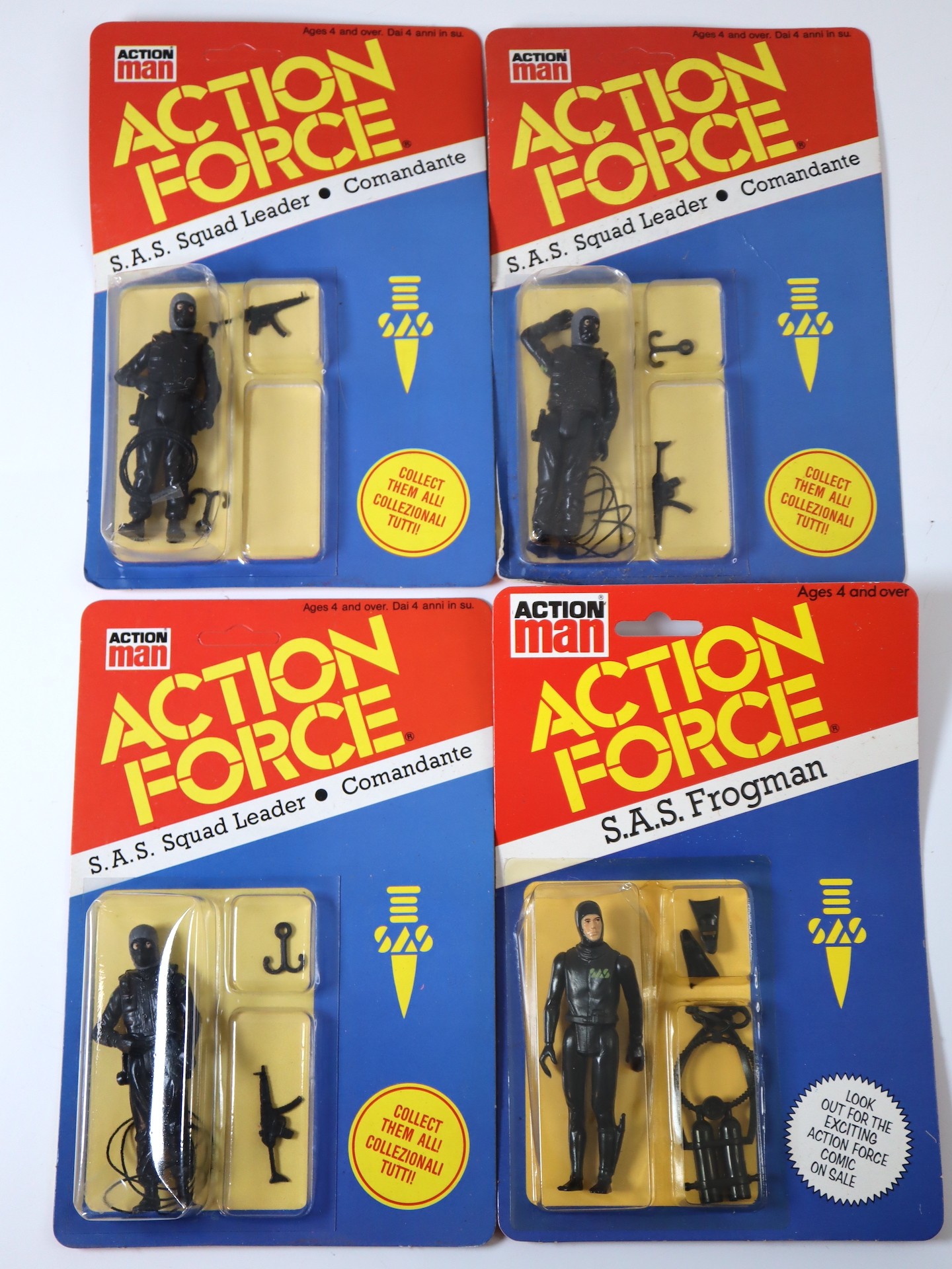 4 x 1980's Action Man Action Force Carded Action Figures - S.A.S Frogman, S.A.S Squad Leader (3), - Sealed 1980's Palitoy