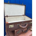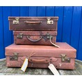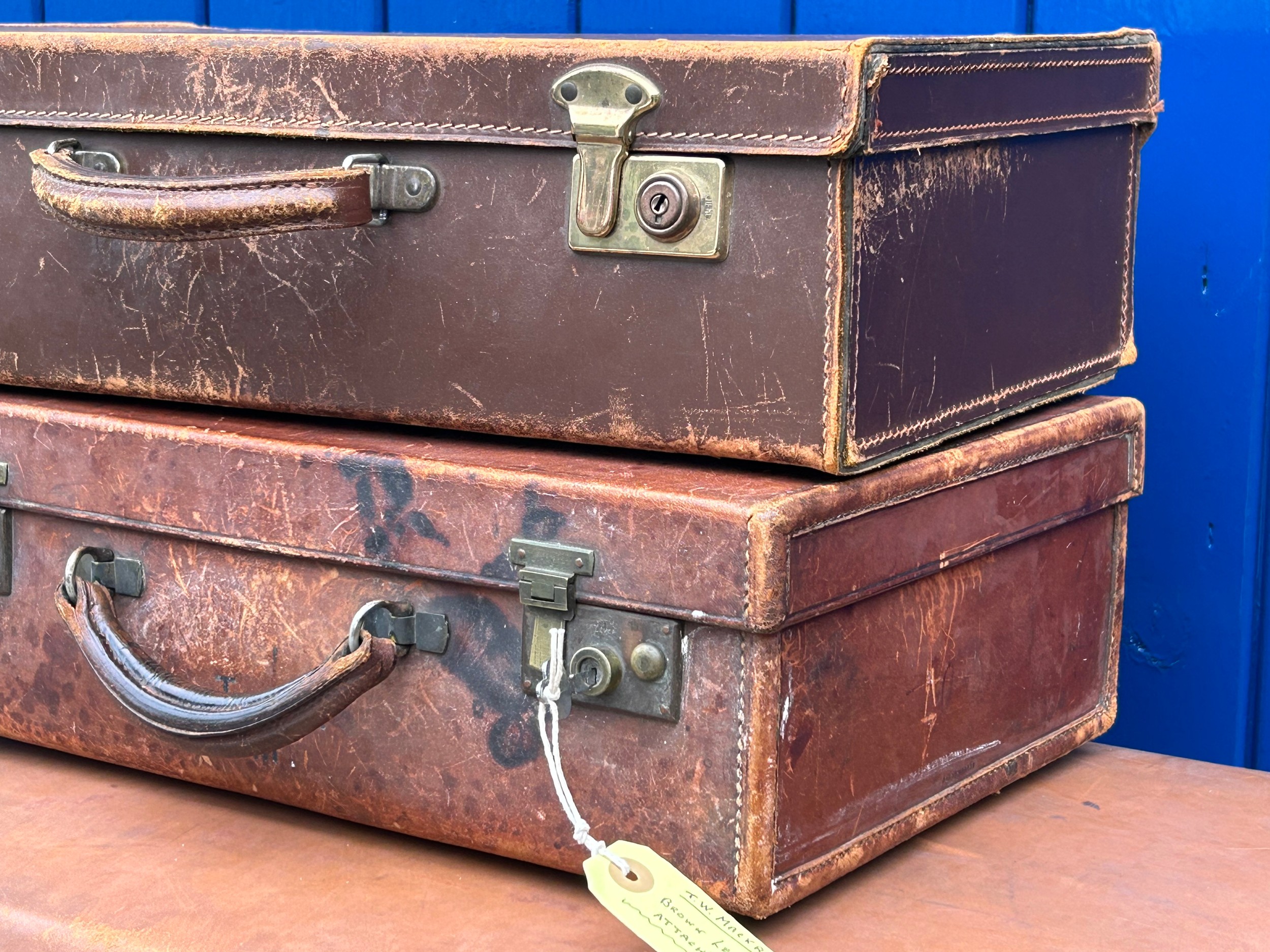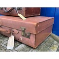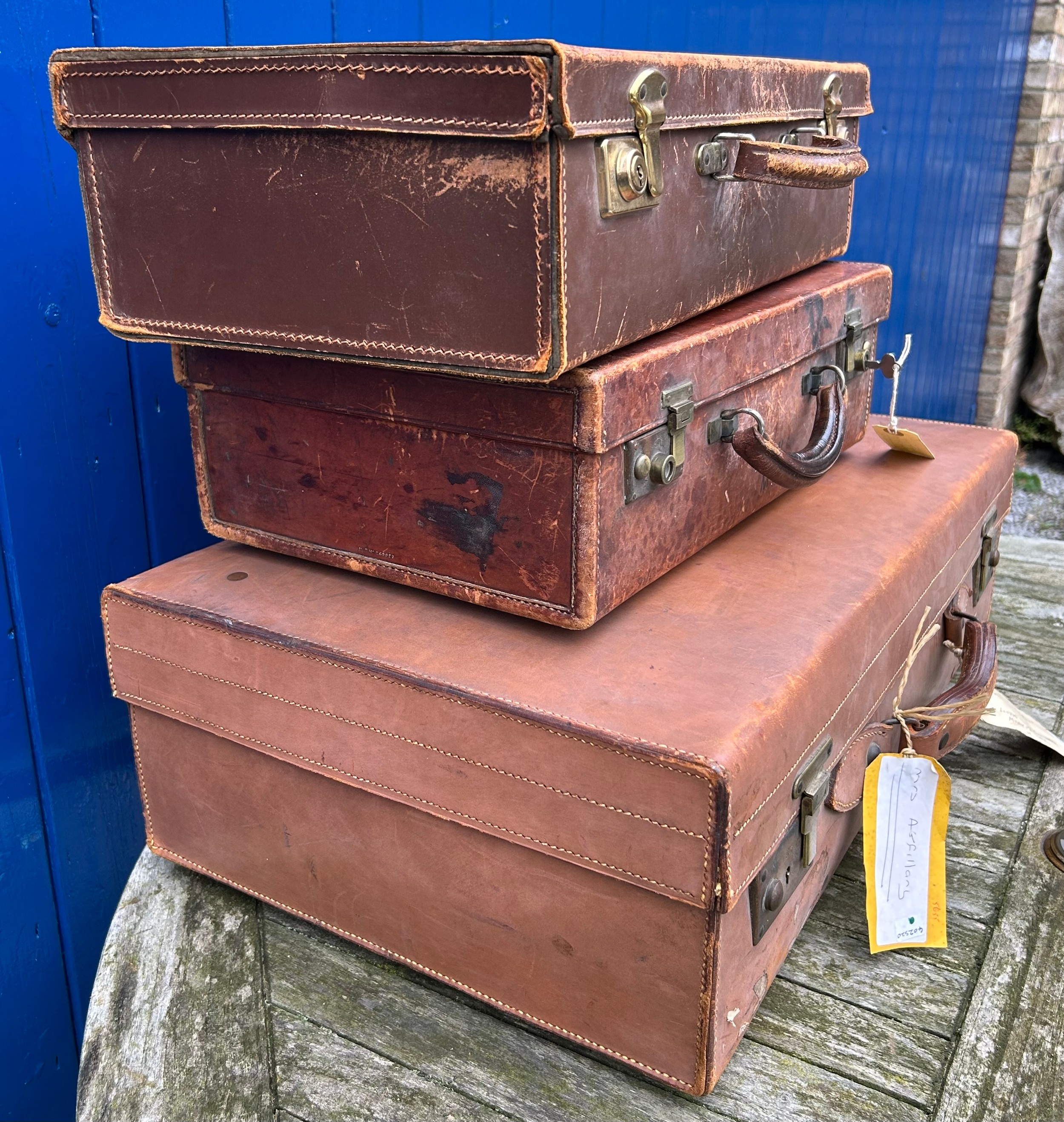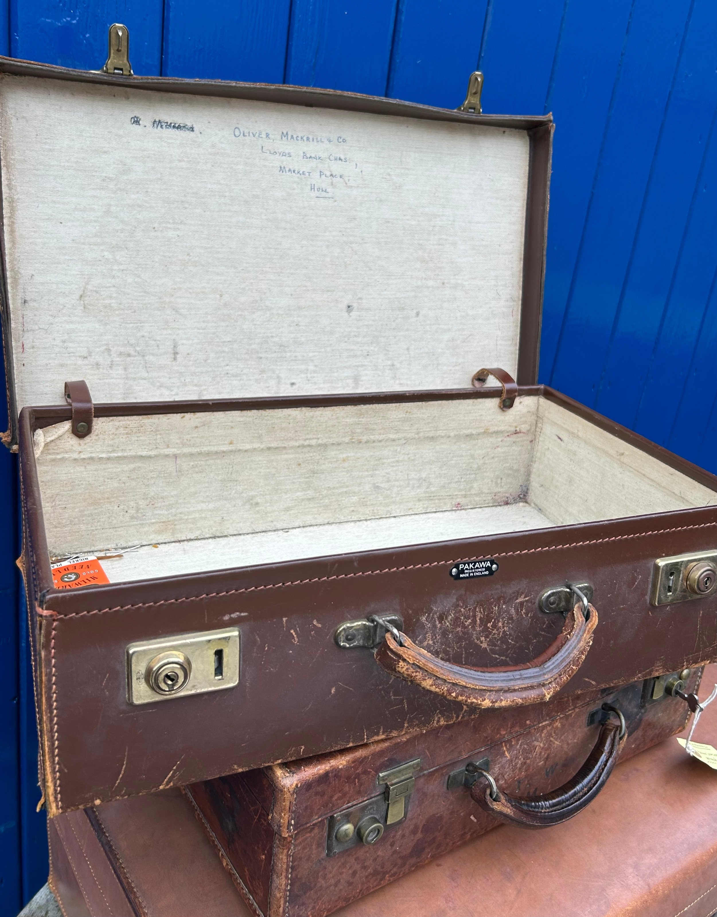 Three vintage leather suitcases. Largest 61 x 37 x 18 cm. Smallest by Pakawa 45 x 26 x 13cm.