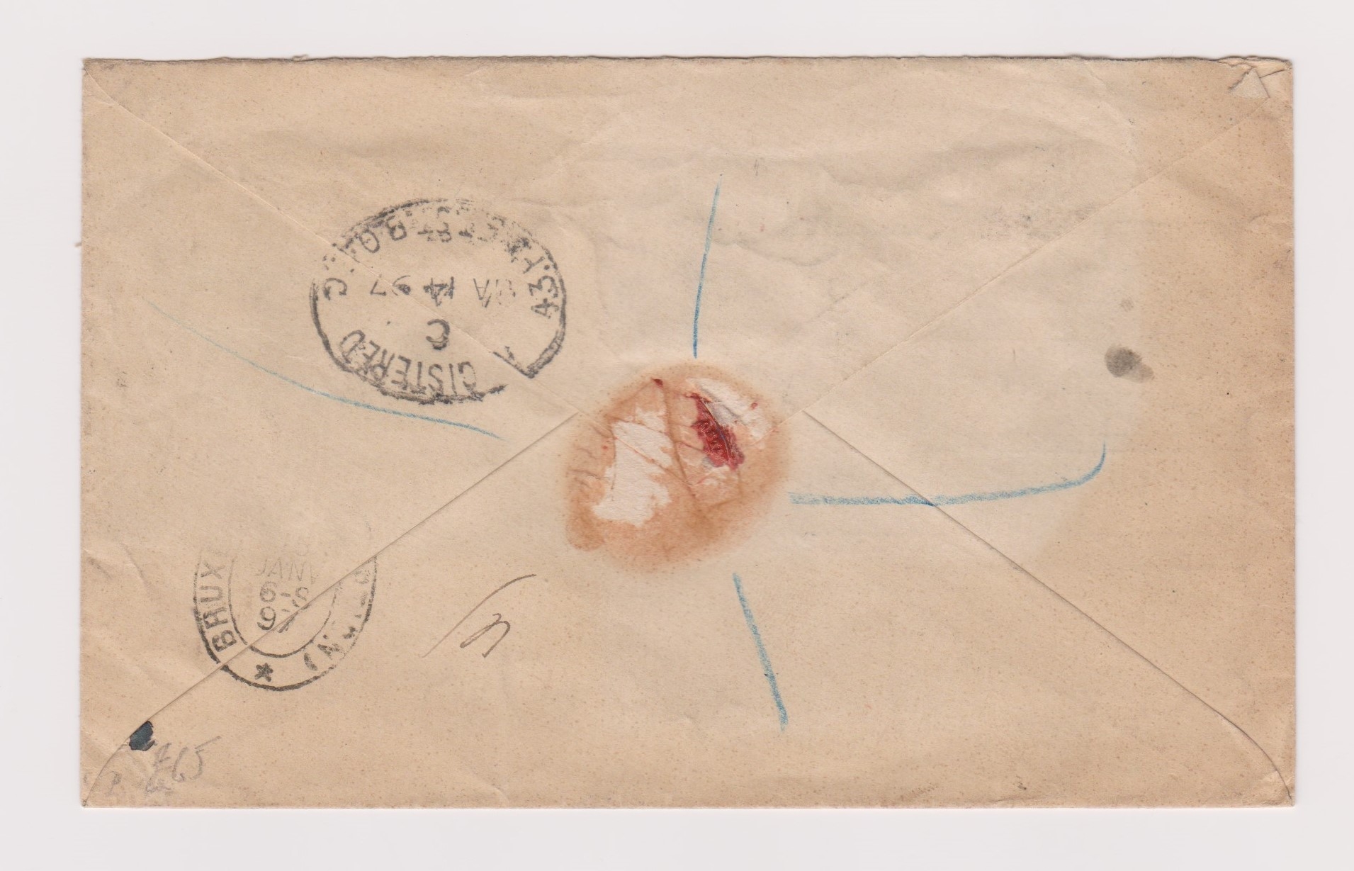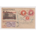 Great Britain 1897-Illustrated commercial stamp dealers registered envelope overprinted with change of address-posted to Brussels cancelled 14.1.1897 registered 43 Fleet Street on 3d red,4d red postage rate and 2xSG172-1d and SG197-1/2d 15.1.97 London registered cancel Brussels received cancel