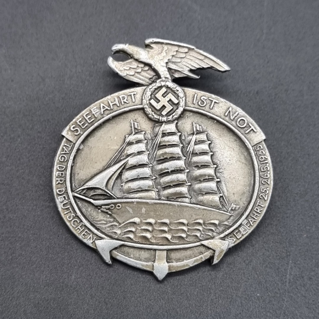 A German 1935 'Seefahrt Ist Not' tinnie, by Hoffstetter Bonn, 45mm high.