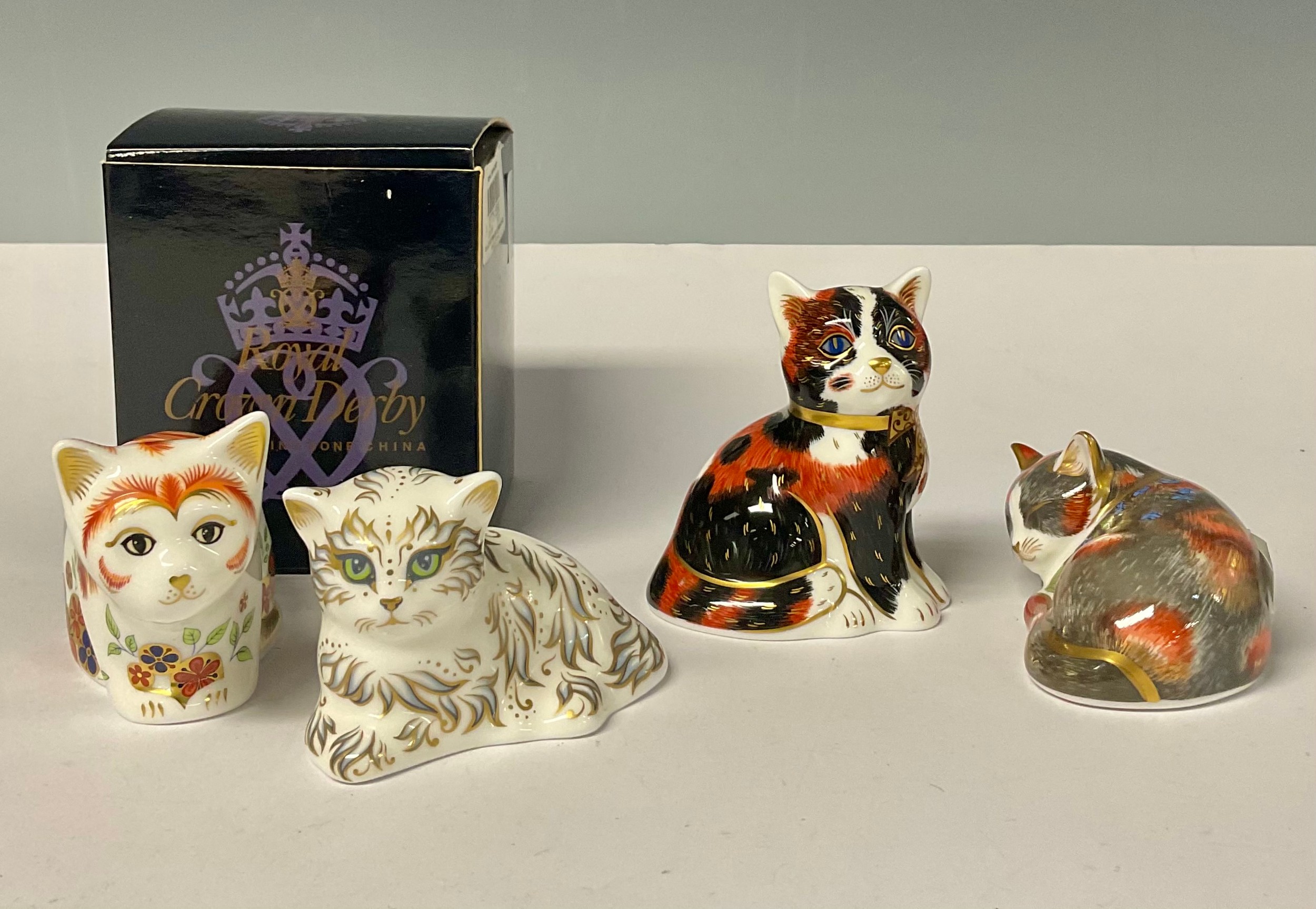 A Royal Crown Derby paperweight, Spice, Collectors Guild Kitten, gold stopper, 9cm long, printed mark in red, boxed; others, Catnip Kitten, Collector's Guild exclusive, gold stopper, 8cm long, printed mark; Calico Kitten, silver stopper; Millie Kitten, silver stopper (4)