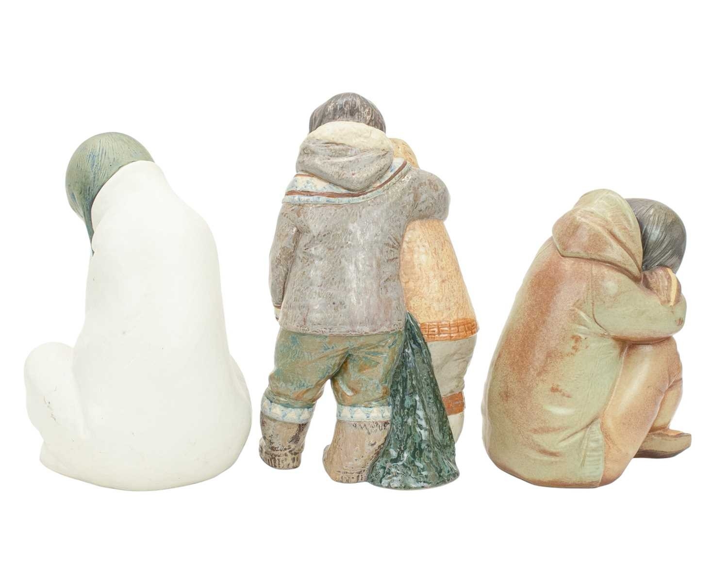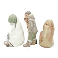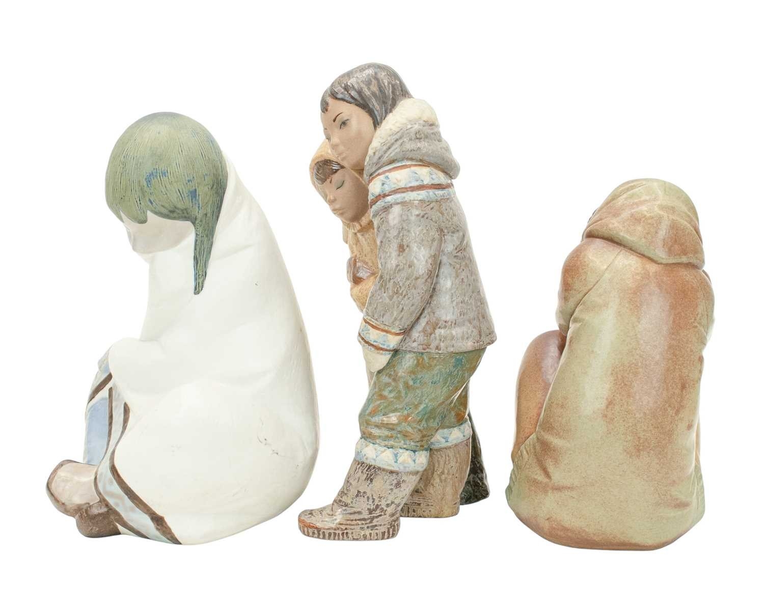 Three large Lladro Gres sculptures of Inuit children designed by Juan Huerta. Comprising 'Eskimo Boy' (no. 2007), 'Eskimo Girl' (no. 2008) and a figure group, 'Eskimo Boy and Girl' (no. 2038). Height 34cm diminishing.