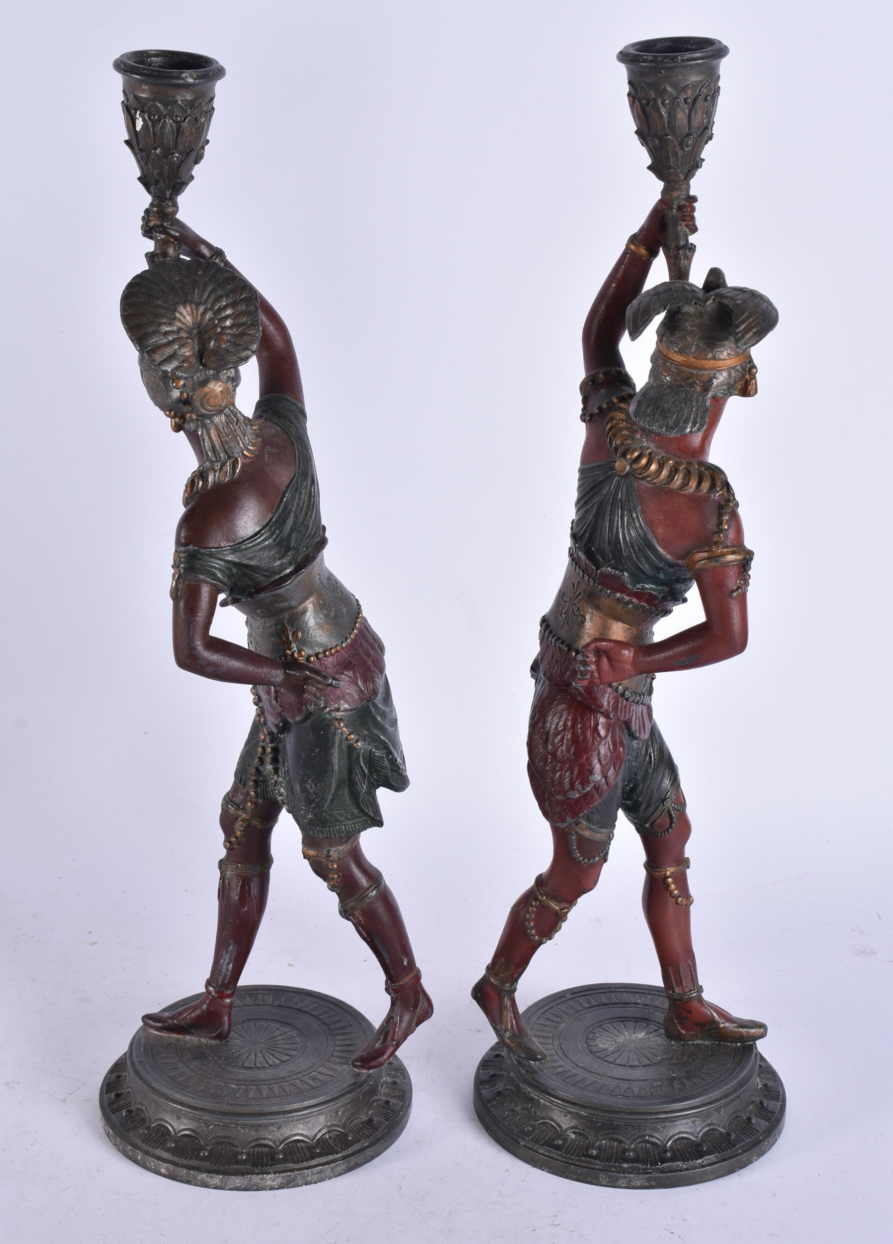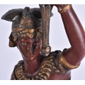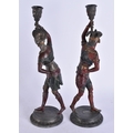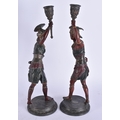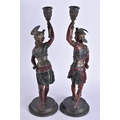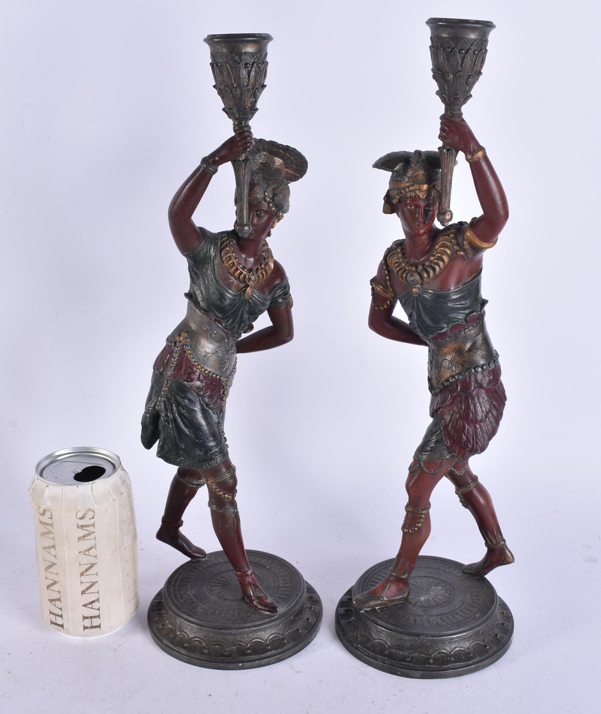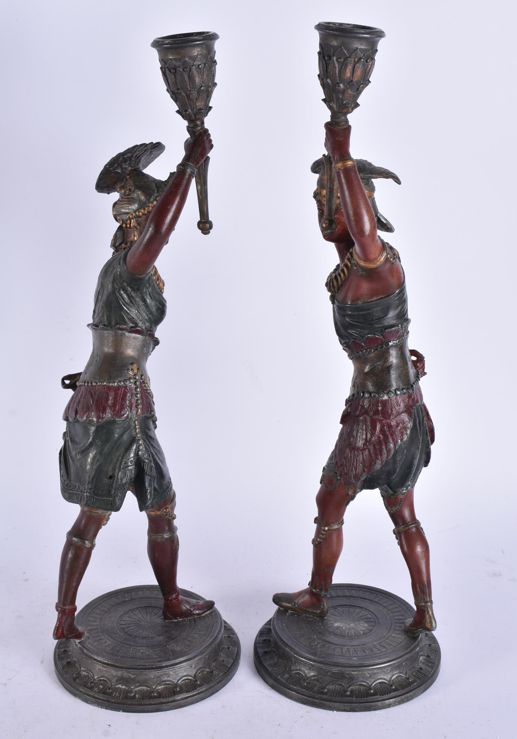 A PAIR OF COLD PAINTED NATIVE AMERICAN FIGURAL CANDLESTICKS. 38 cm high.