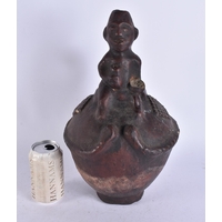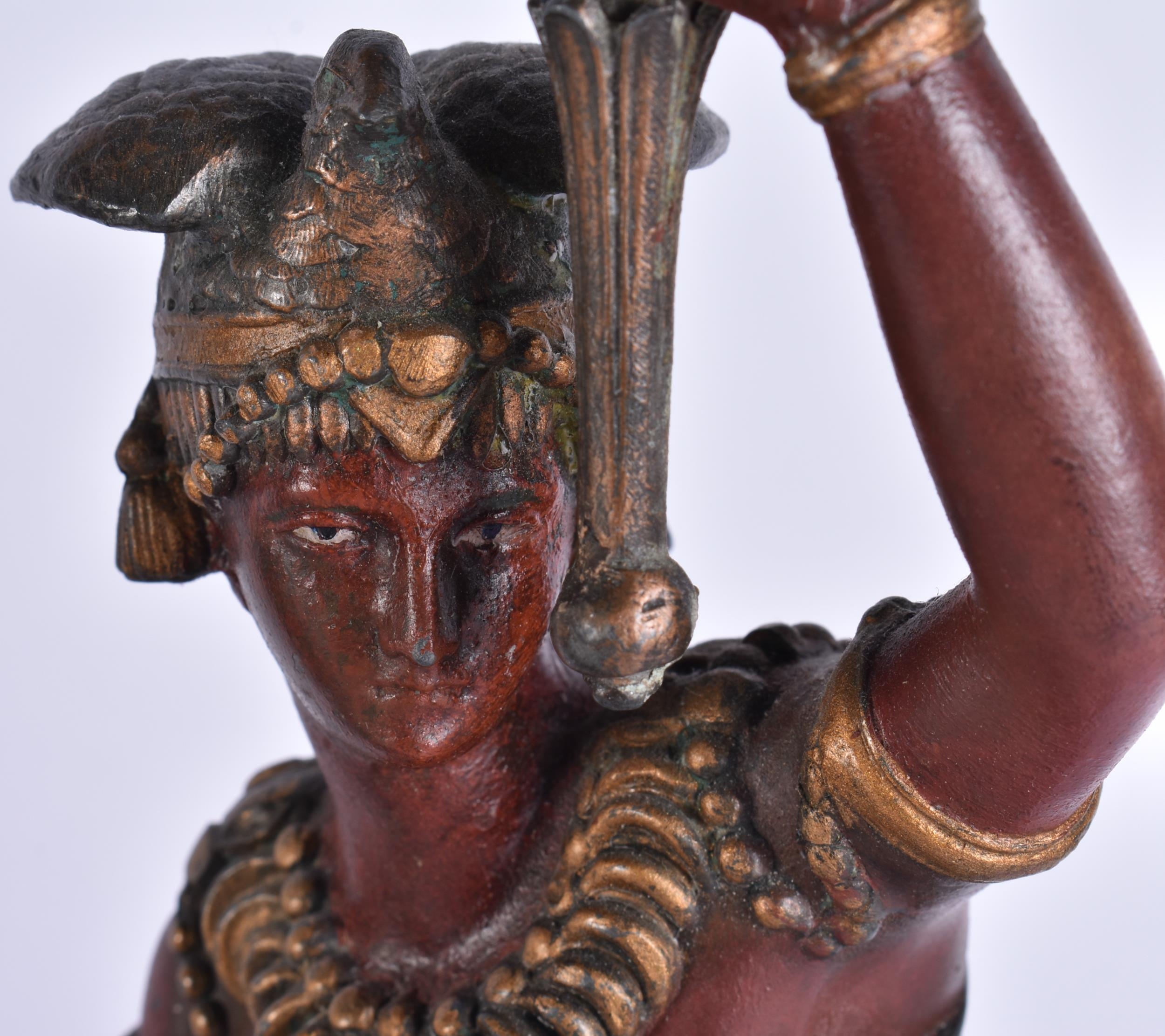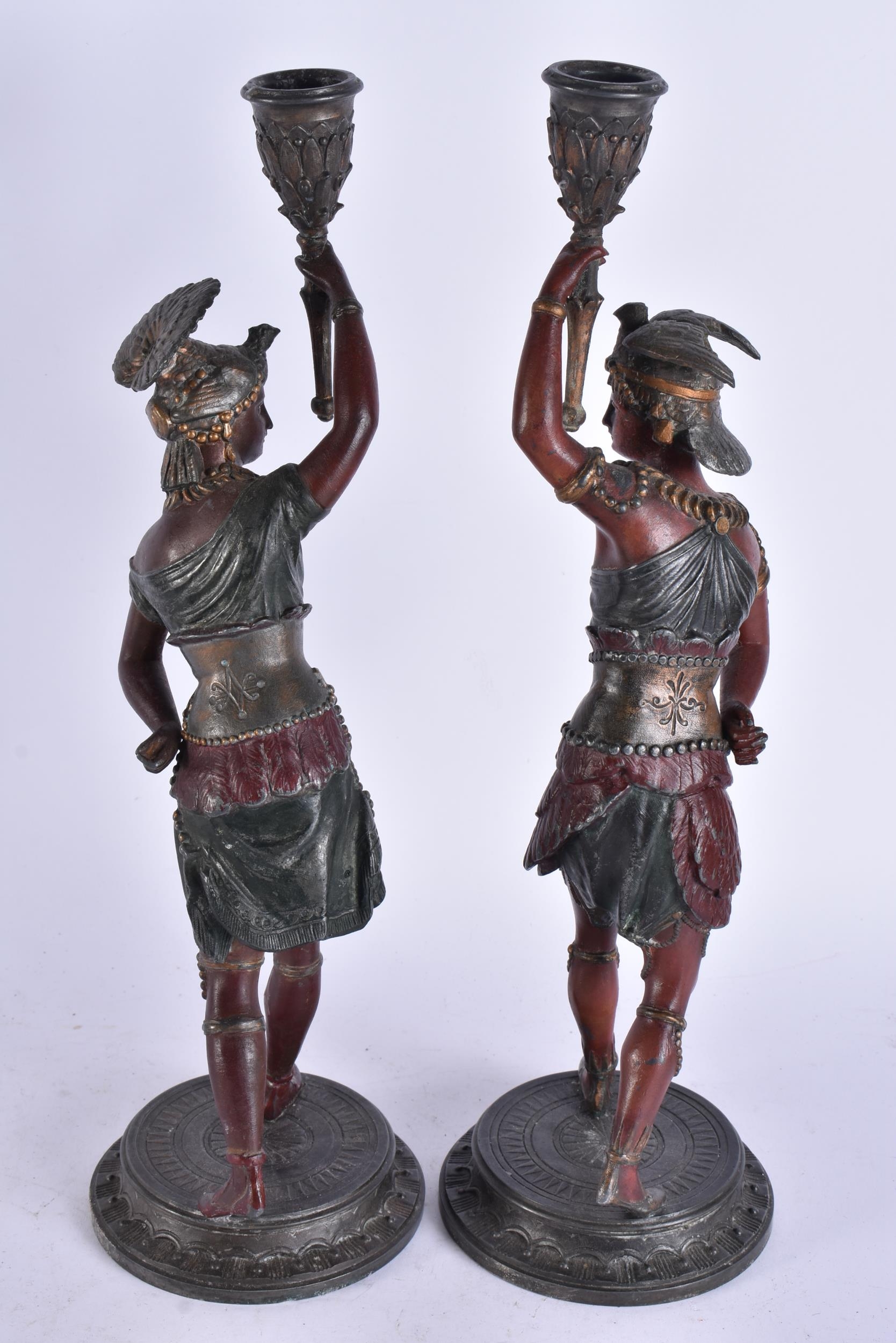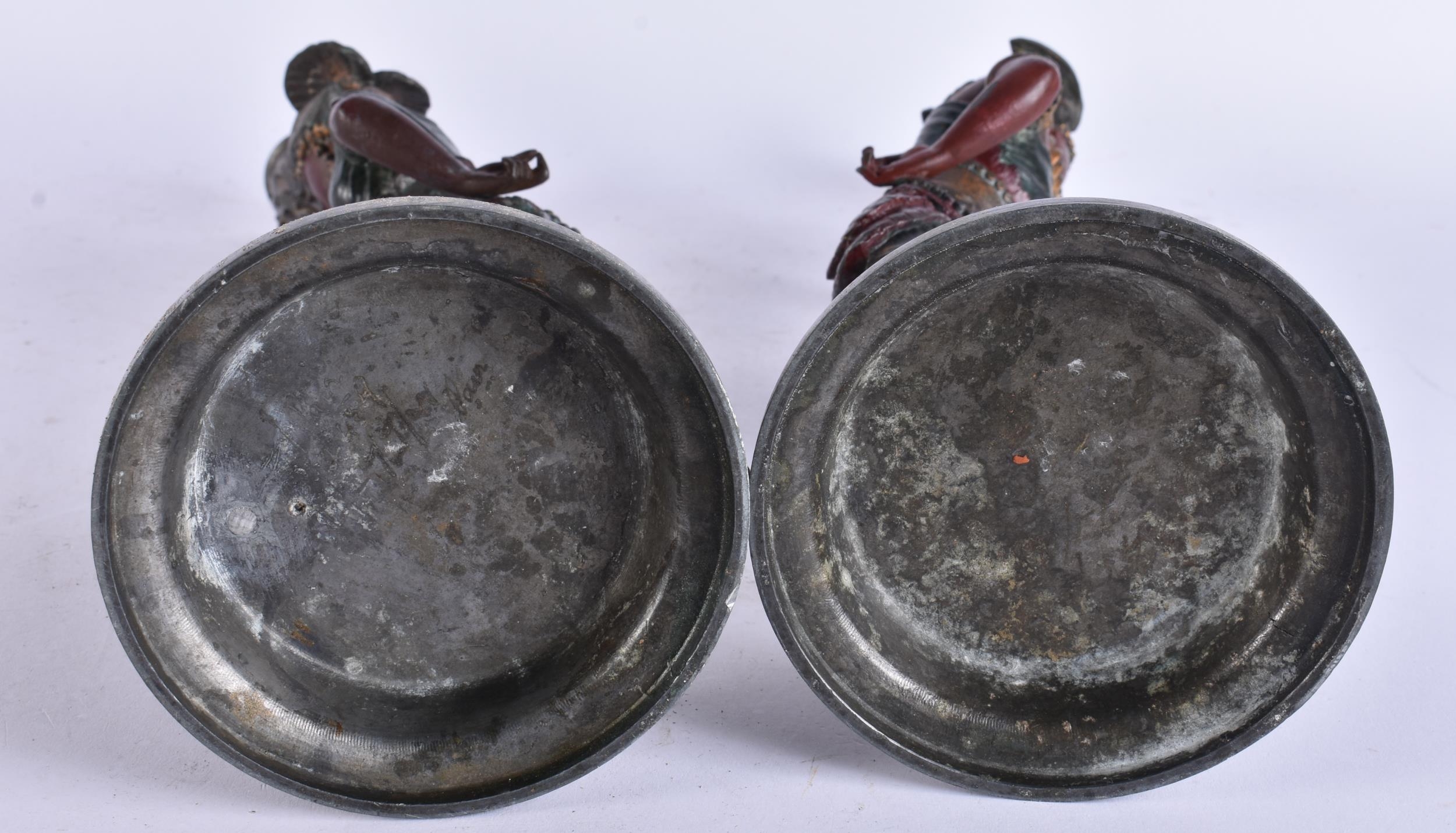 A PAIR OF COLD PAINTED NATIVE AMERICAN FIGURAL CANDLESTICKS. 38 cm high.