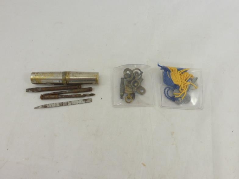Collection of eight pocket watch keys and vintage multi purpose hand tool