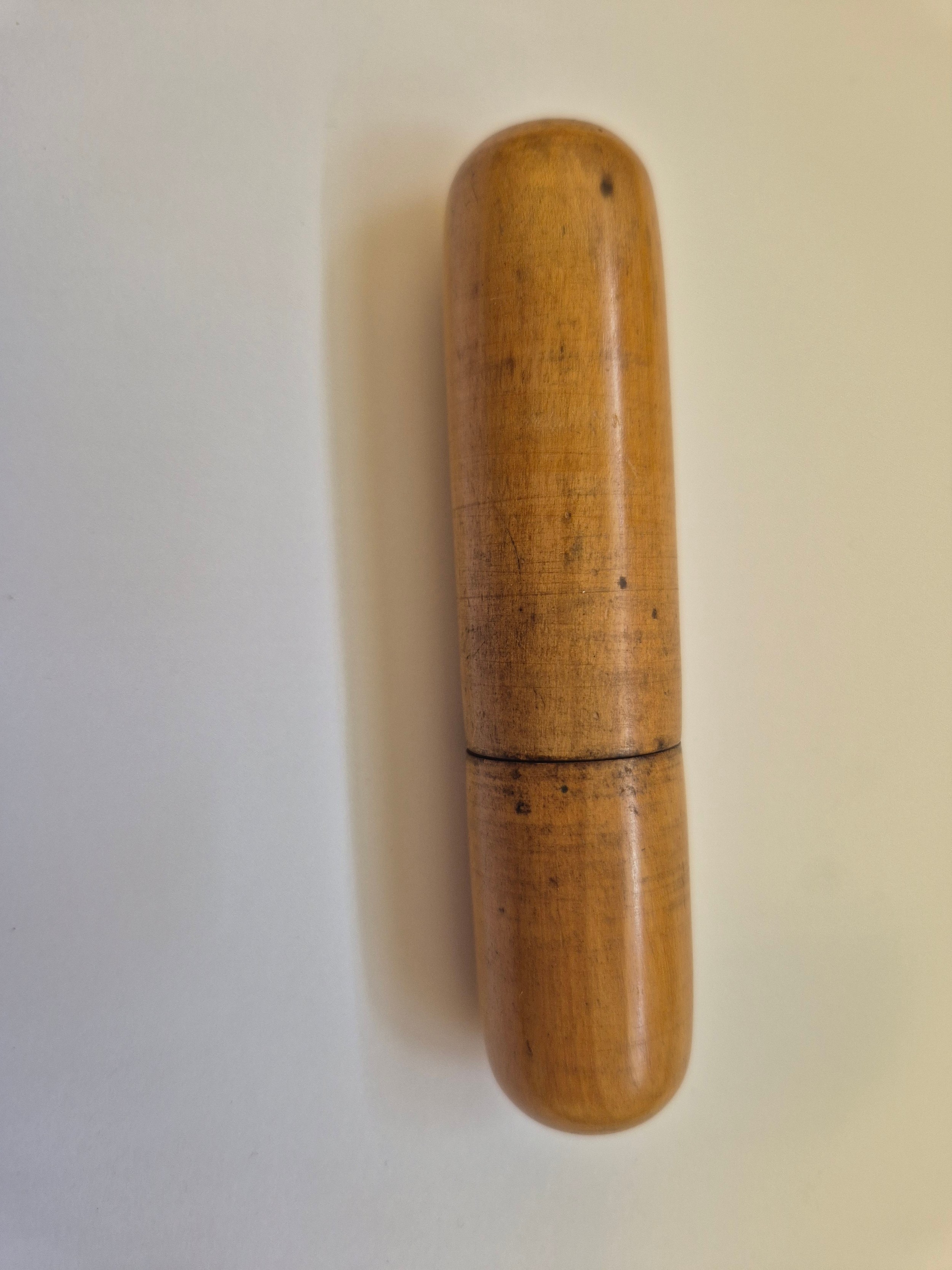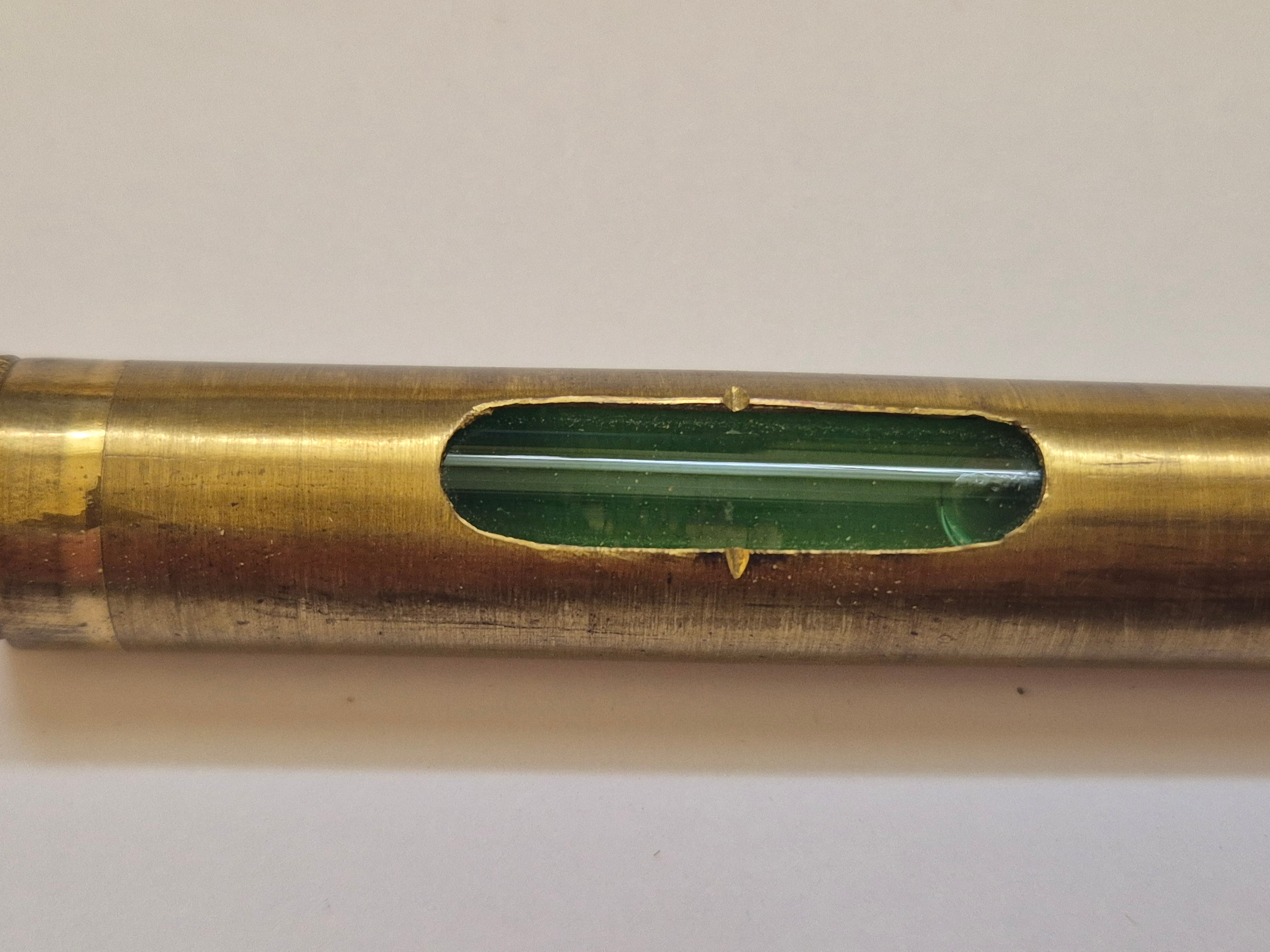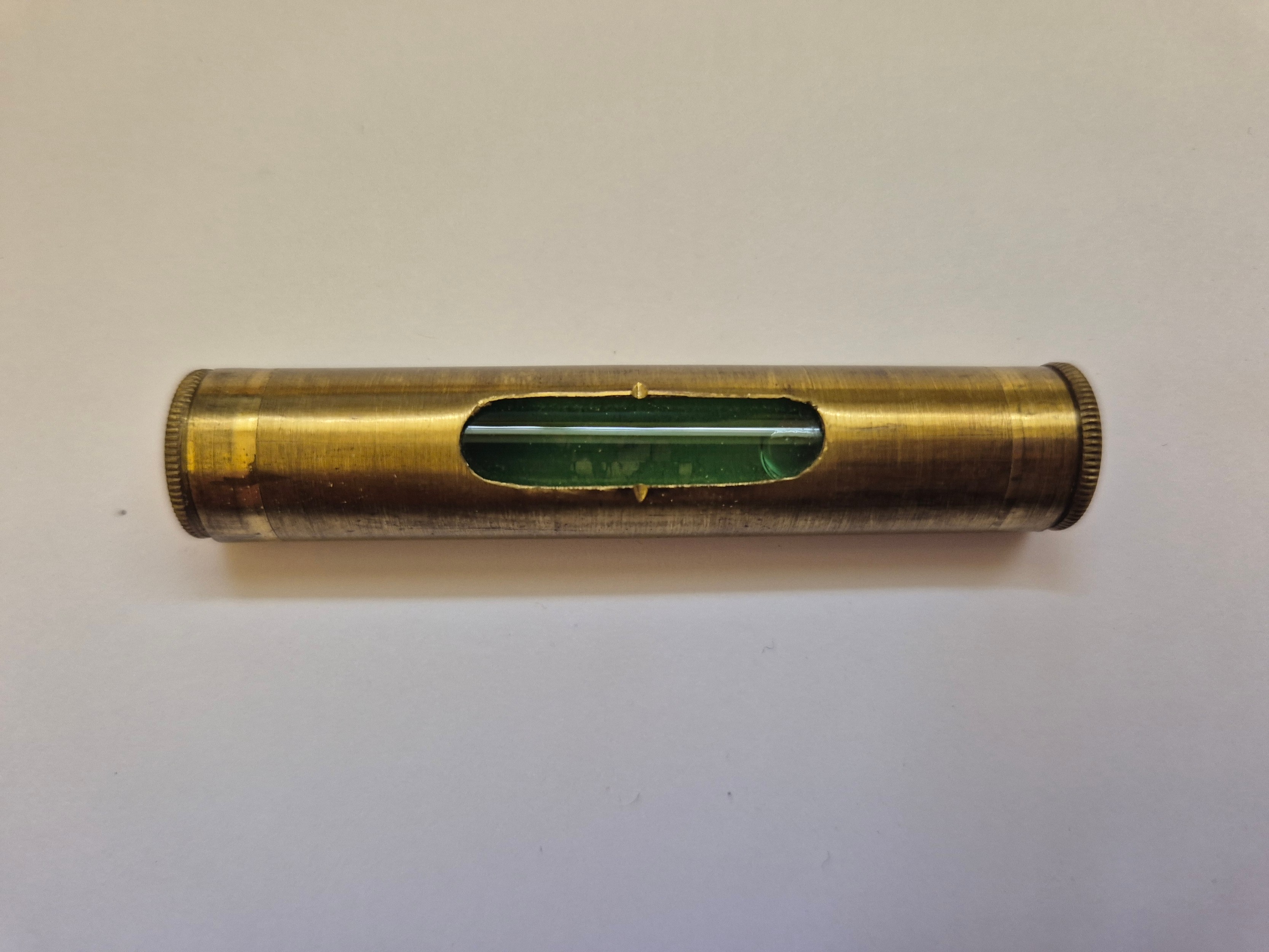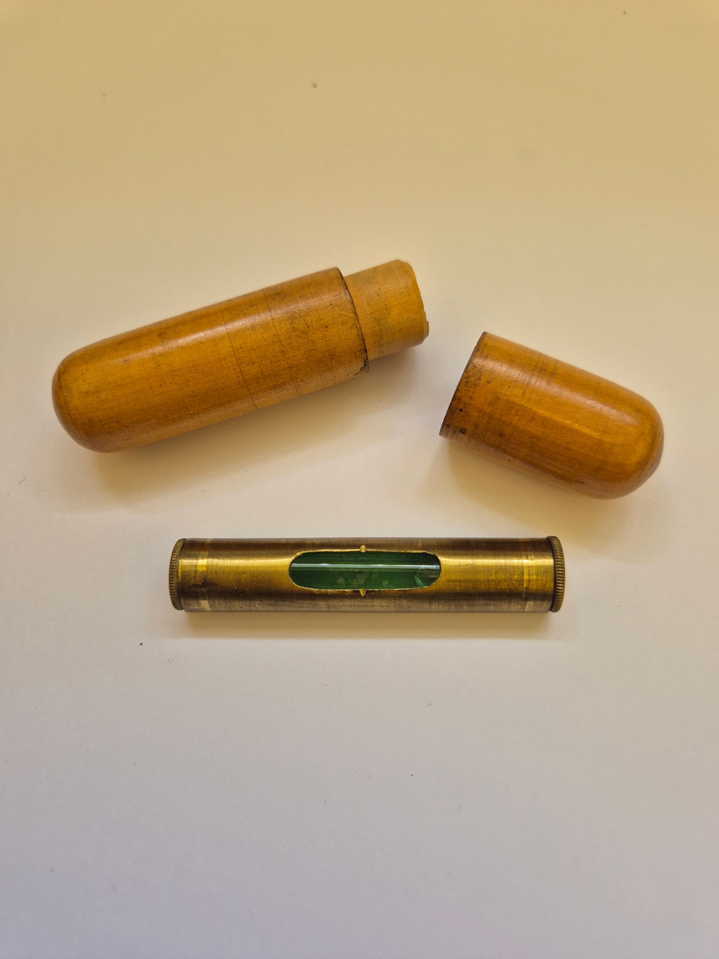 Small brass engineers 2-3/4" pocket spirit level in a boxwood case.
