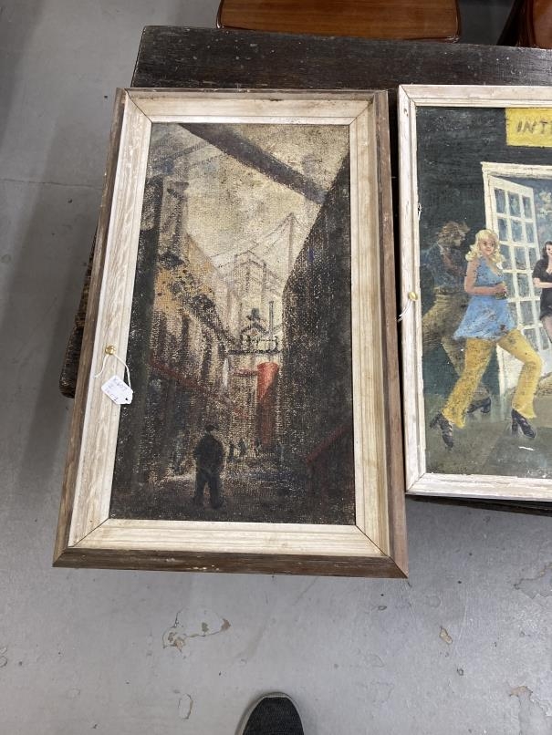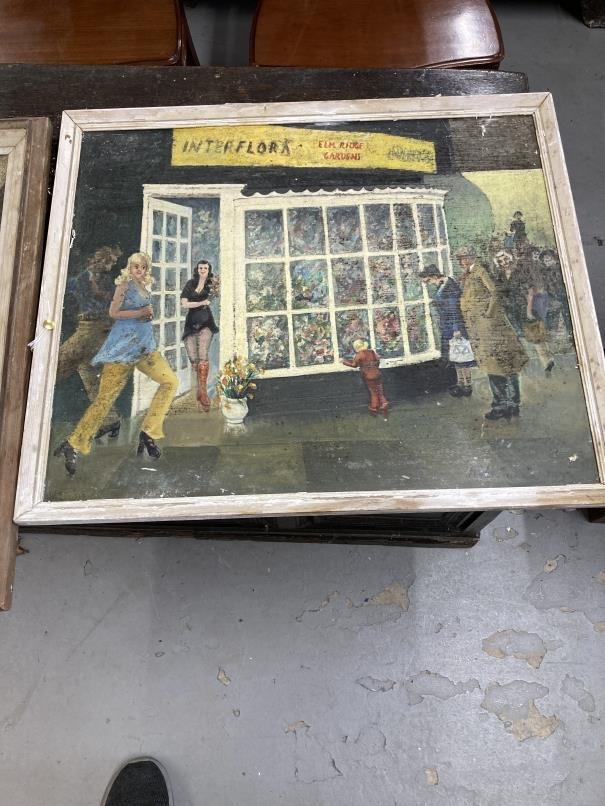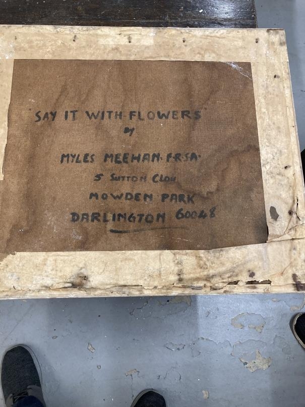 Miles Meehan F.R.S.A: 20th cent. British oil on board 'Say it with Flowers'. 20ins. x 23½ins. Plus oil on canvas Northern Street Study. 20ins. x 10ins. Both A/F