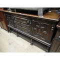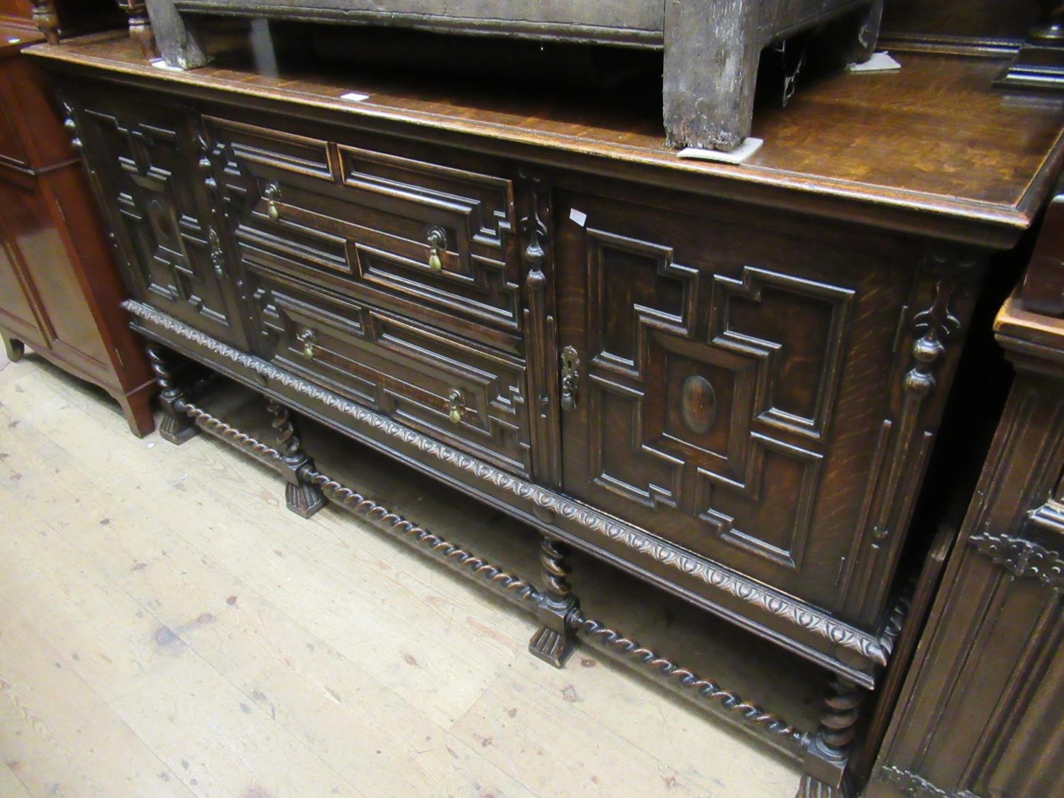 Large late 19th / early 20th Century oak sideboard having galleried geometric panelled back on barley twist supports above two central drawers with opposing cupboards on barley twist supports and stretchers, 65ins high, 72ins wide, 24ins deep