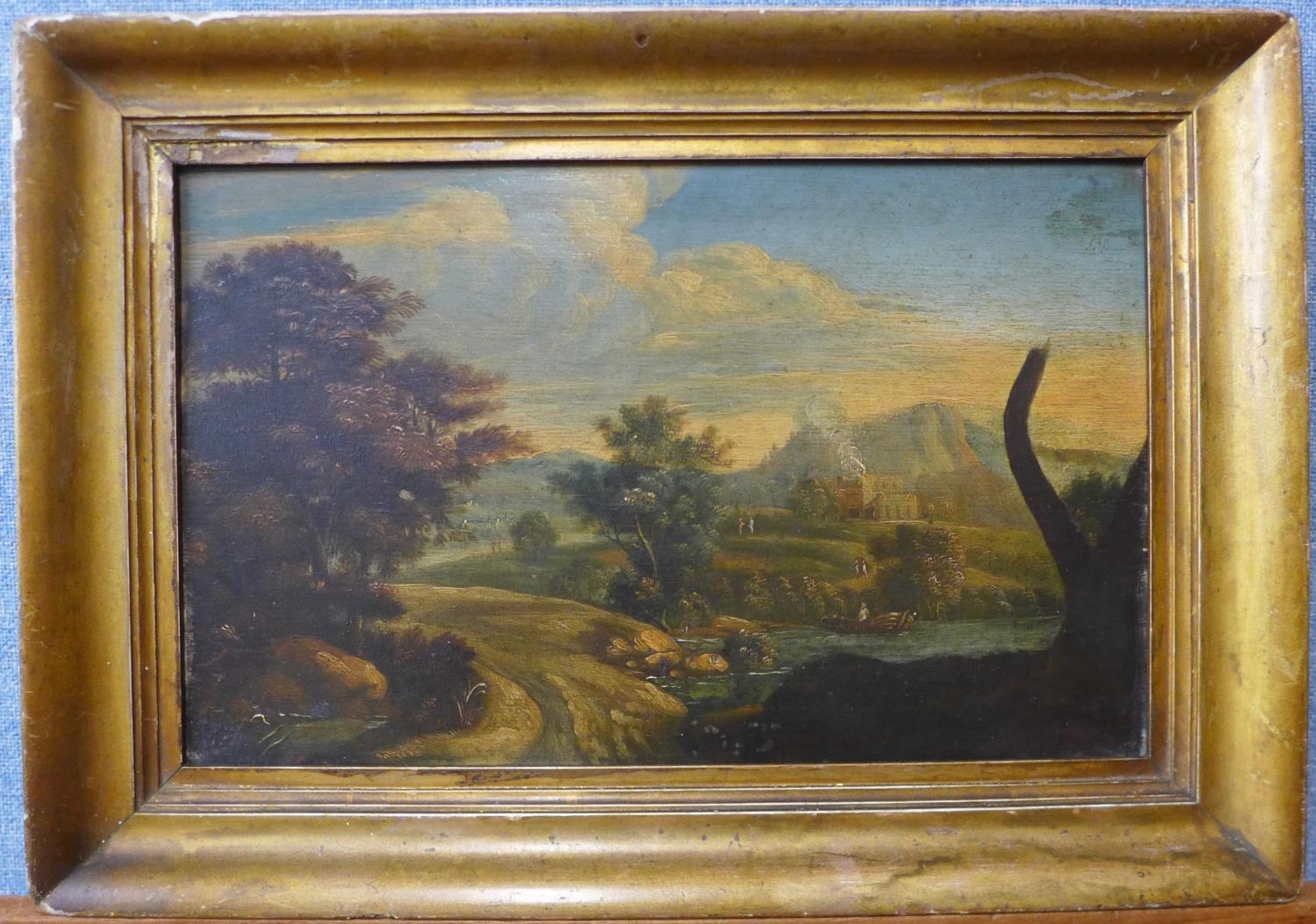English School (19th Century), lake scene landscape with country house in the distance, oil on board, 22 x 36cms, framed