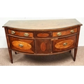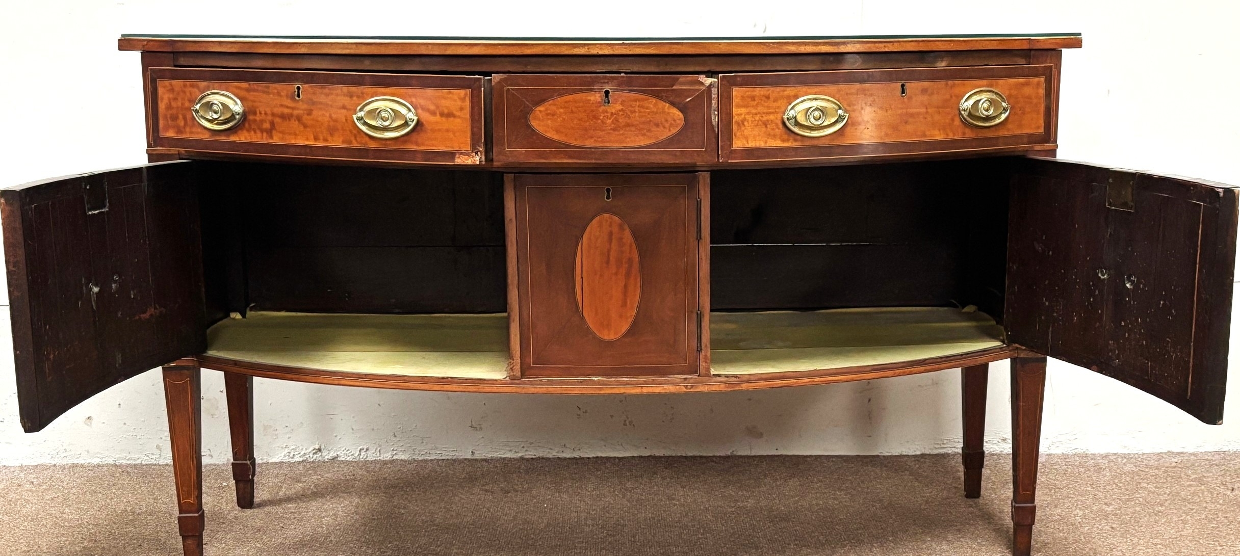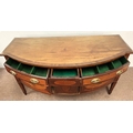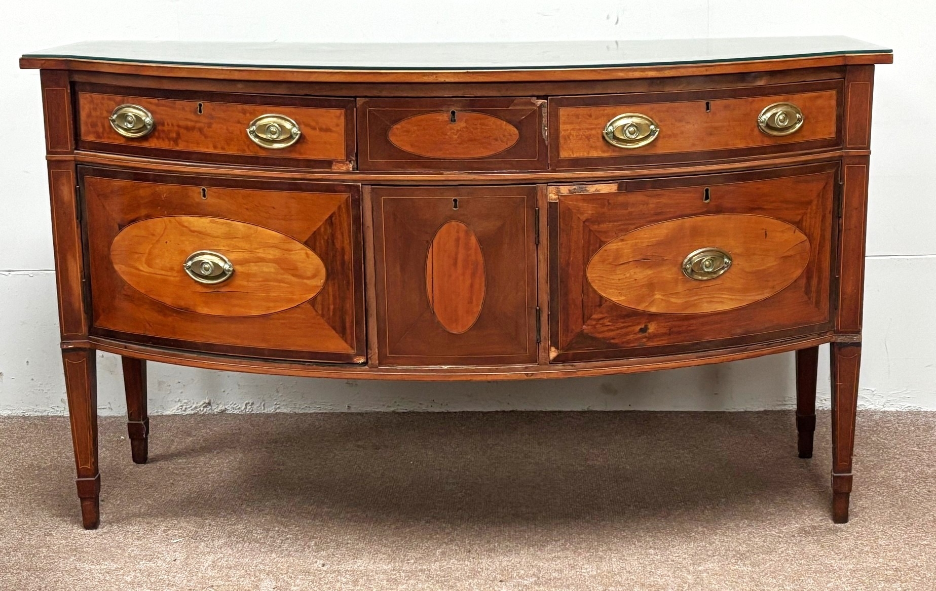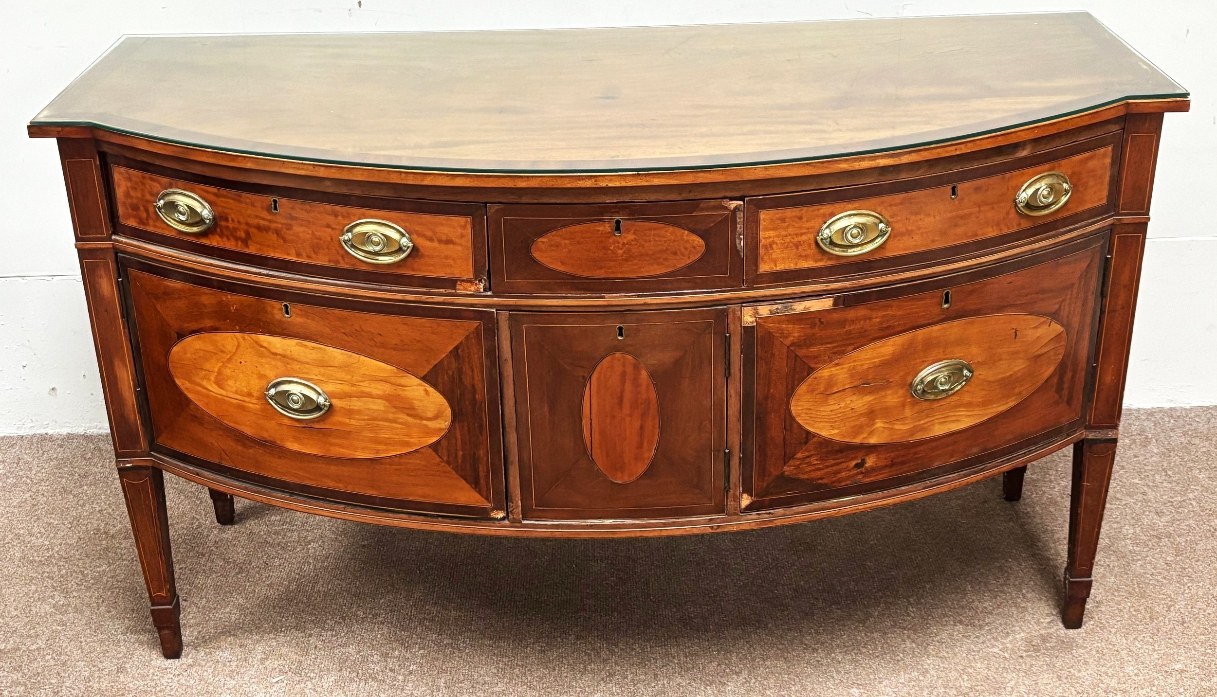 A Regency style mahogany bow-fronted sideboard, 19th century, with later glass top; 94cm high, 160cm wide, 68cm depth.