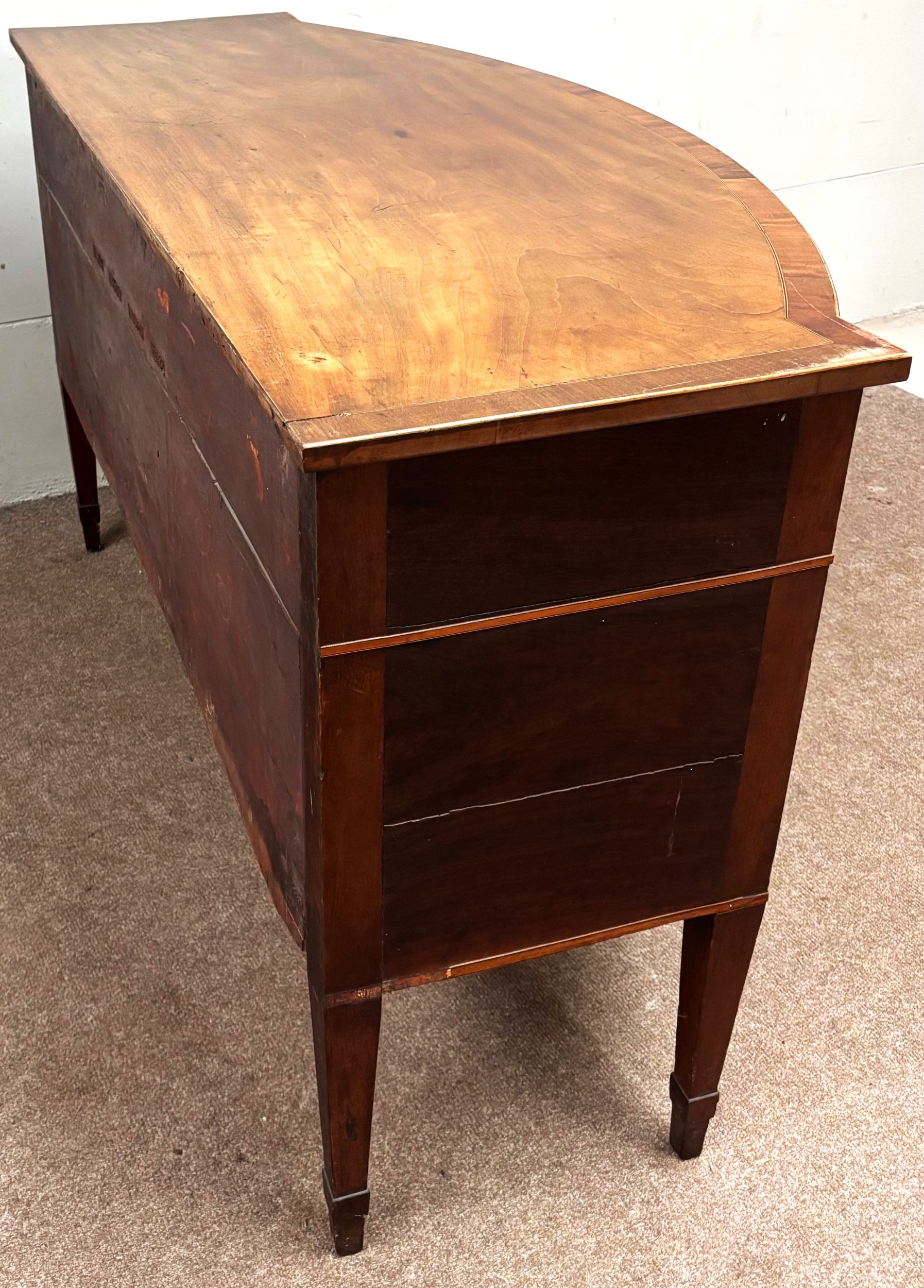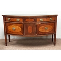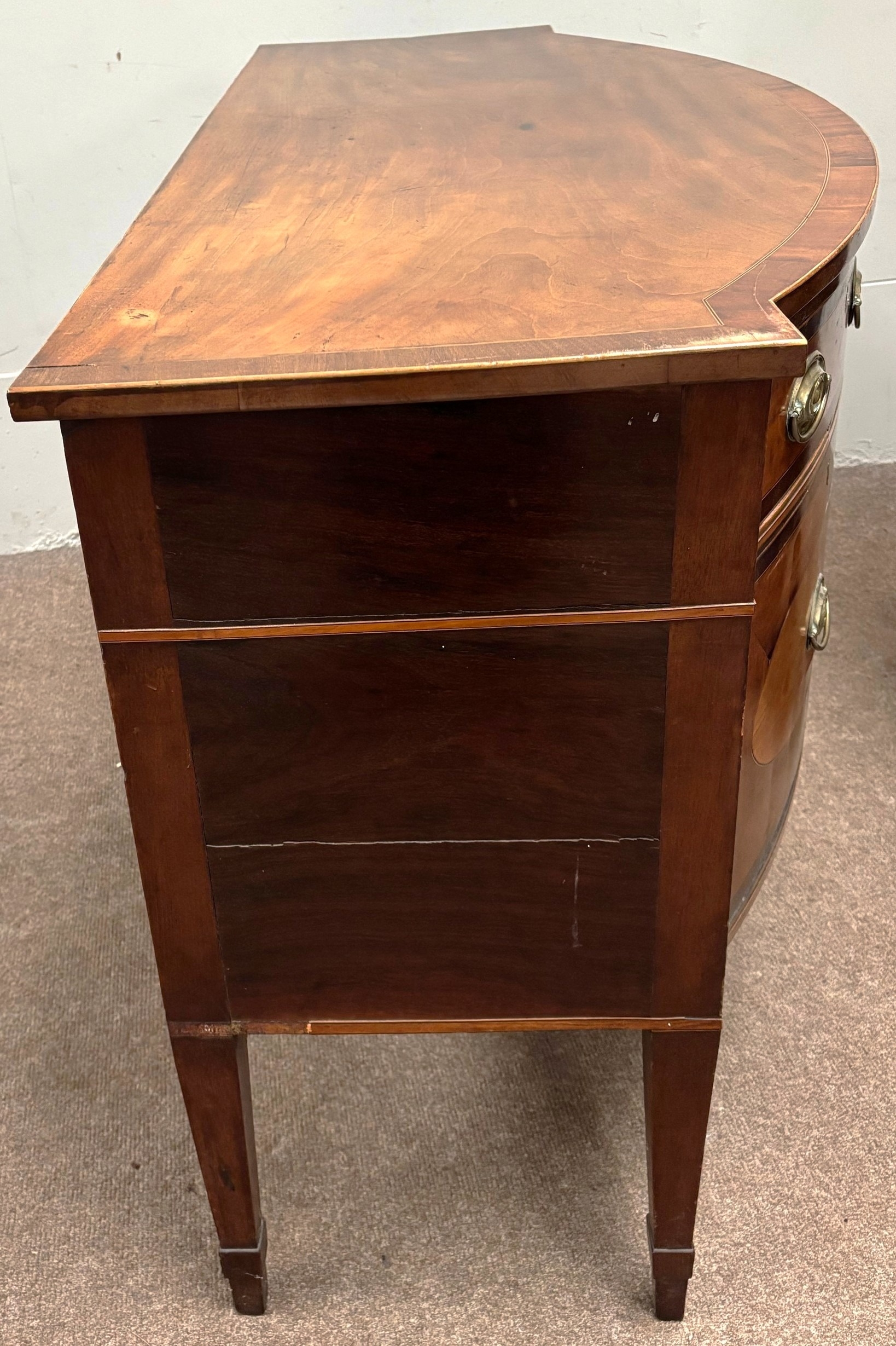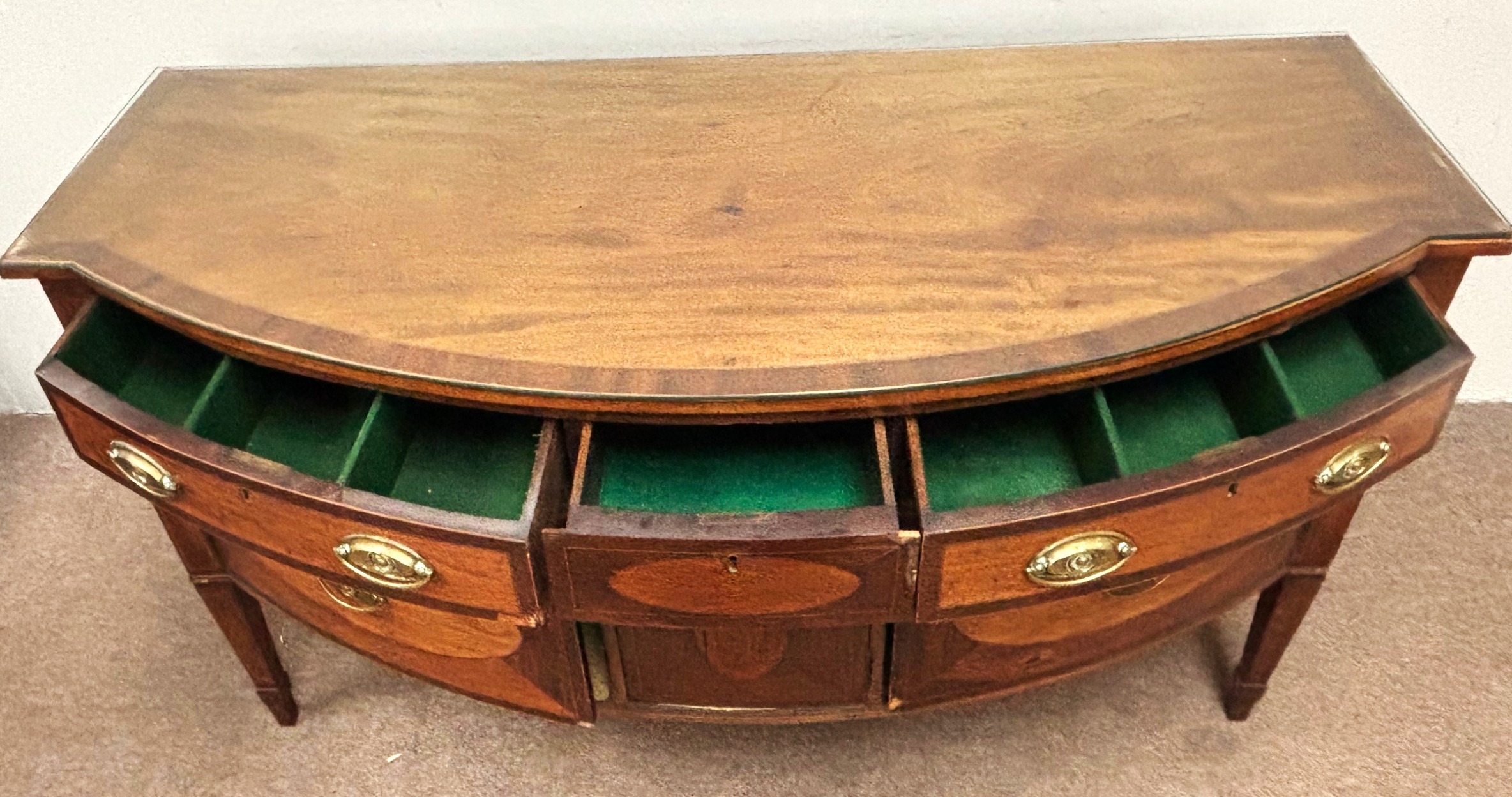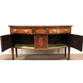 A Regency style mahogany bow-fronted sideboard, 19th century, with later glass top; 94cm high, 160cm wide, 68cm depth.