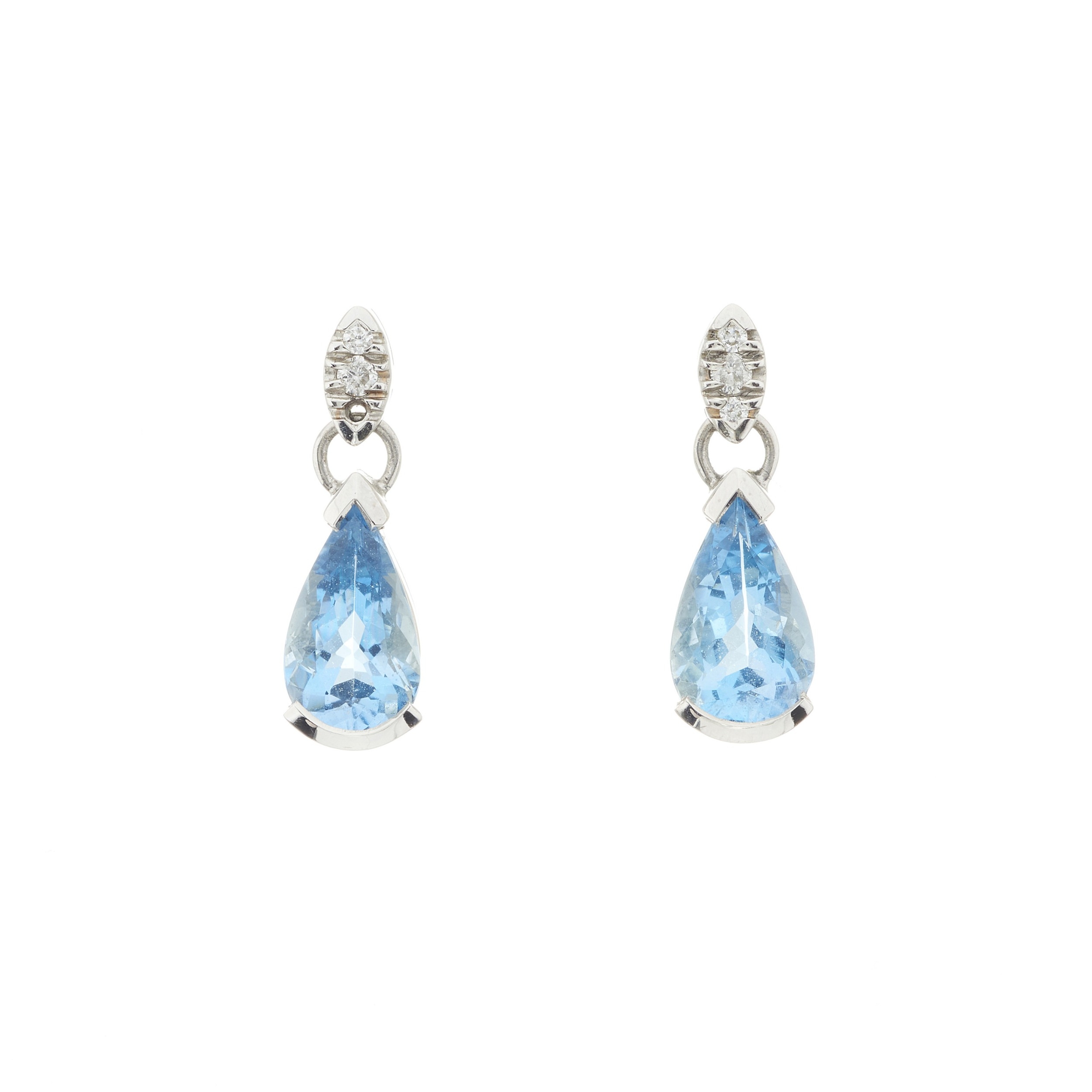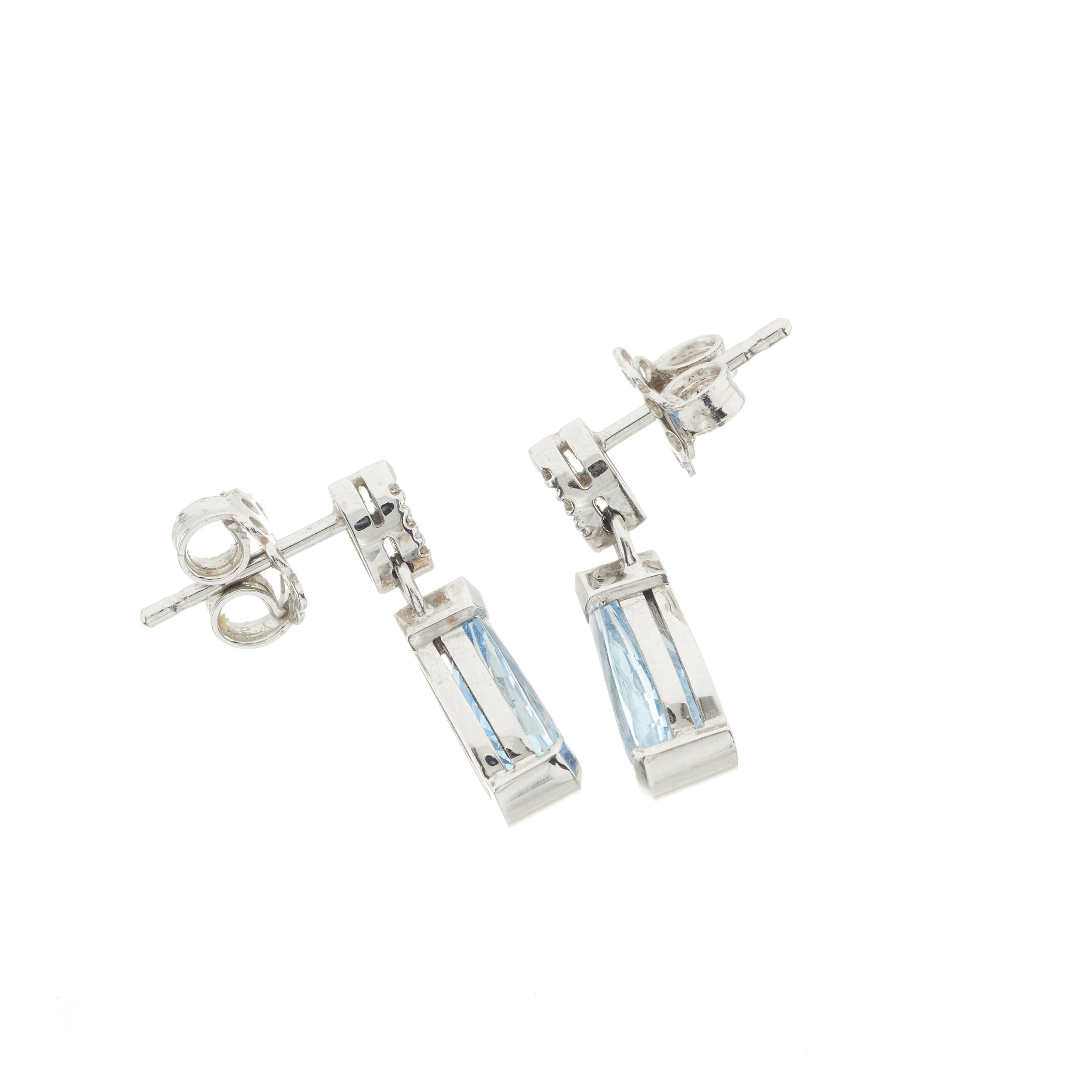 Overall good condition Fittings for pierced ears, posts with butterfly backs Aquamarines are well matched, vivid aqua blue hue, well saturated, good clarity, good surface condition Diamonds bright and lively considering size, well matched Clients are advised to view and inspect items before bidding and they must satisfy themselves as to the condition of every lot For enquiries about this lot please contact David Pregun at david@kinghamsauctioneers.com