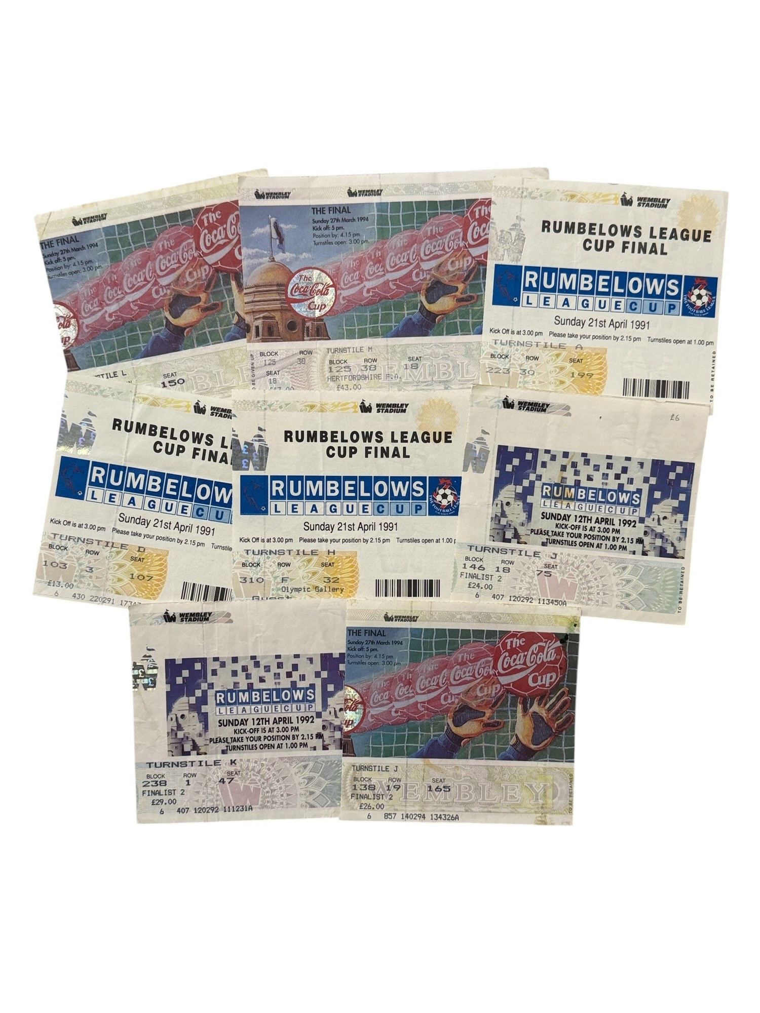 COLLECTION OF MANCHESTER UNITED FOOTBALL LEAGUE CUP TICKET STUBS, 8 IN TOTAL, DUPLICATION NOTED.