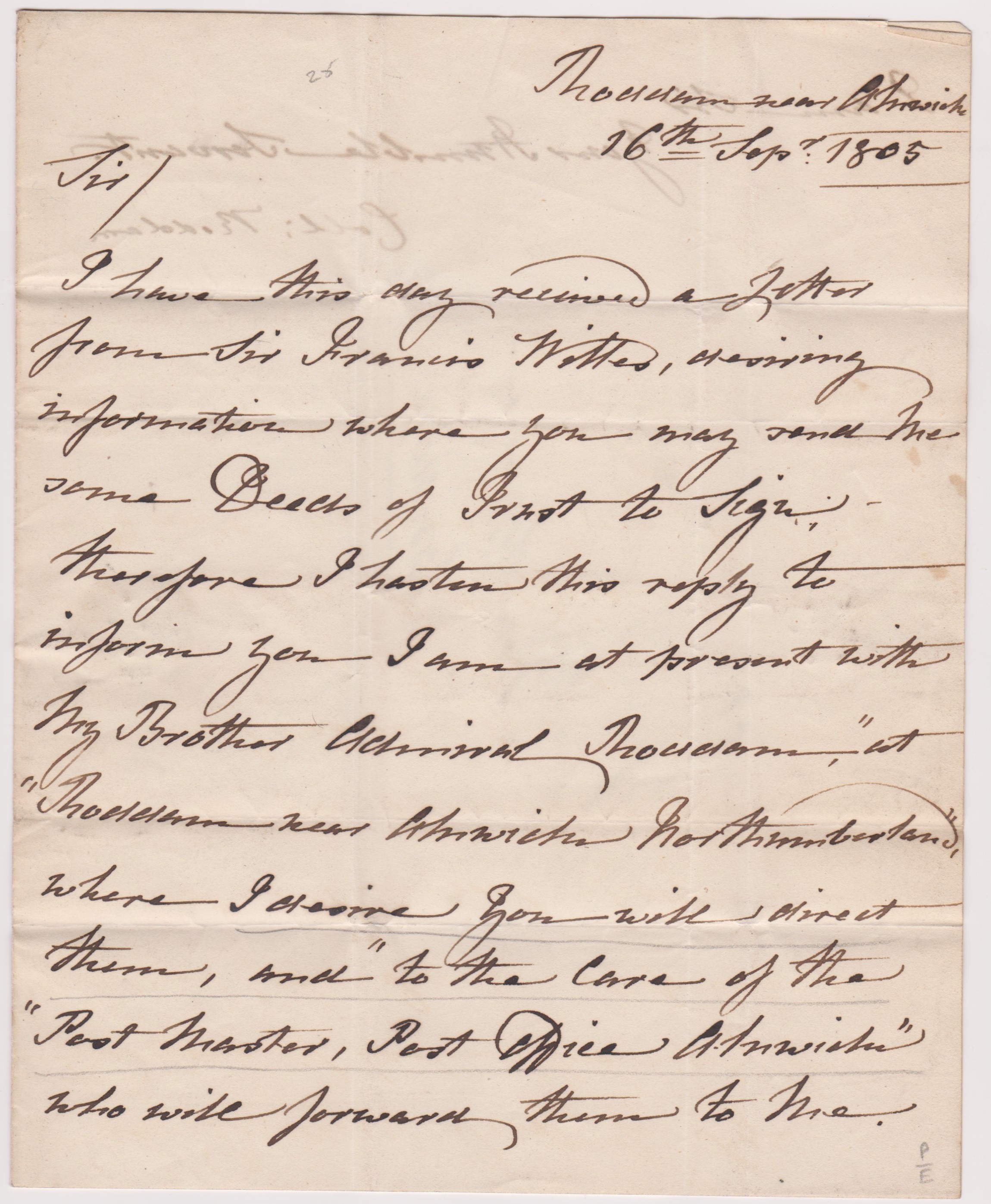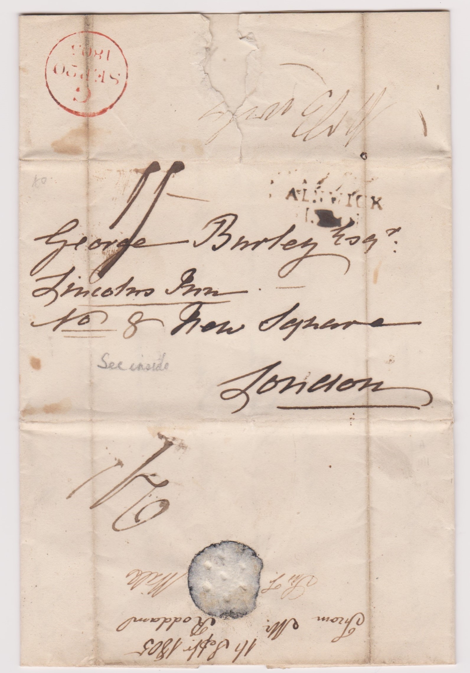 Great Britain 1805 - EL dated 26th Sept 1805-posted to London, manuscript postage rate 2 line Alnwick Mileage cancel - red single ring London G-Sept 20th 1805 cancel