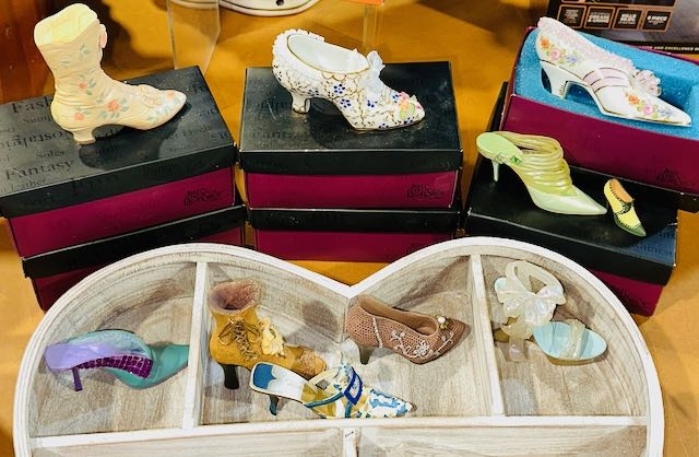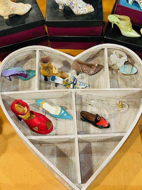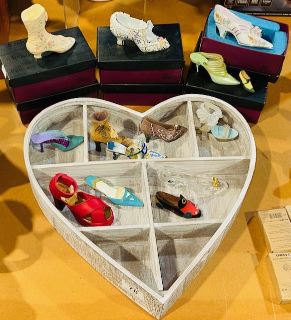 Heart Display Shelf & Approx 14 Collectible Shoe Figurines Incl Regency & Just The Right Shoe (Some Boxes Present)