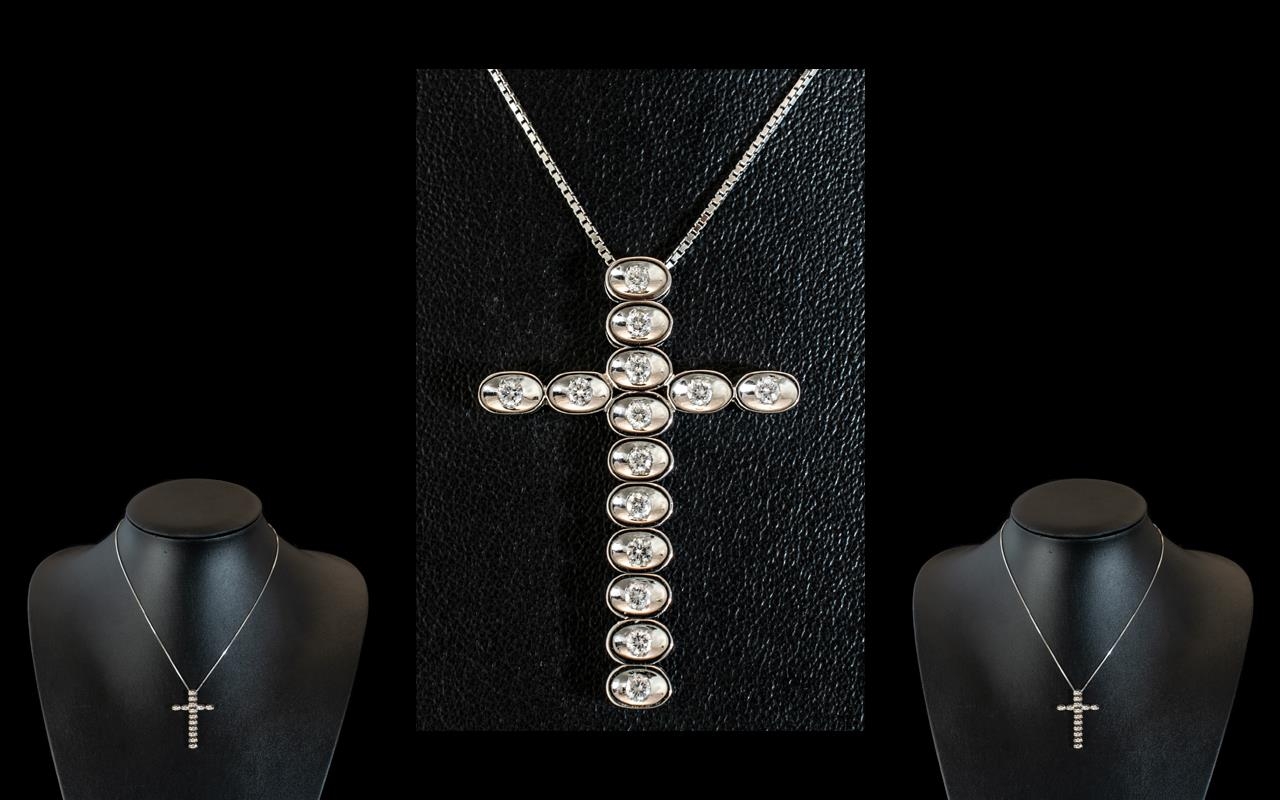 An 18ct Gold Cross Each Hinged Link Set with a Round Modern Brilliant Cut Diamond, Suspended on an 18ct Gold Box Chain.