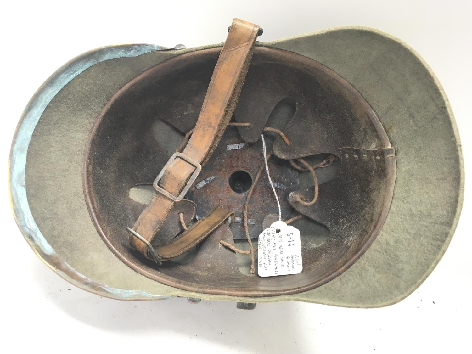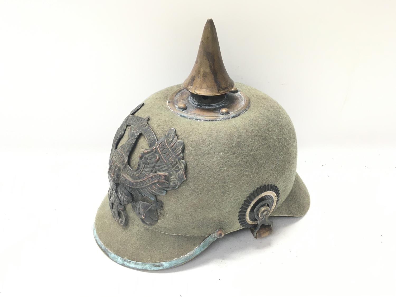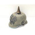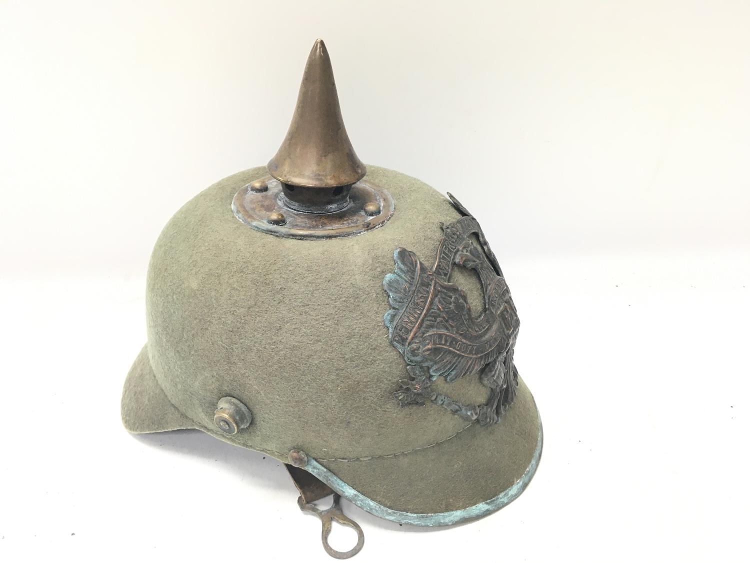 WW1 Imperial German Felt Ersatz (economy) Issue 1915 Model Pickelhaube. The "Waterloo" on the helmet Wappen Plate indicates the Hanoverian Infantry who fought there during the Napoleonic Wars.