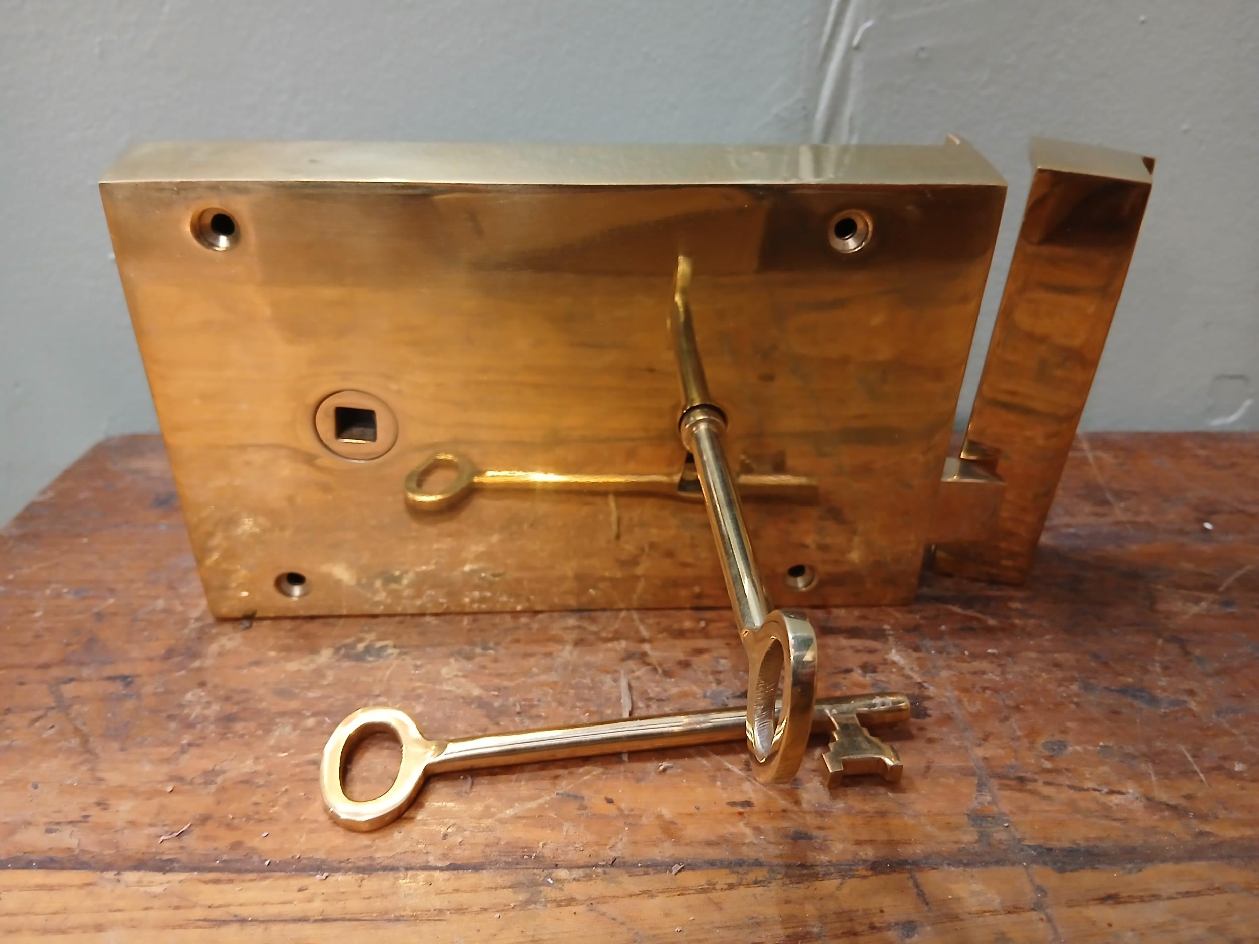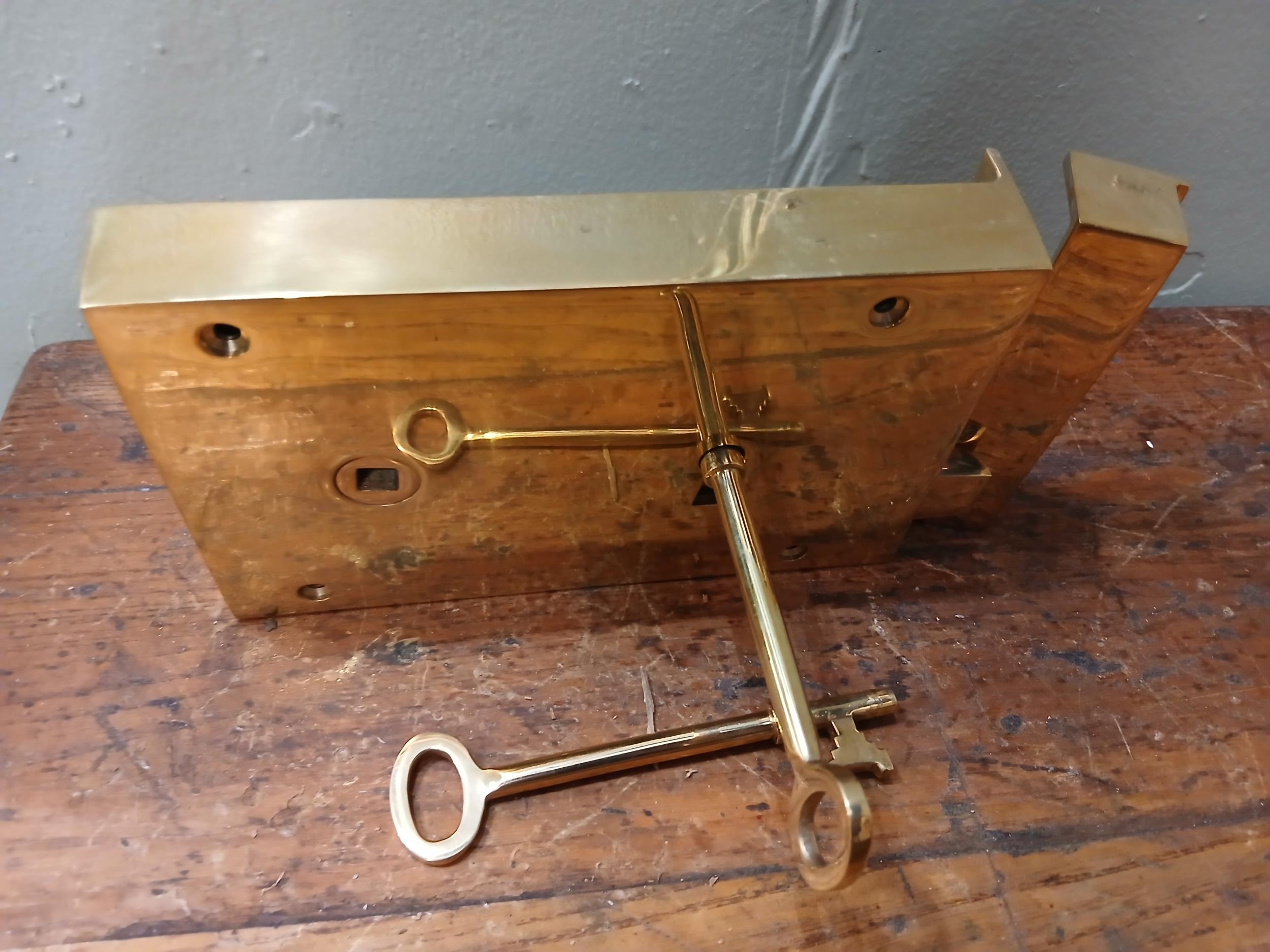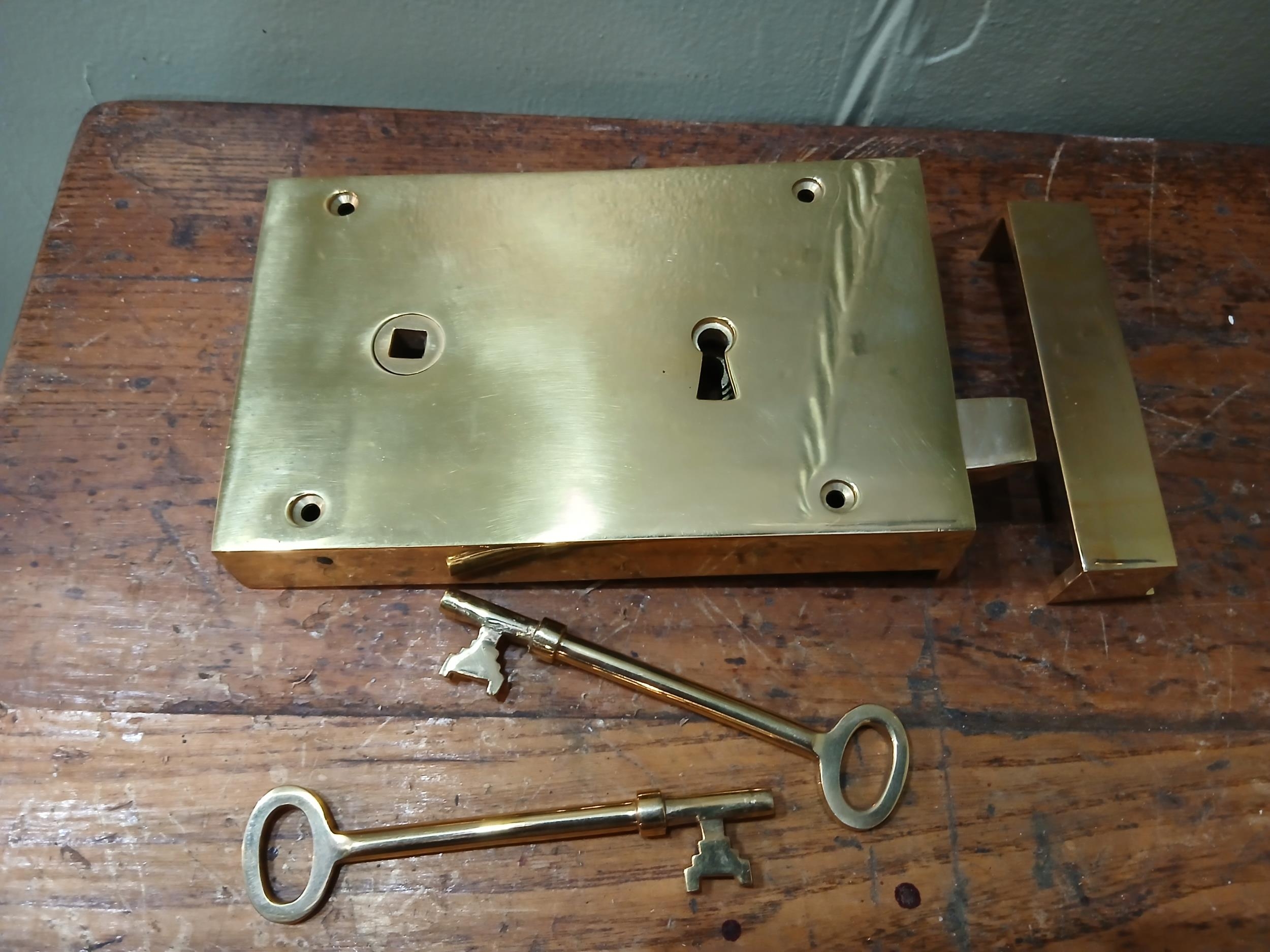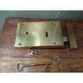Solid brass Rim lever door lock. {H 11cm x W 19cm x D 3cm }. NOT AVAILABLE TO VIEW IN PERSON.