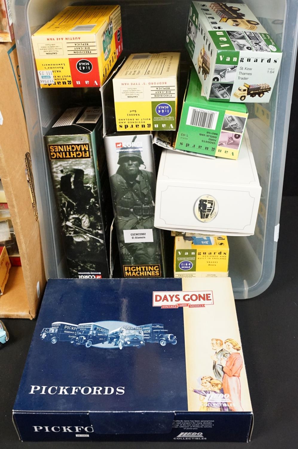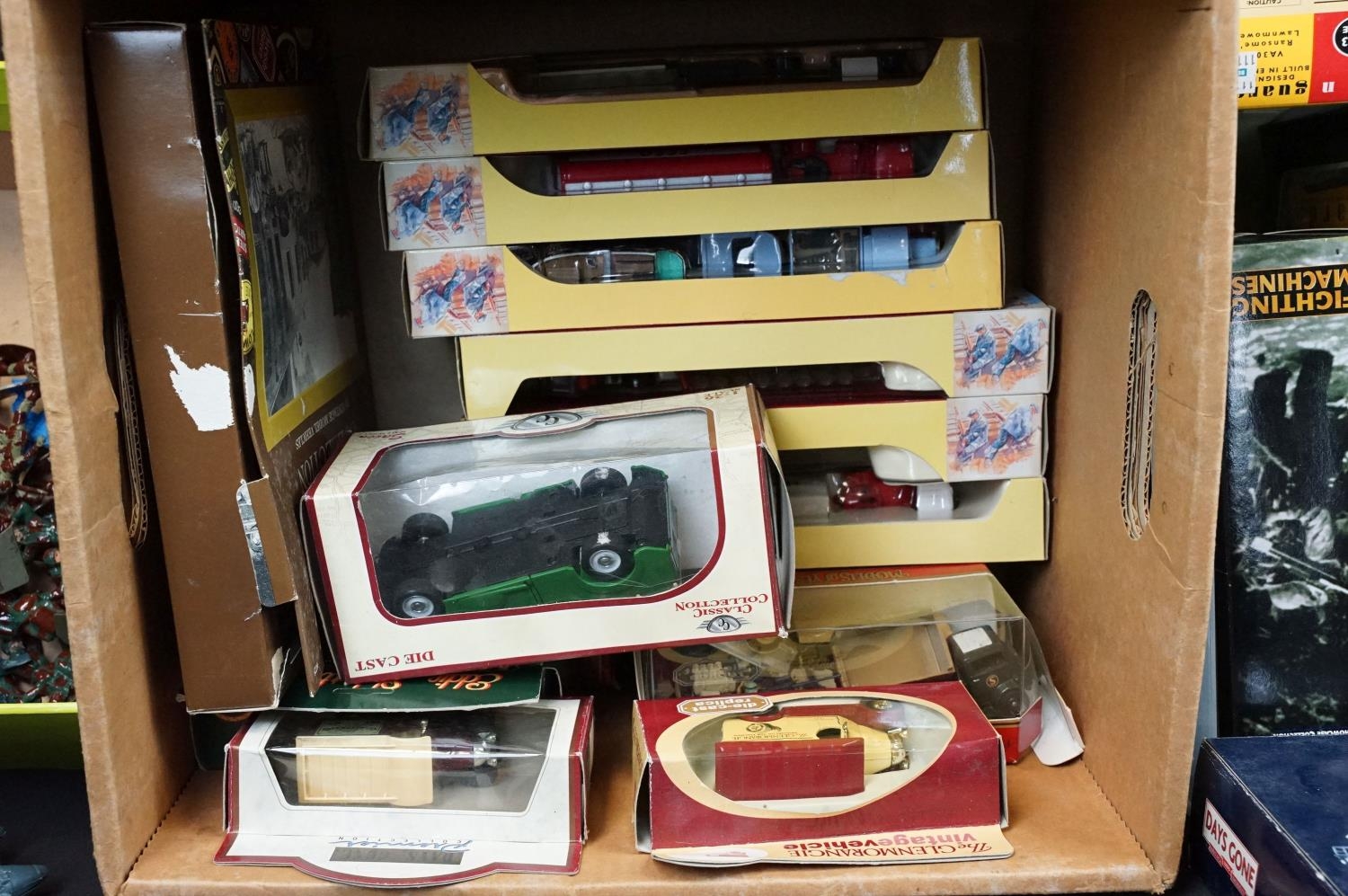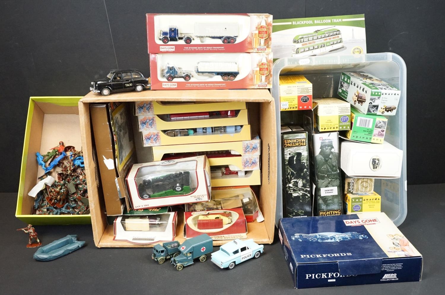 26 Boxed diecast models to include 5 x Vanguards, 2 x Corgi Fighting Machines, 8 x Trackside, Lledo, Atlas Matchbox etc plus some unboxed diecast models and a group of unmarked plastic military figures