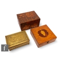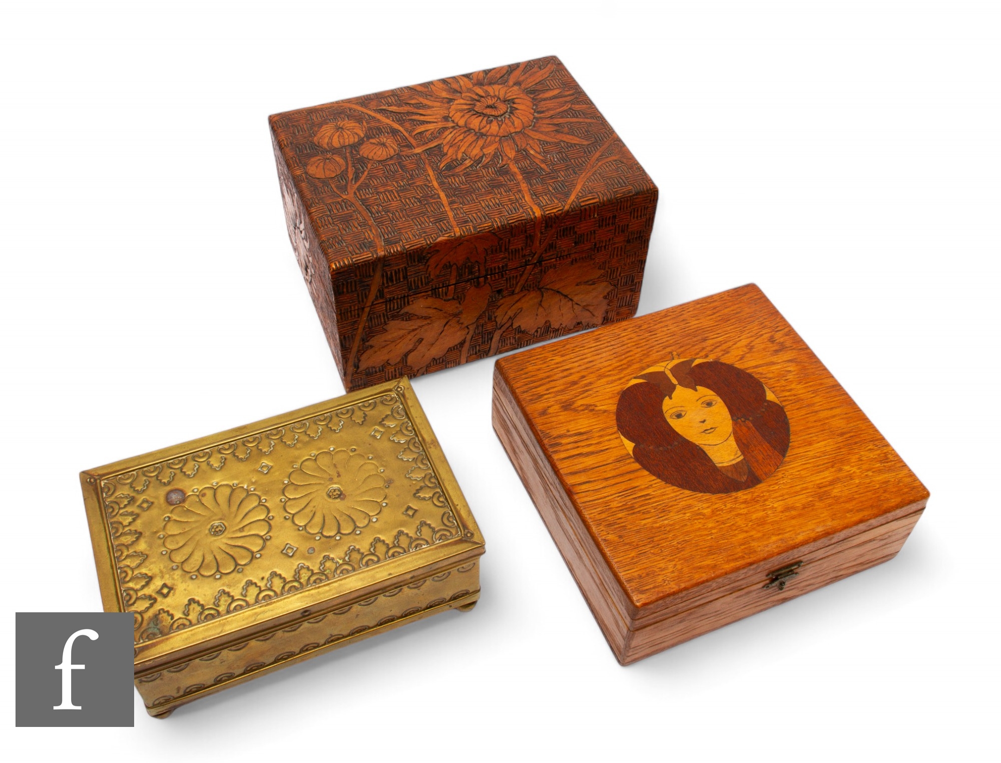Unattributed maker - A collection of wooden boxes, comprising a wooden example carved with flowers, another with an inlaid portrait of a girl, and a brass example with flowers. (3)