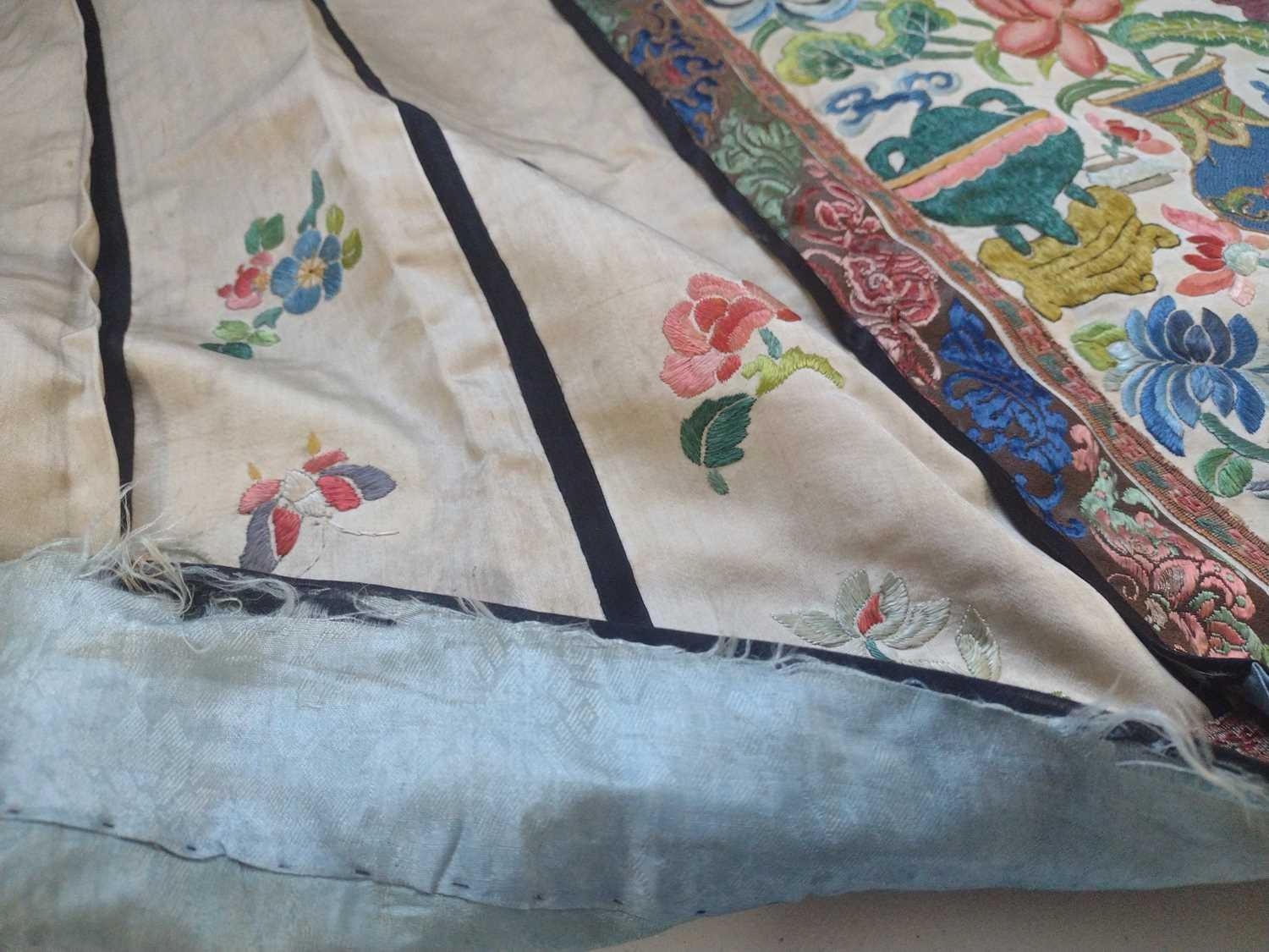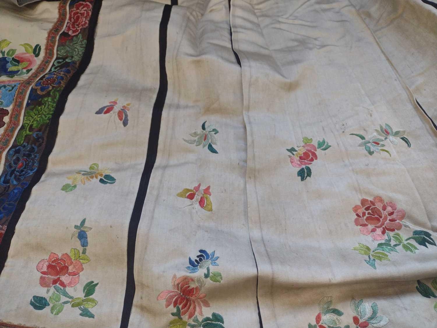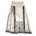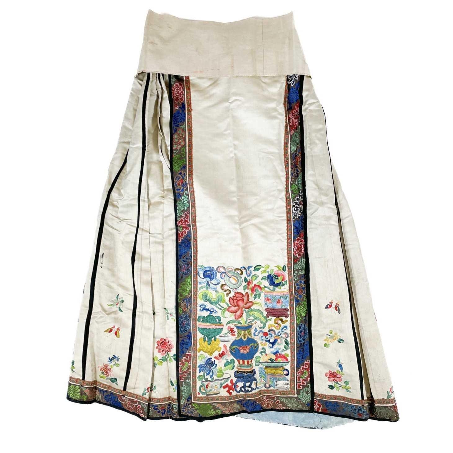 An attractive Chinese silk embroidered pleated skirt, 19th century. The cream ground with multiple floral sprays, the front and back panels embroidered with precious objects including a vase of flowers, length 84cm, waist circumference 102cm, base of skirt circumference 202cm. Signs that it has been used with age-related wear and fraying. Discolouration in places. The embroidery is in good condition. Please view extra images.