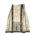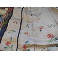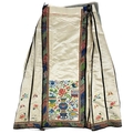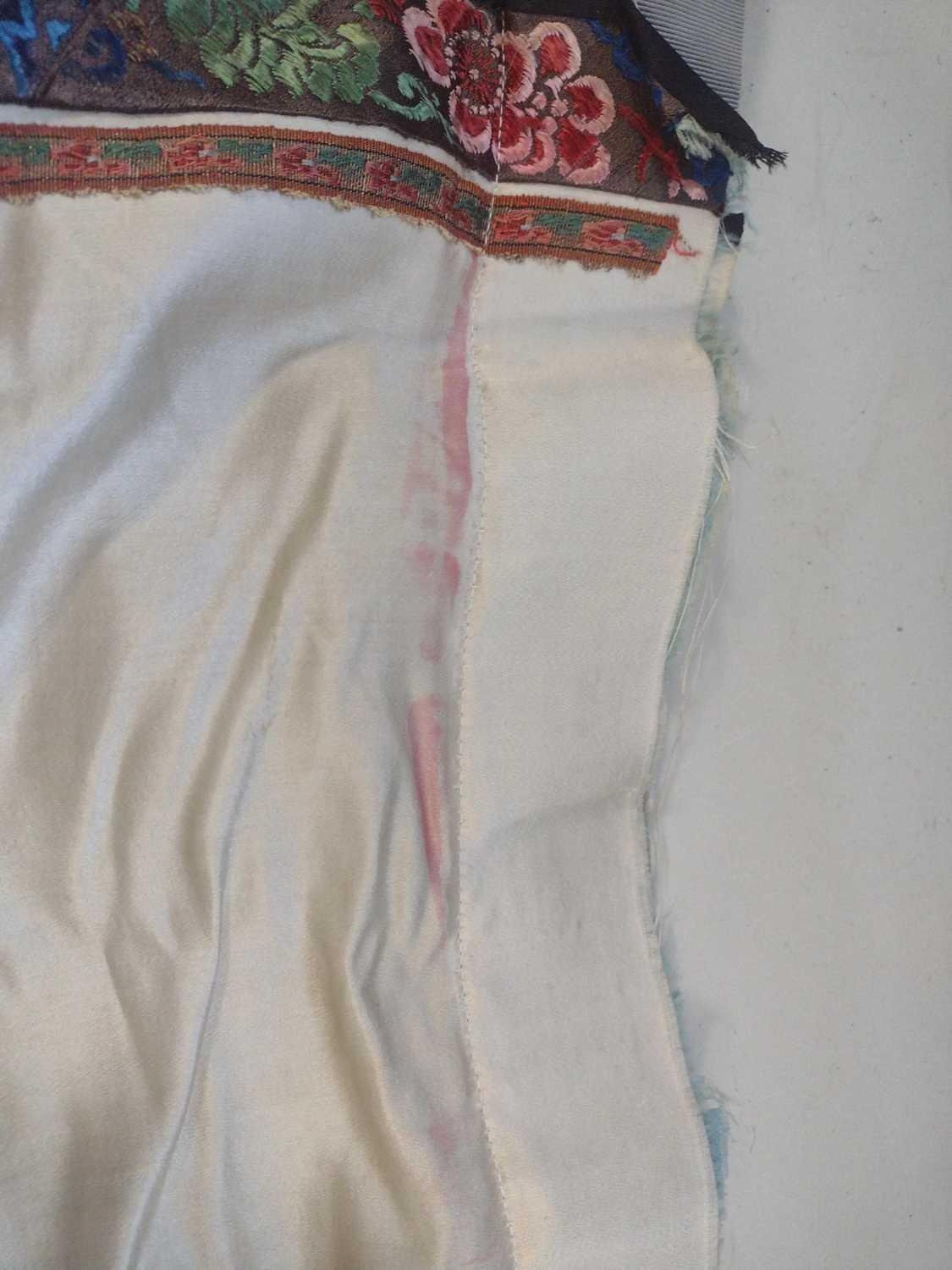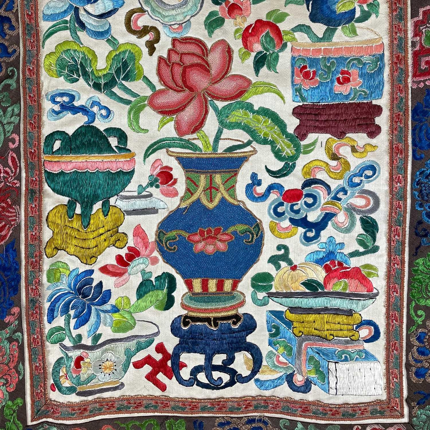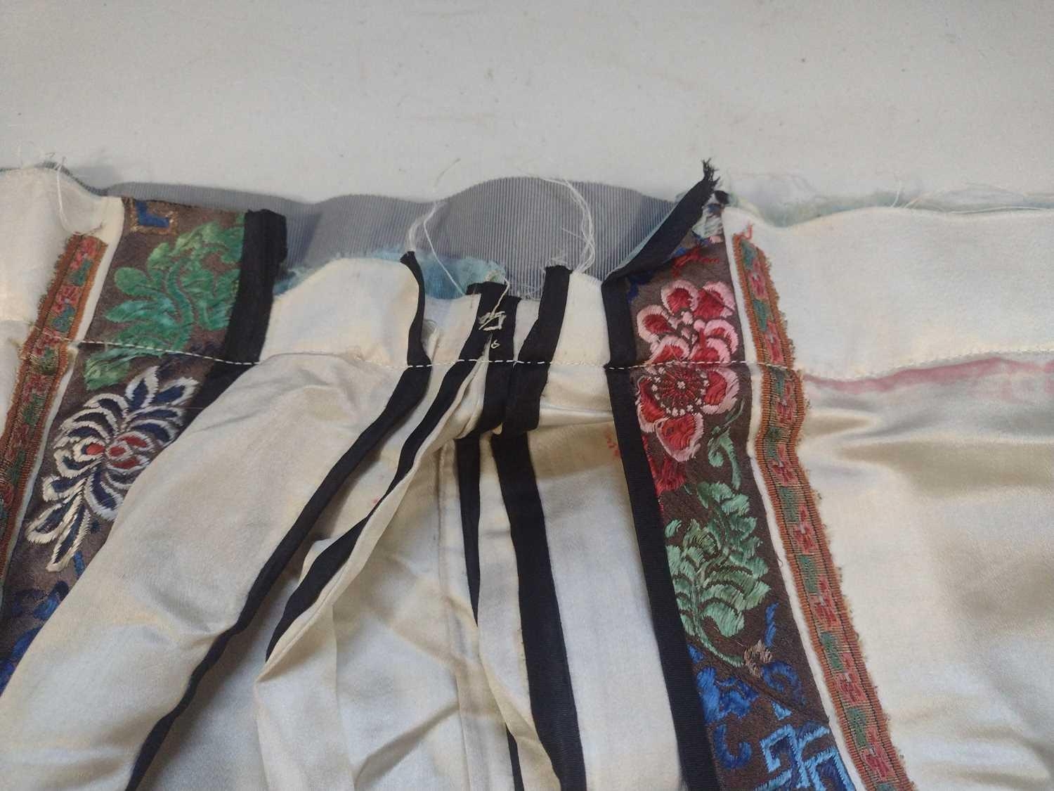 An attractive Chinese silk embroidered pleated skirt, 19th century. The cream ground with multiple floral sprays, the front and back panels embroidered with precious objects including a vase of flowers, length 84cm, waist circumference 102cm, base of skirt circumference 202cm. Signs that it has been used with age-related wear and fraying. Discolouration in places. The embroidery is in good condition. Please view extra images.