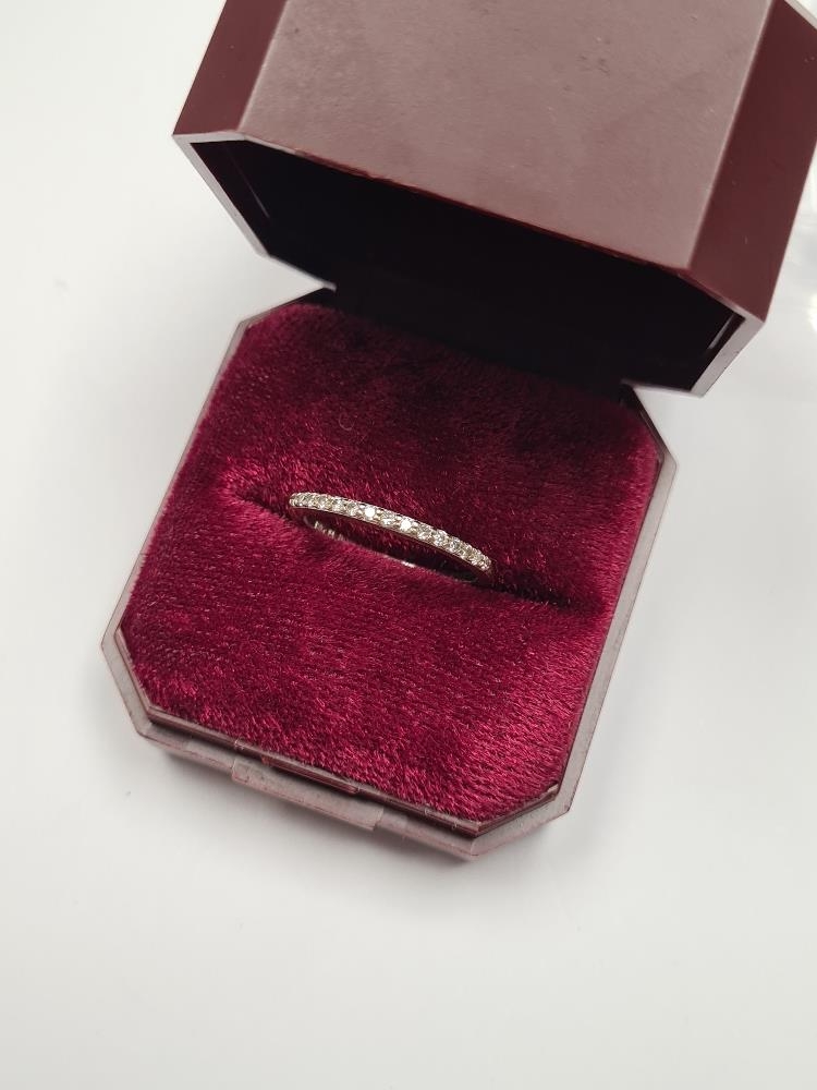 18ct white gold half eternity ring set, small brilliant round cut diamonds, marked 18ct, maker LLT HDS, size P, 1.9g