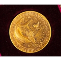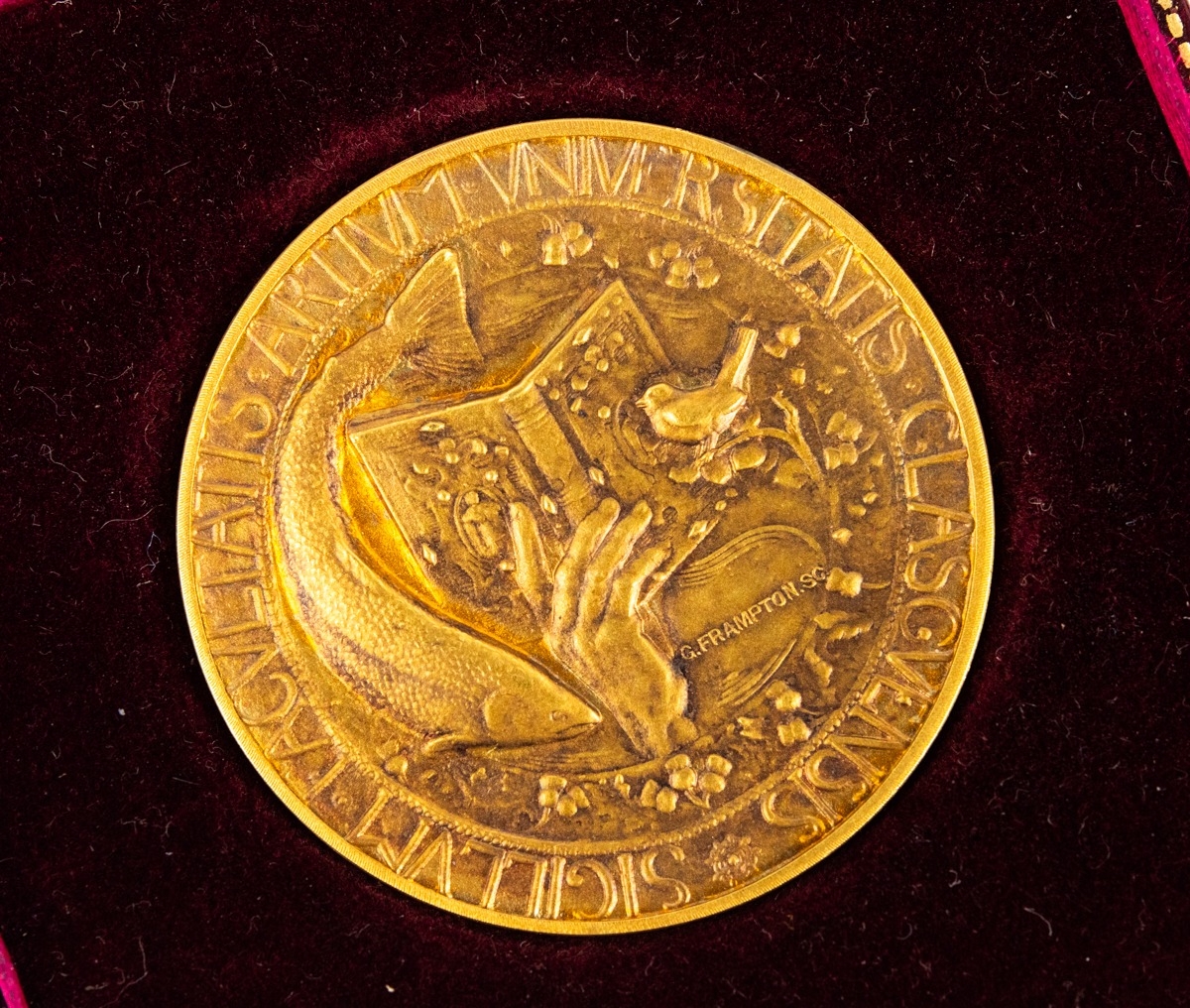 GOLD MEDALLION, THE SEAL OF THE FACULTY OF ARTS OF THE UNIVERSITY OF GLASGOW, (inscribed in Latin), sculpted by G. Frampton, dated on obverse 1925, and inscribed in memorium Logan DD David Logan 3.5cm diameter, 30.6gms, in associated John Pinches maroon morocco case, (tests 15ct)