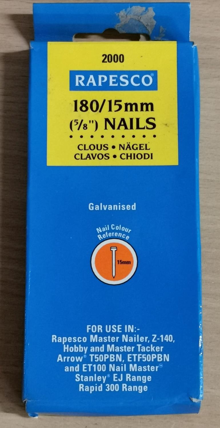 Unused box of Rapesco 180/15 mm galvanised nail gun nails