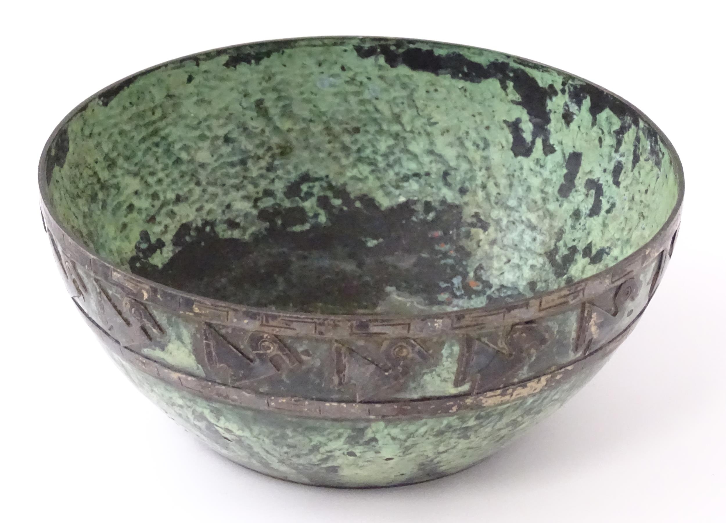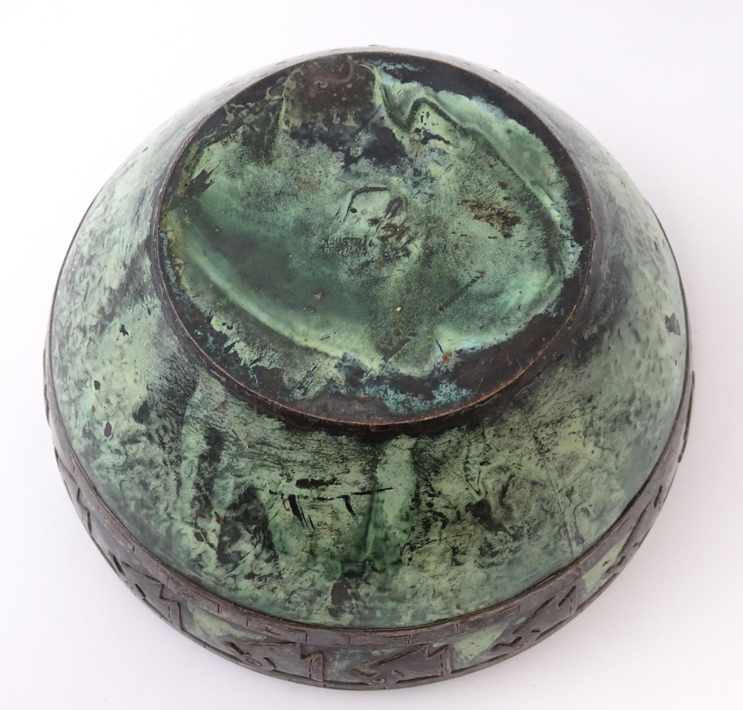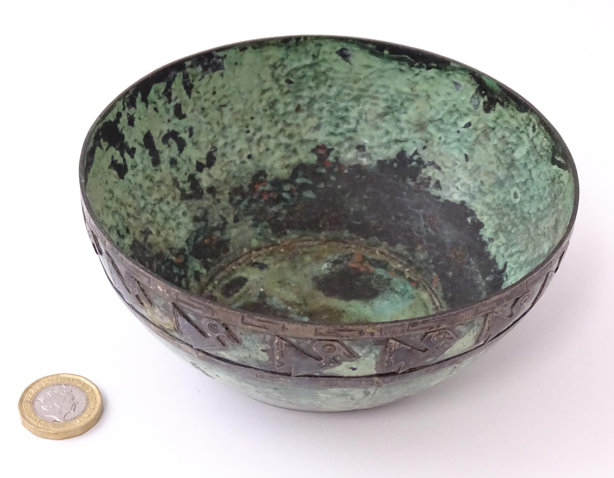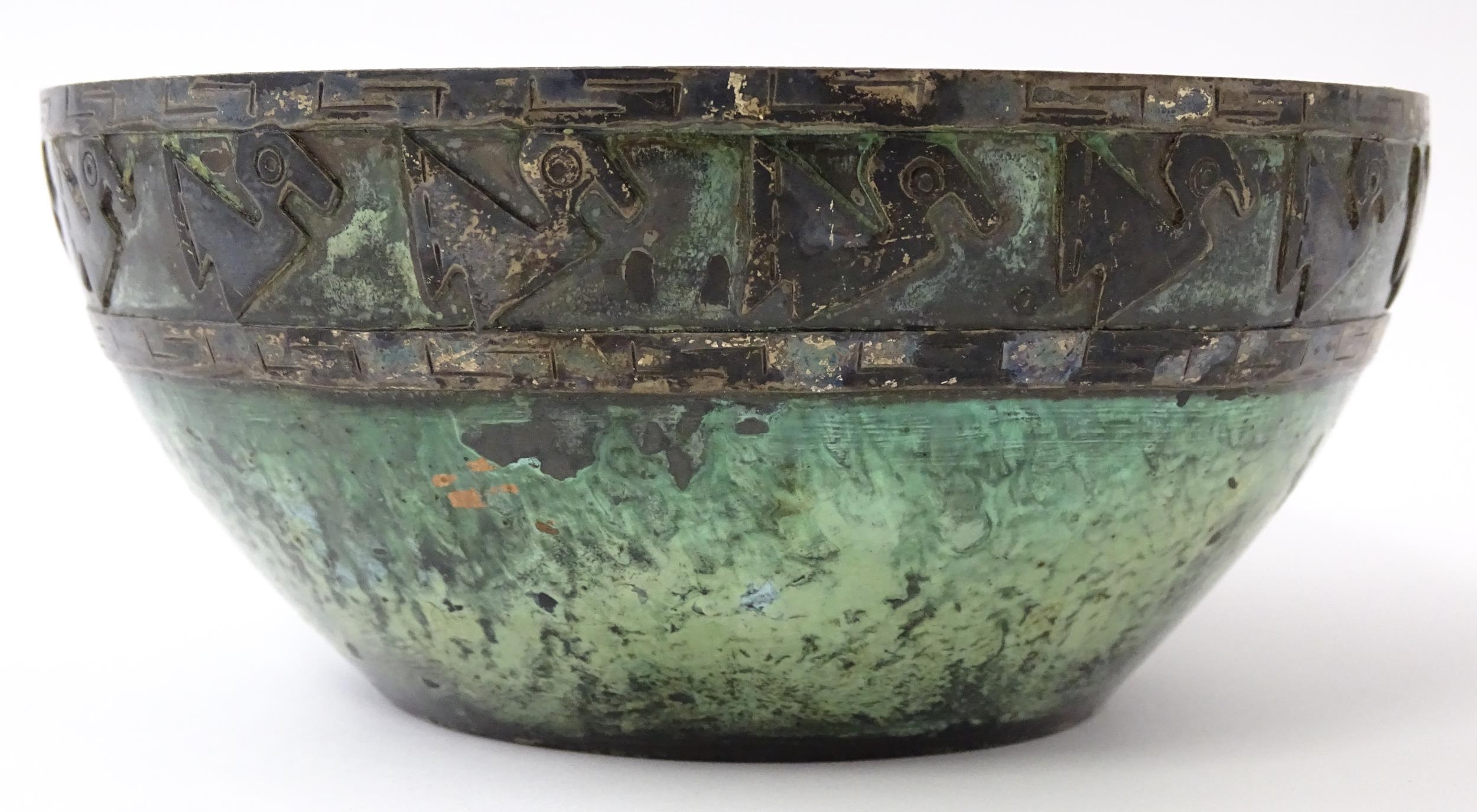 A Peruvian .925 silver bowl with banded stylised bird decoration and enamel detail. Marked Industria Peruana under. Approx. 2 1/2" high x 5 1/4" diameter