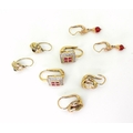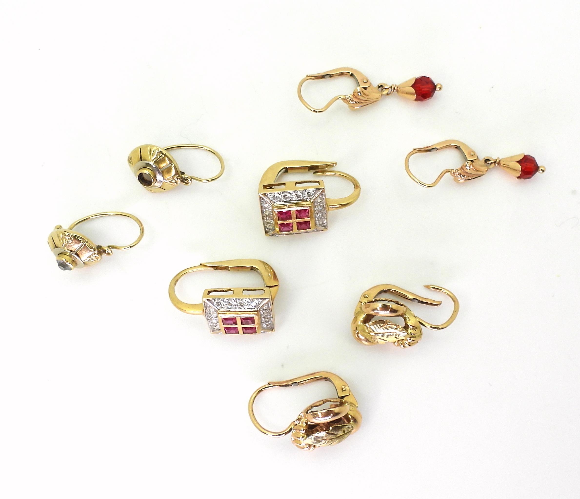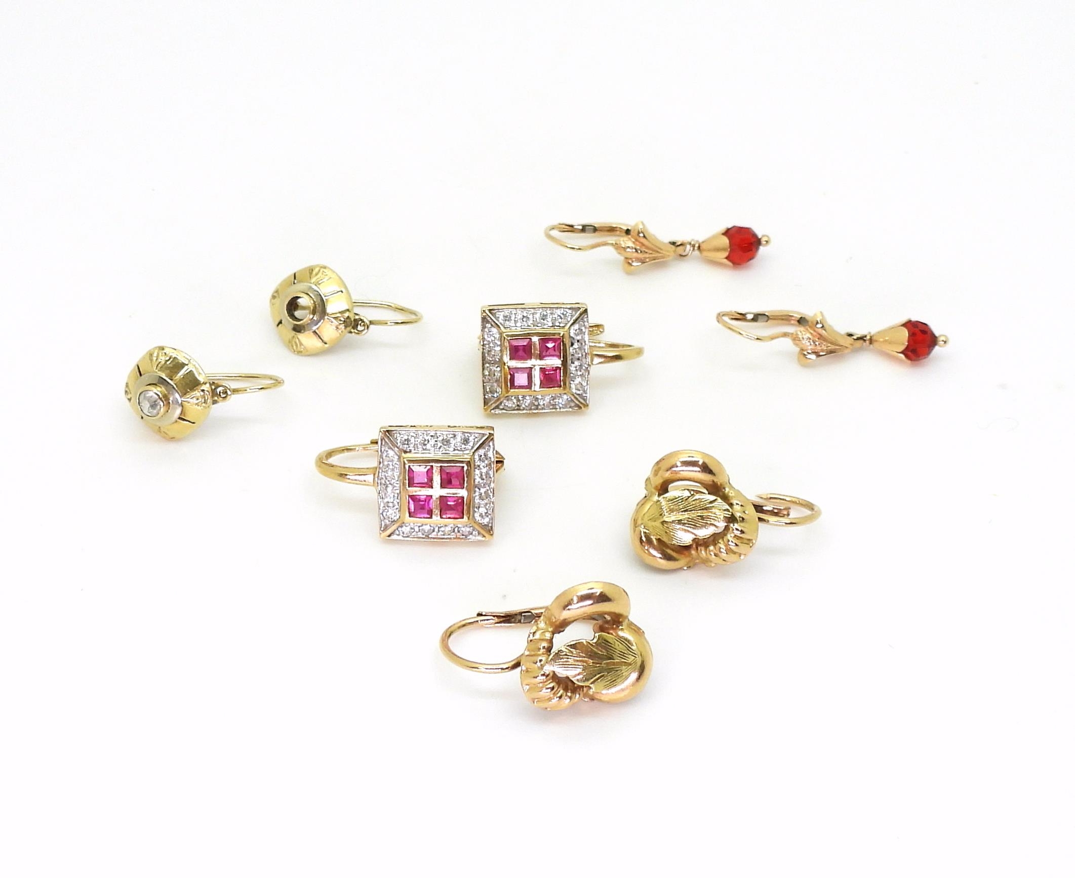 Four pairs of 18ct and bright yellow metal earrings three set with gems, weight all together 14.8gms