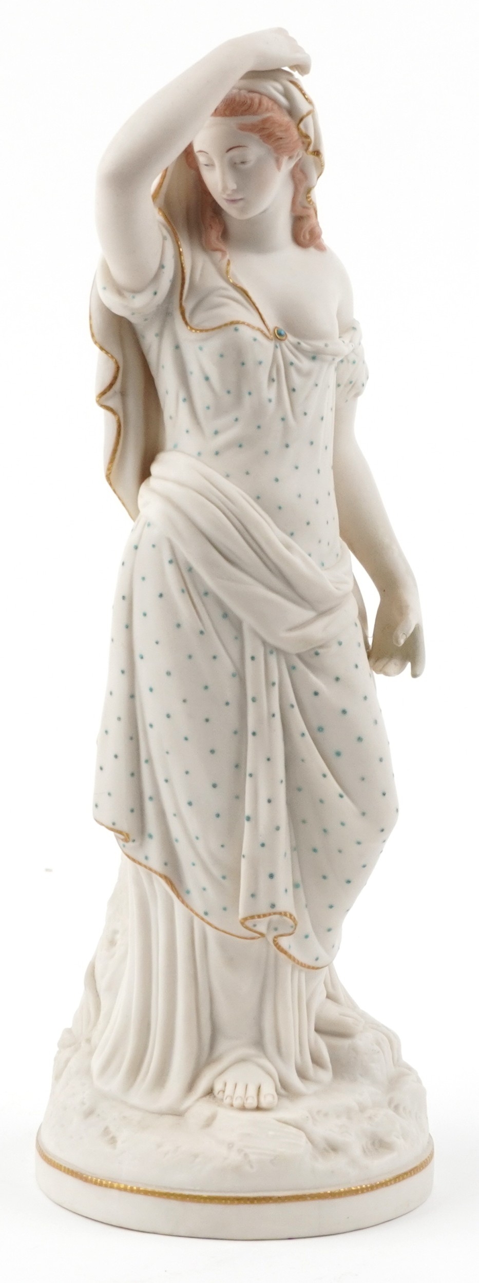 A late 19th century Parian Ware figure of Cassandra, with gilt decoration, 38cm high.