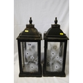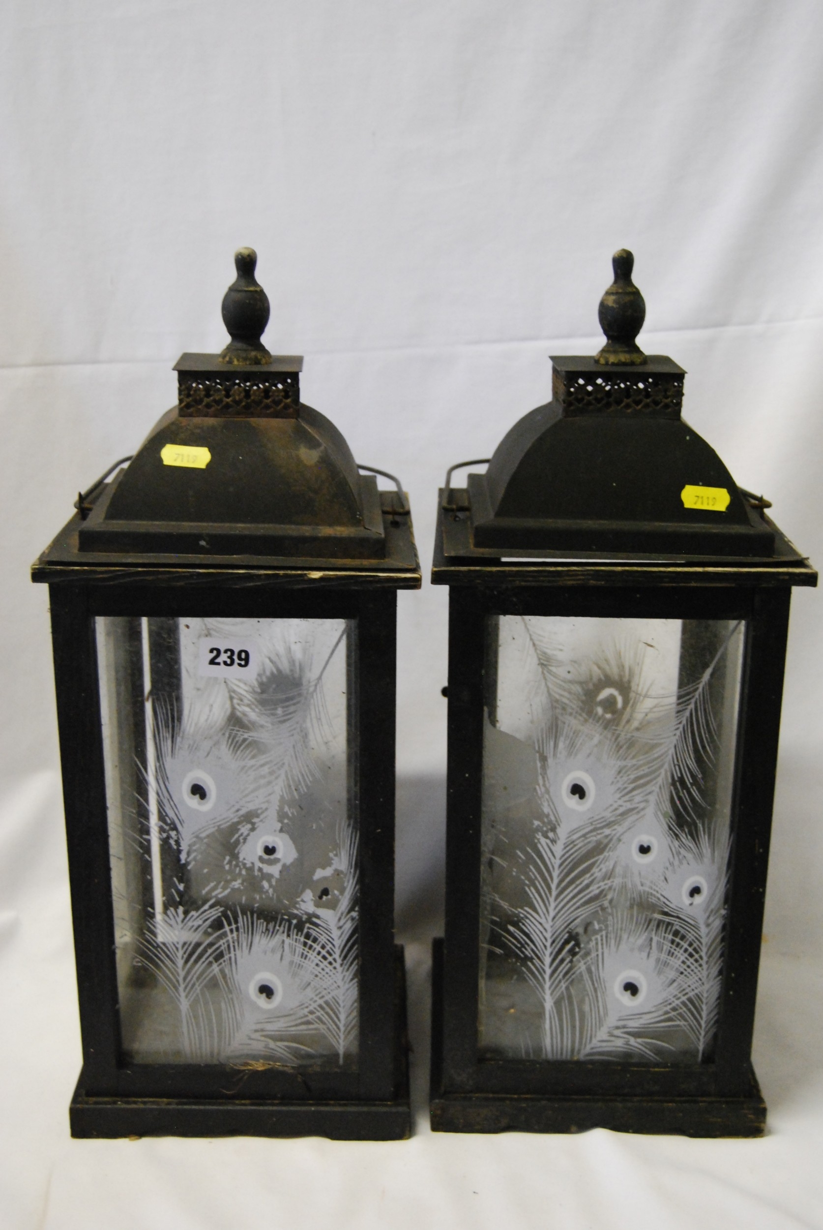 PAIR OF STAINED WOOD & METAL LANTERNS WITH PEACOCK FEATHER GLASS PANELS