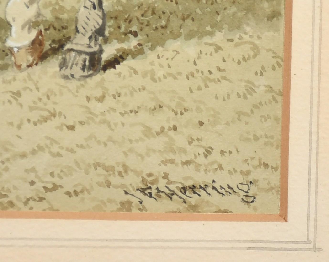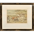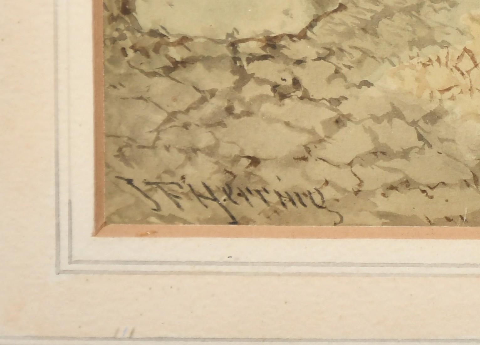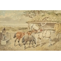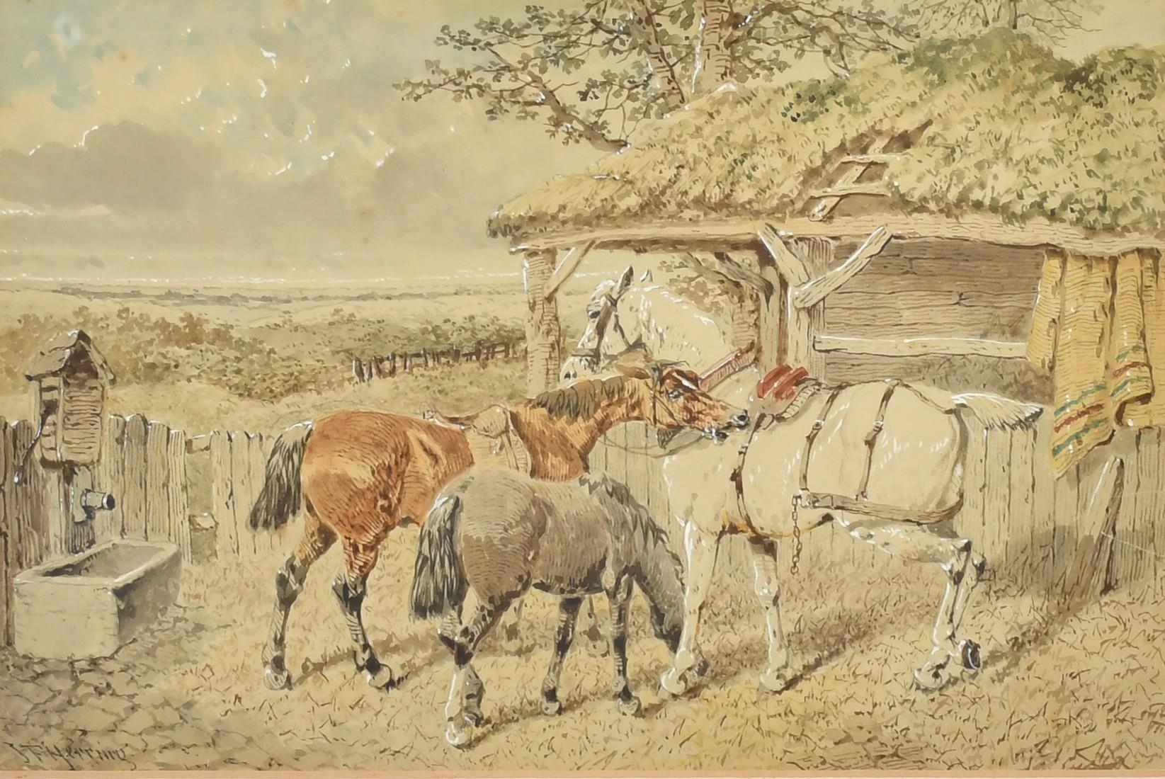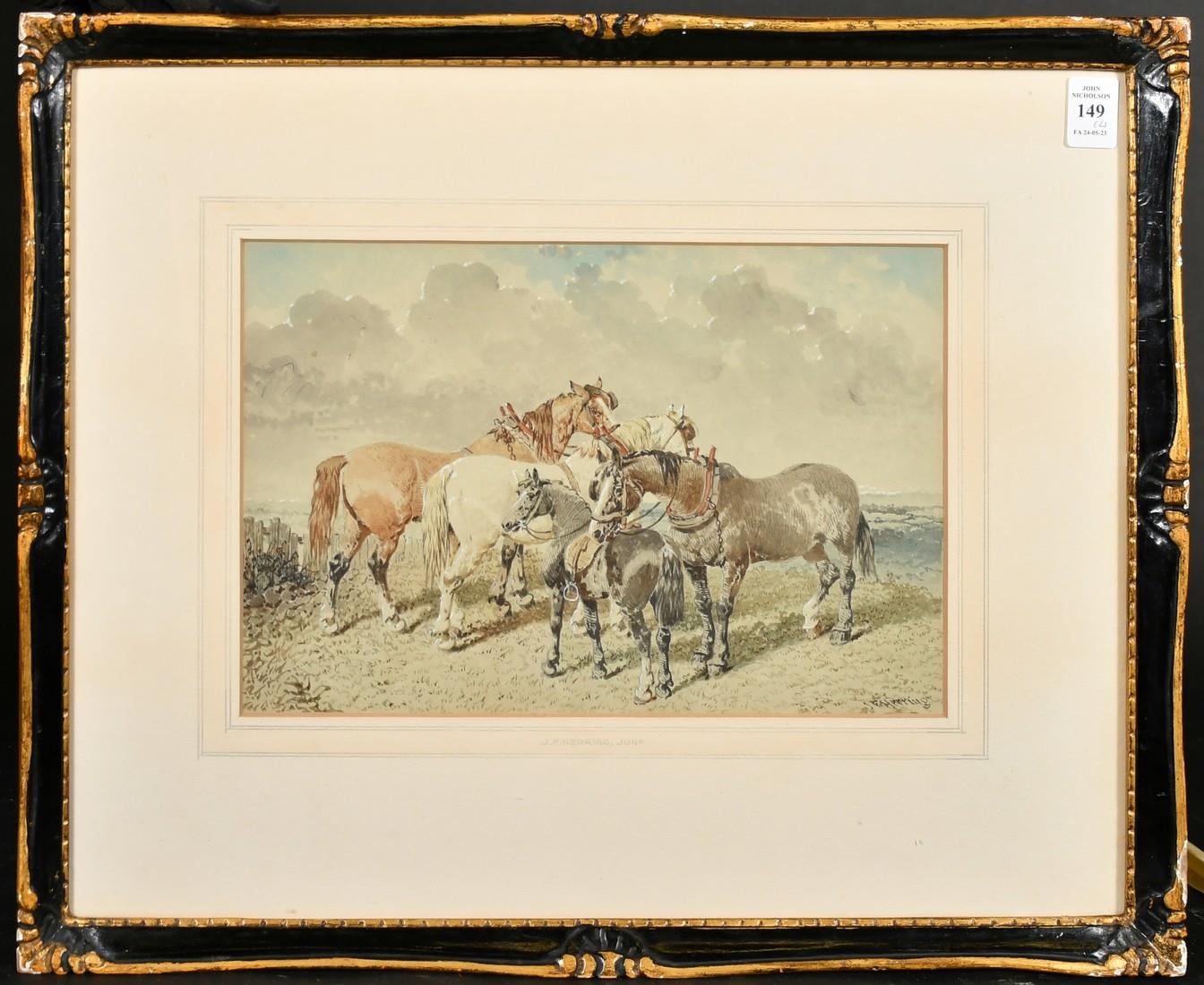 J. F. Herring Jnr (1815-1907), British, A group of four horses, three wearing yokes and one with a saddle, and another of three horses next to a stable, watercolours heightening with white, both signed, 8" x 12", (20x30.5cm) (2).