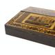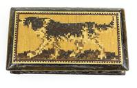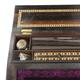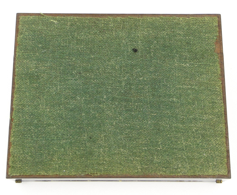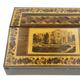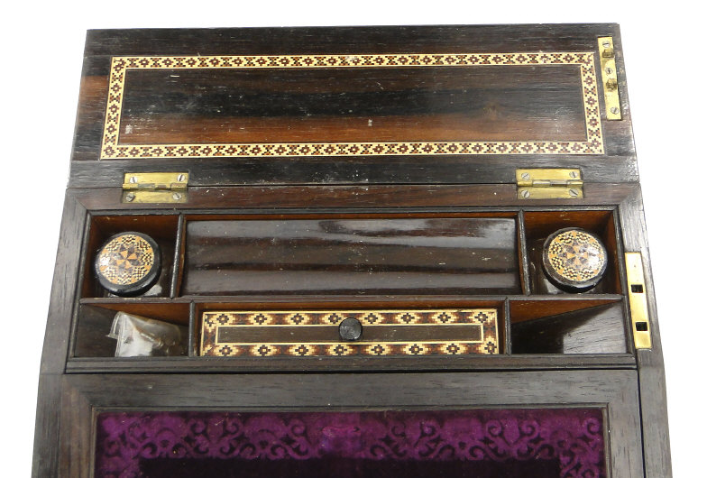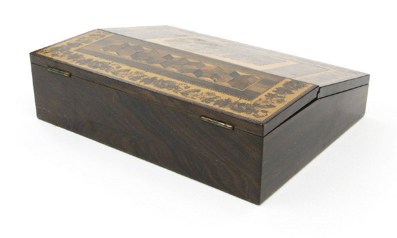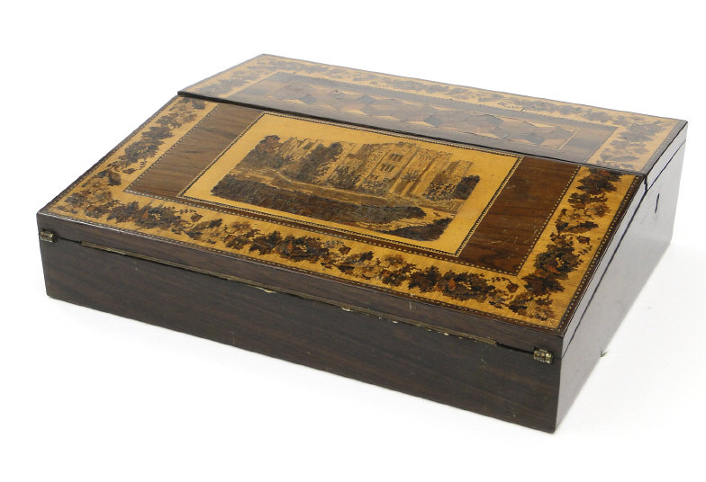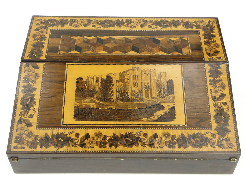 Tunbridgeware writing slope with tumbling cube, floral and castle and inlay to the exterior, the interior fitted with two Tunbridgeware lidded glass inkwells and sub divided compartments, 28cm in length