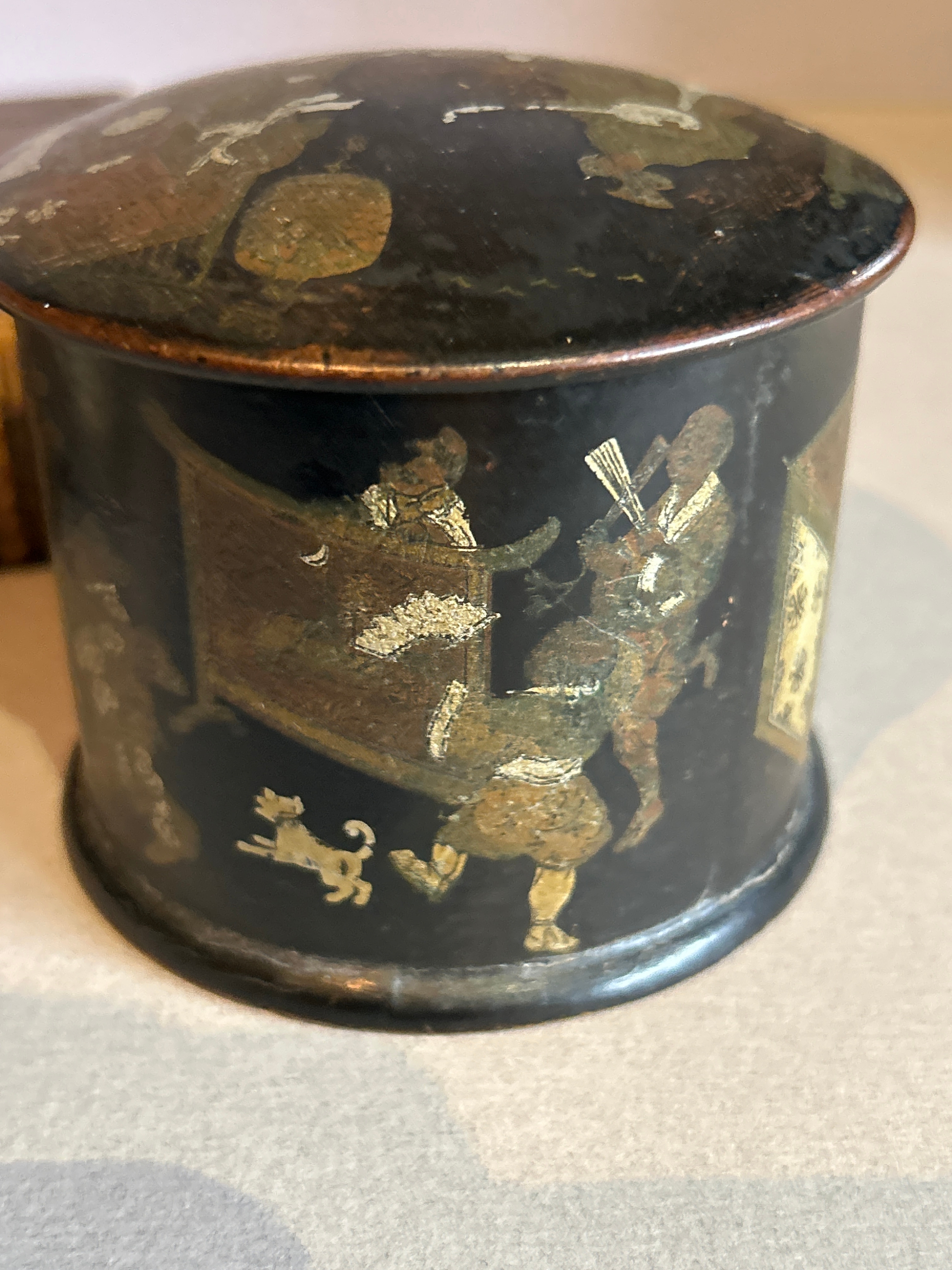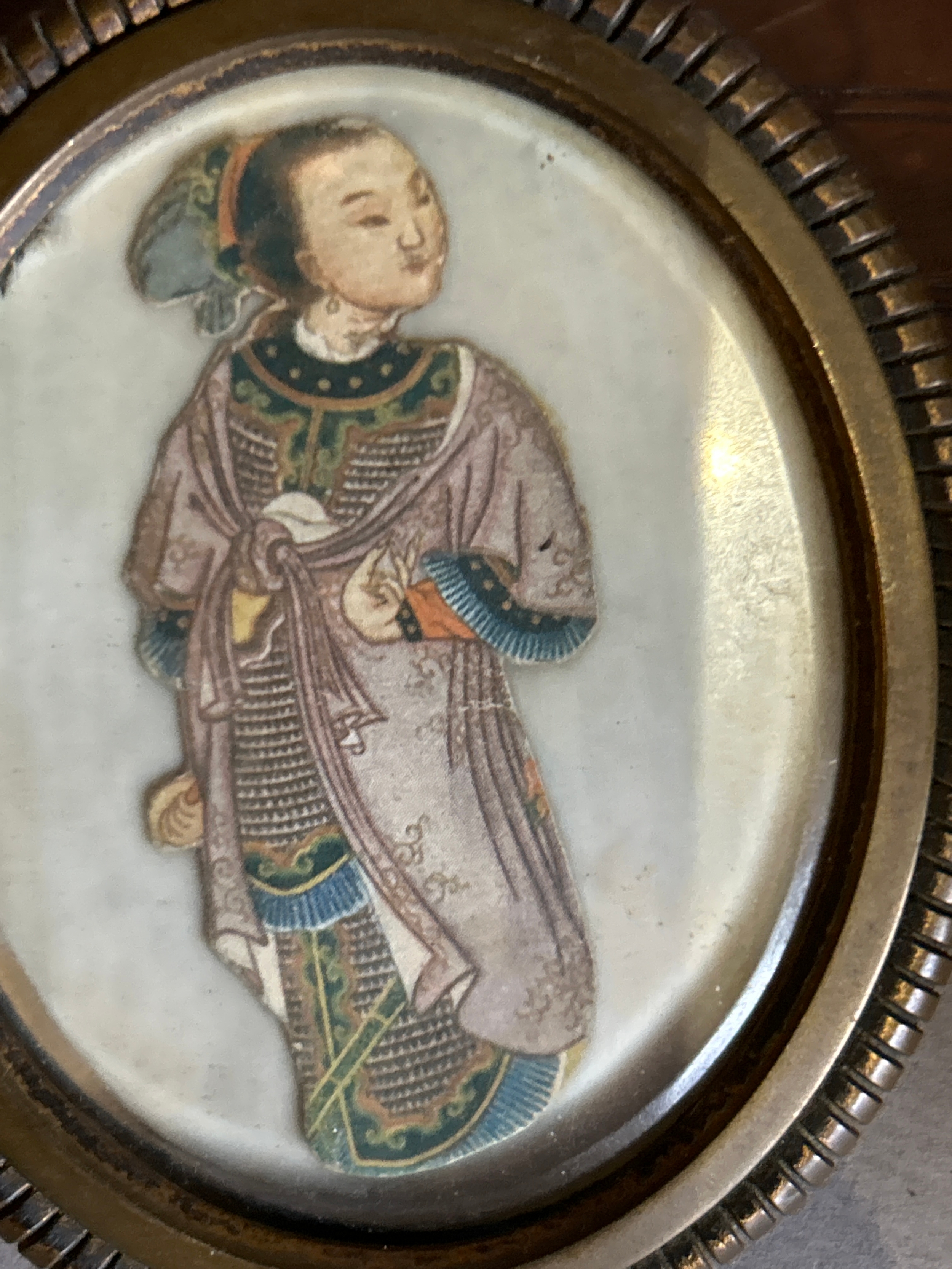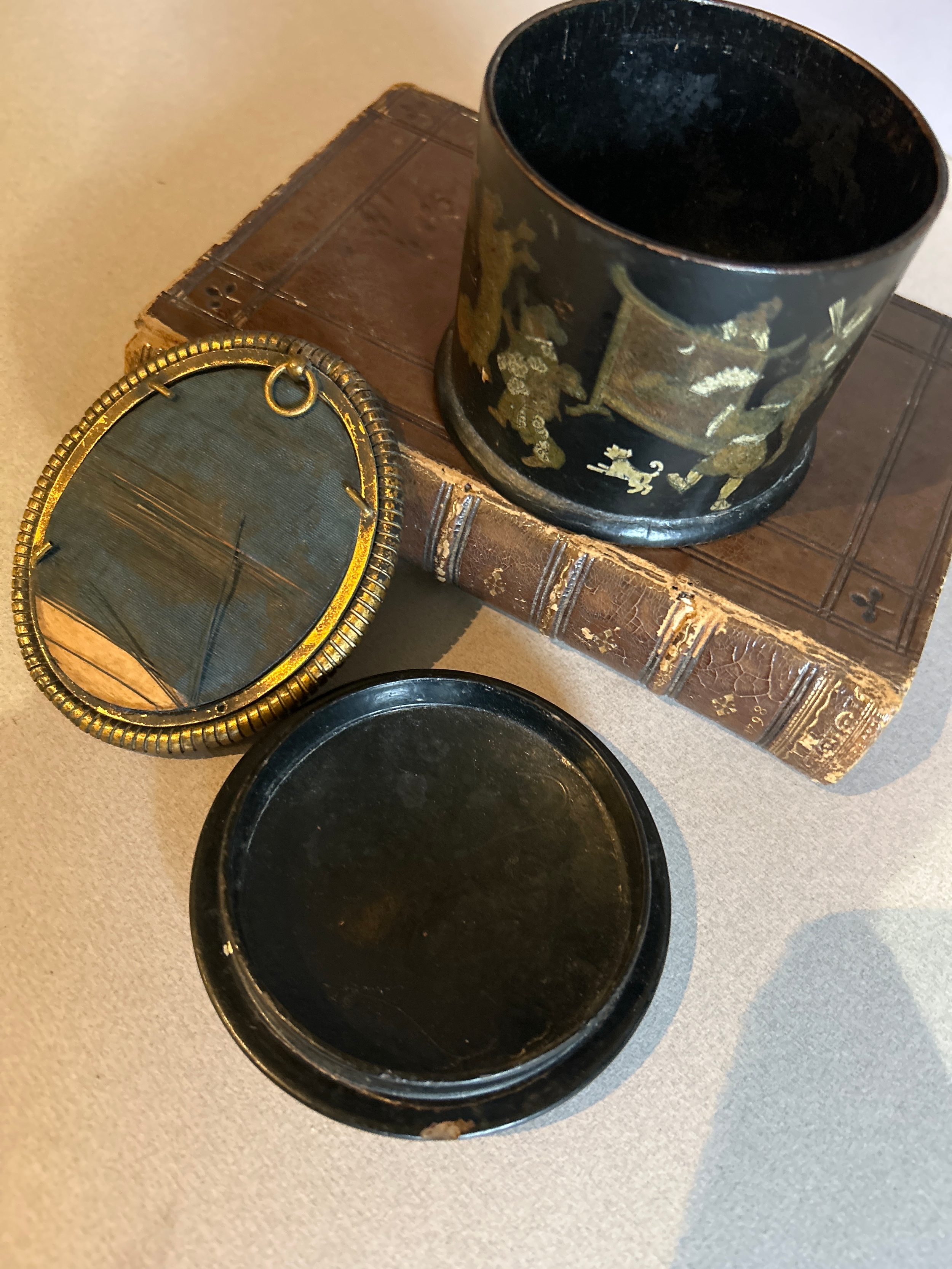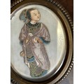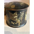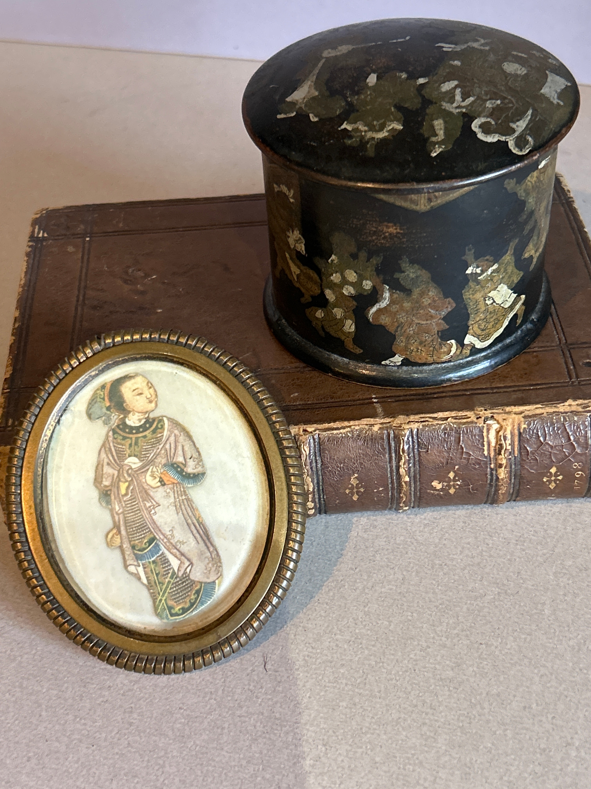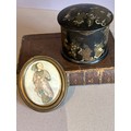 A 19th Century papier mache powder box decorated with a Chinoiserie design and also an antique ormolu frame containing a print of a Chinese woman in traditional dress. Frame 9cm