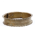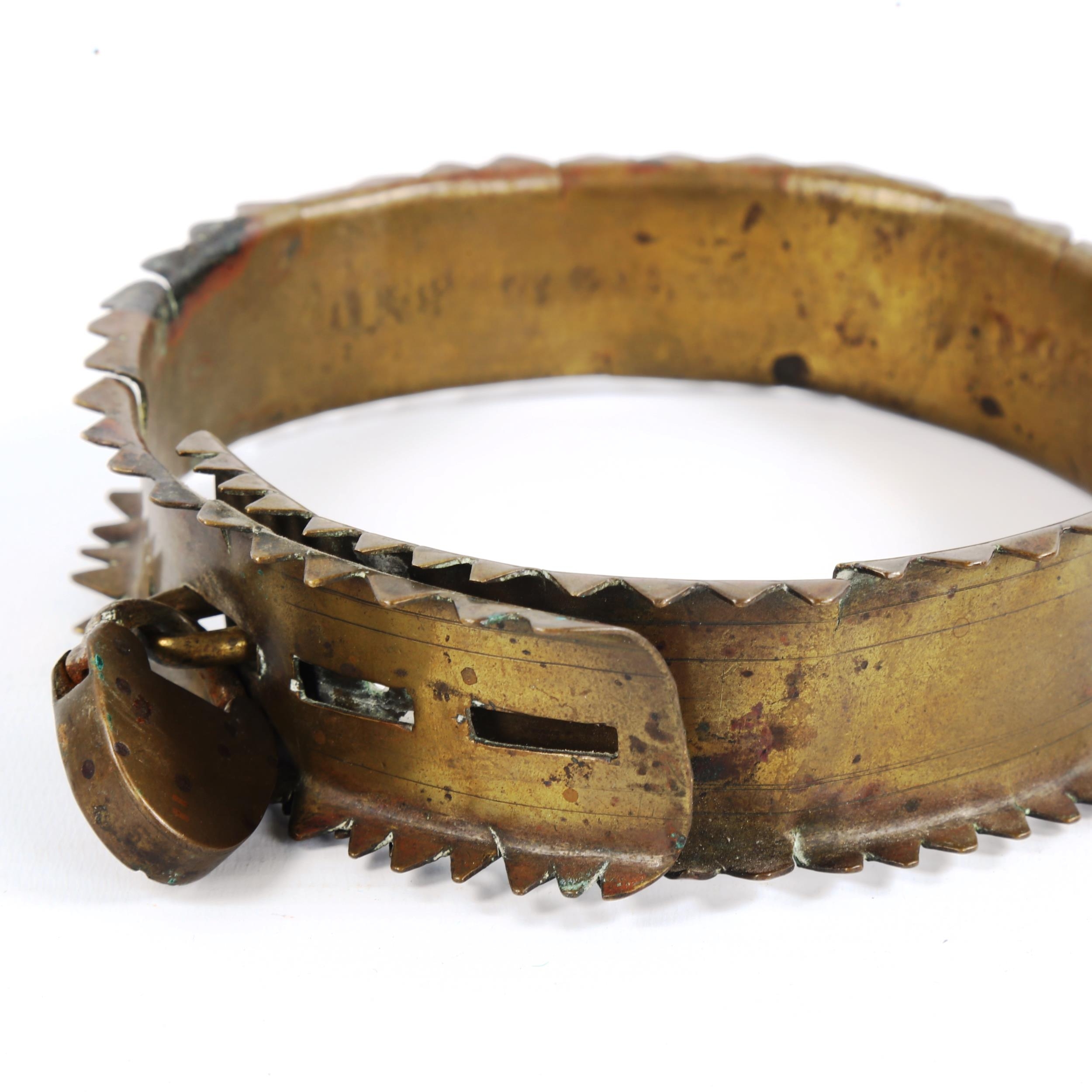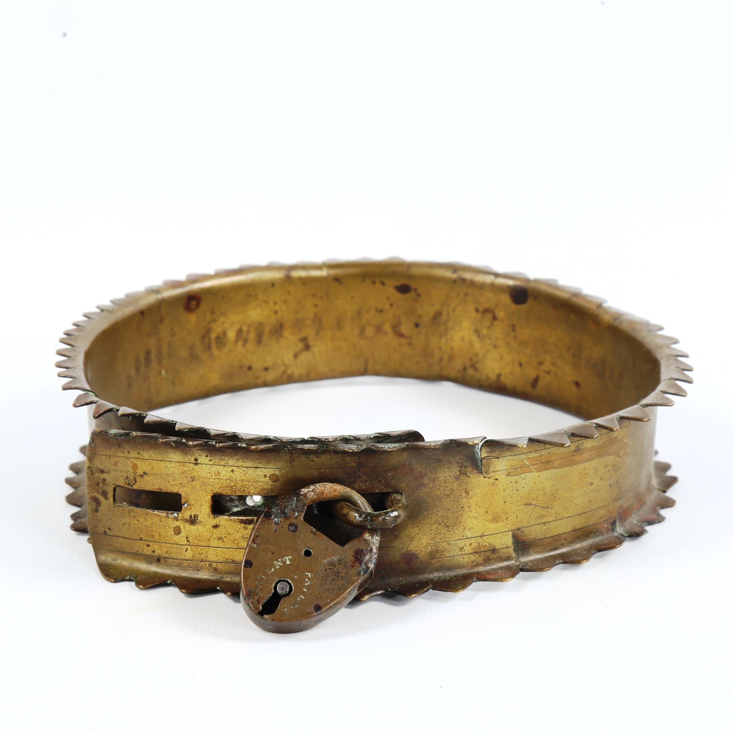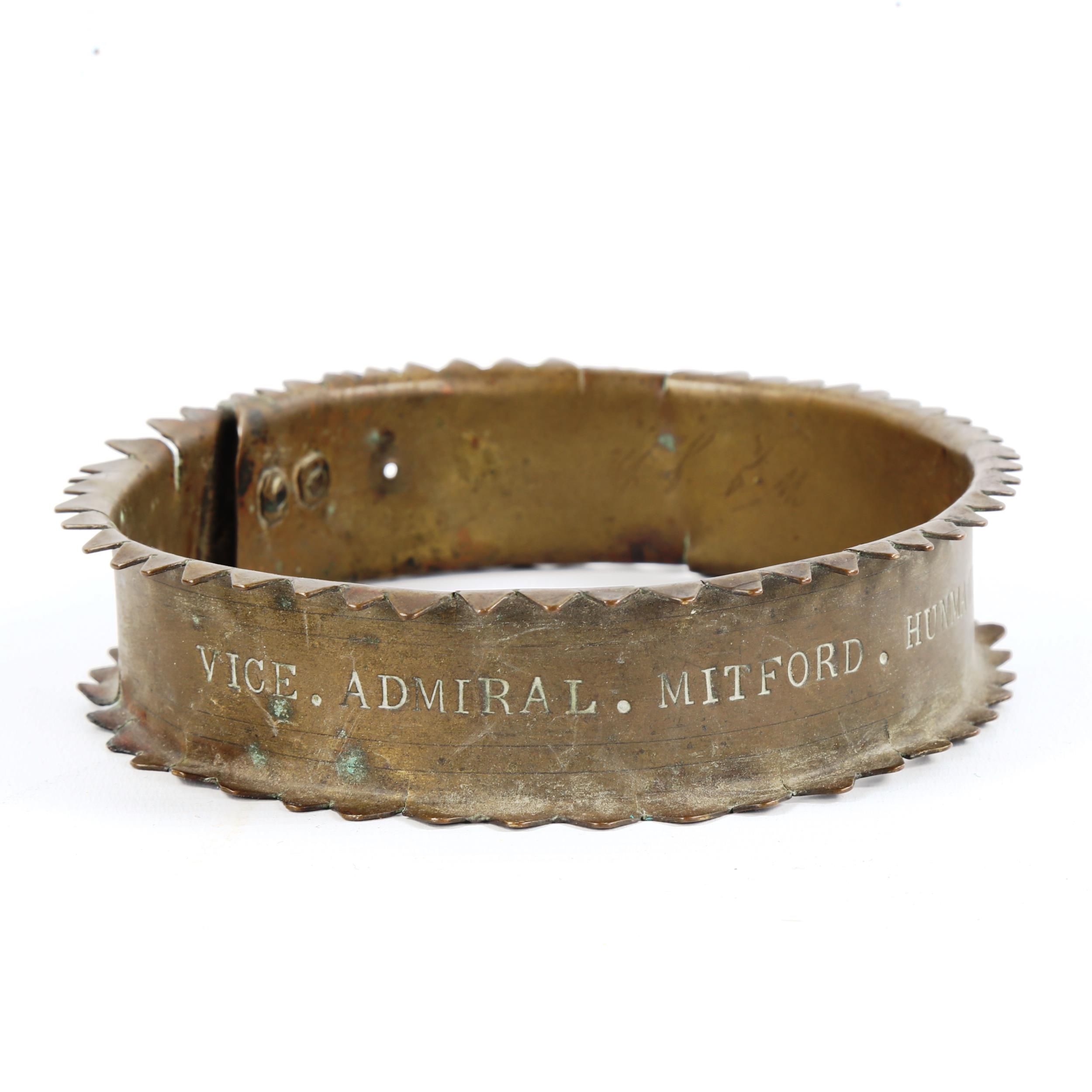 A 19th century brass dog collar with padlock clasp, inscribed Vice Admiral Mitford Hunmanby 1860, diameter 15cm, height 3.5cm